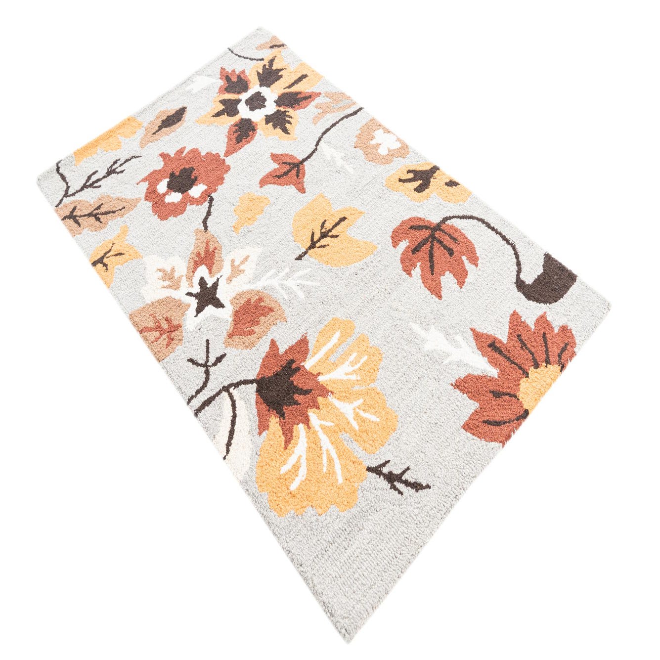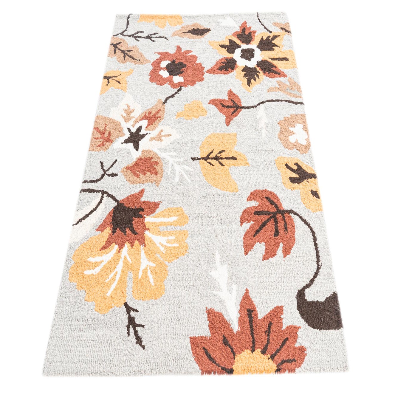 A rectangular 3x5 gray modern area rug featuring a vibrant floral pattern with large orange, brown, and cream flowers and leaves.