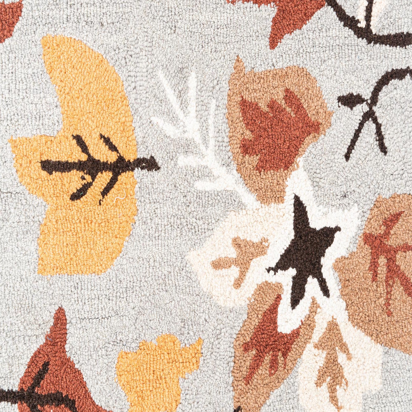 Hand-tufted of wool and cotton, this rug has a soft, springy pile that feels warm underfoot while the cotton foundation keeps the surface tidy and stable. A light gray field provides a calm backdrop for an organic botanical pattern of stylized blooms and leaves in terracotta, orange, brown and ivory, with black stems and accents that add crisp definition. The layered color blocking and varied shapes create visual depth and a tactile quality you can both see and feel.