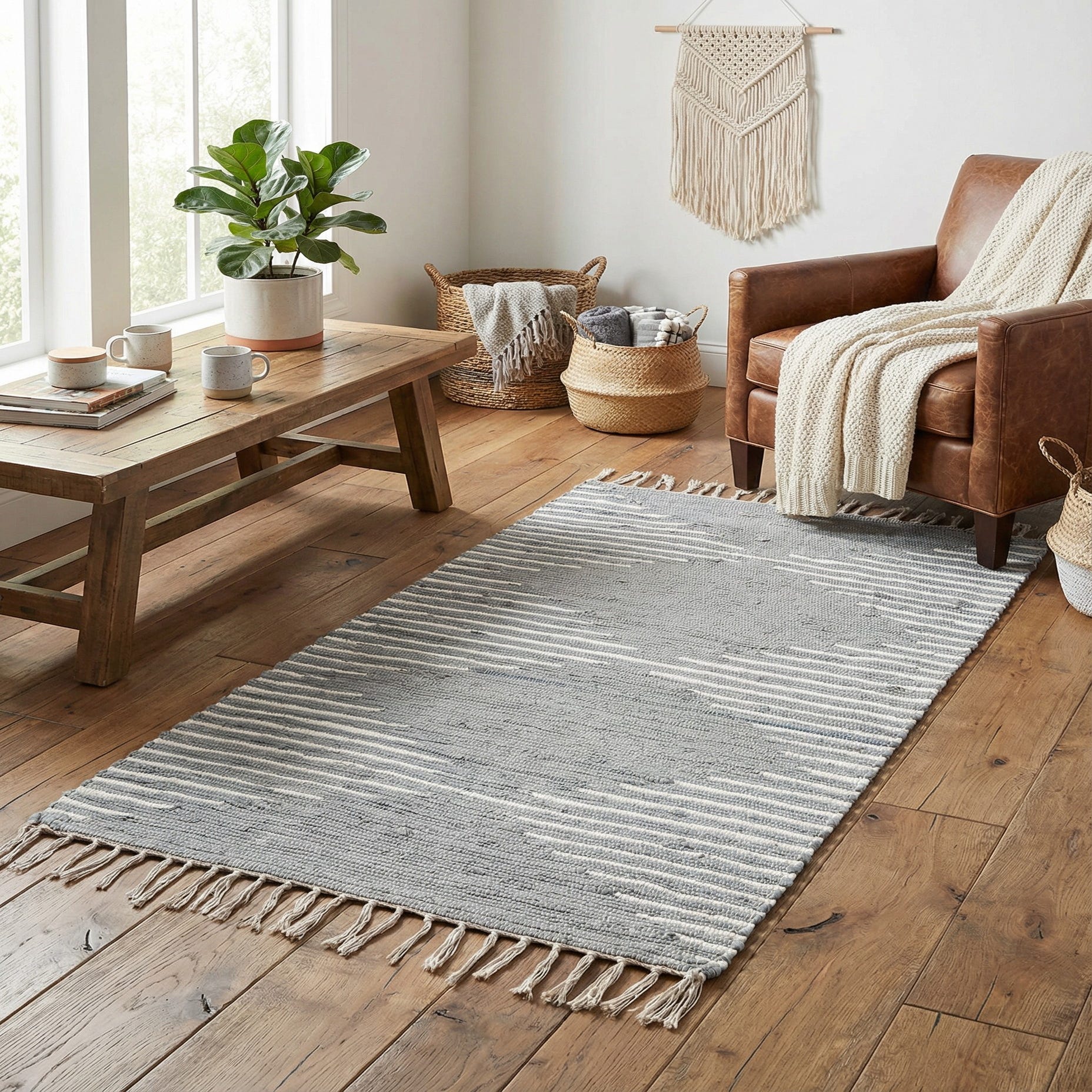 Hand-woven from 100% cotton, this flatweave rug has a soft, tactile feel with a subtly slubby texture that you can notice underfoot. The light gray background serves as a calm base, while irregular ivory slubs form horizontal banding that adds visual movement without a busy look. Natural cotton fringe on the short ends highlights the rug’s crafted character and keeps the overall profile low and casual.