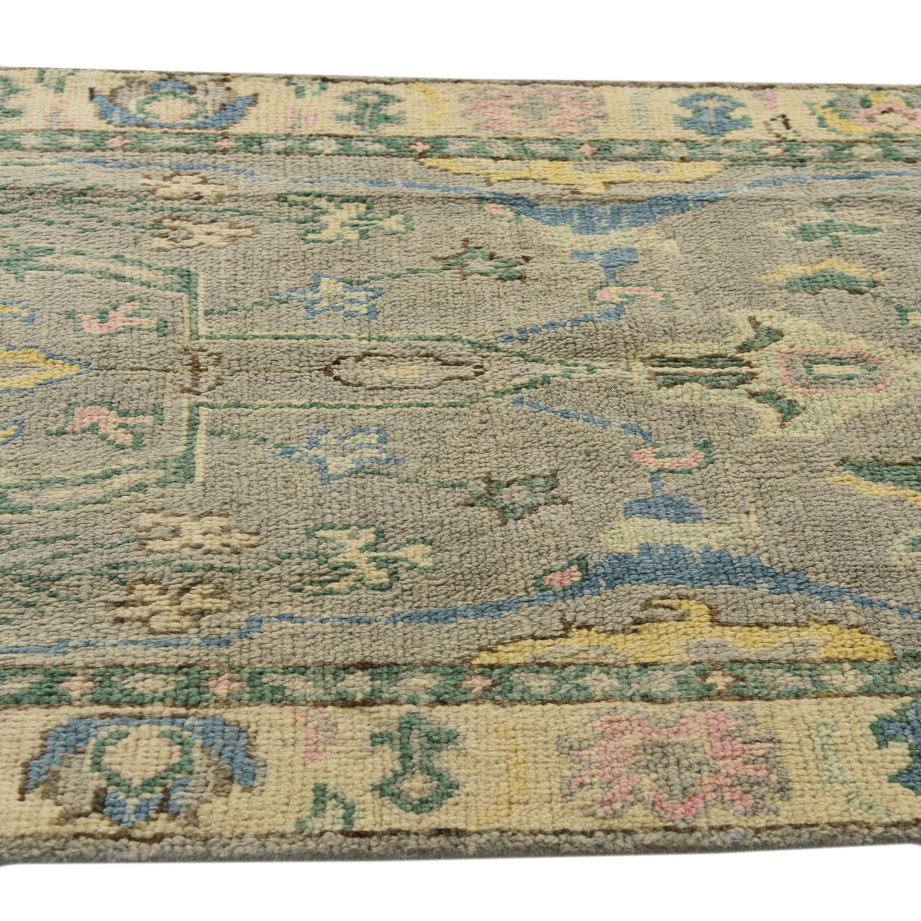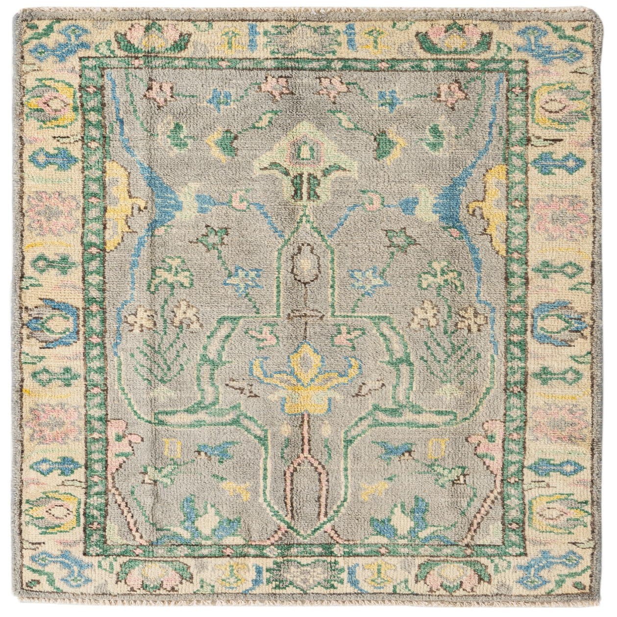 A 3x5 rectangular gray wool rug with a colorful modern floral and geometric pattern and a light border.