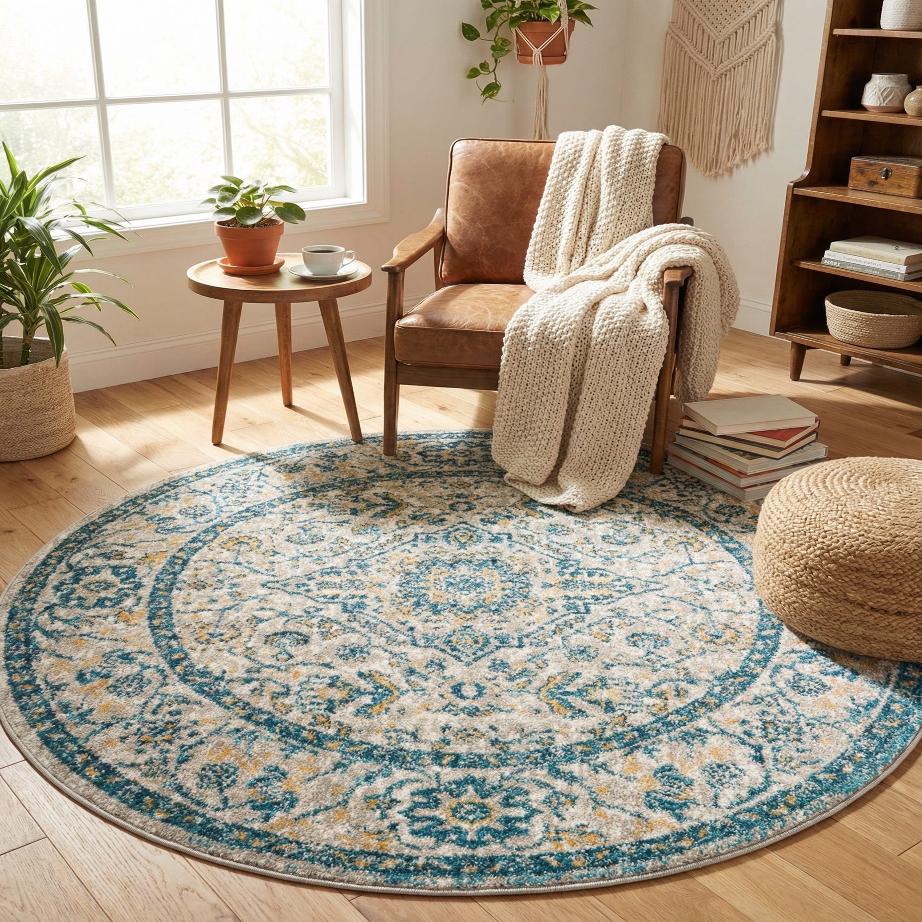 A 4' round gray and teal Bohemian rug with a distressed medallion pattern and yellow accents.