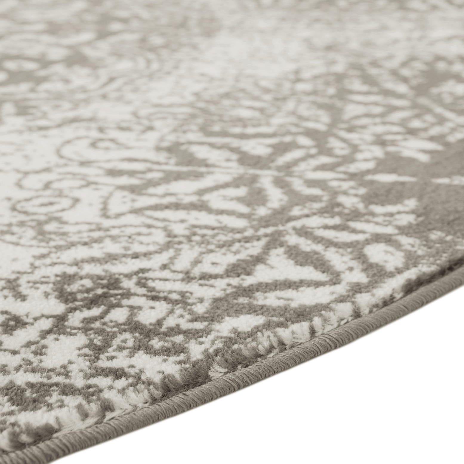 A soft, low-contrast medallion sits at the center of this round rug, rendered in ivory against a light gray background. The design combines classic ornamental motifs with a gently distressed finish for a lived-in, vintage effect. Made from 100% polypropylene, the surface has a low, even pile that feels smooth underfoot while clearly defining the faded medallion and surrounding patterns.