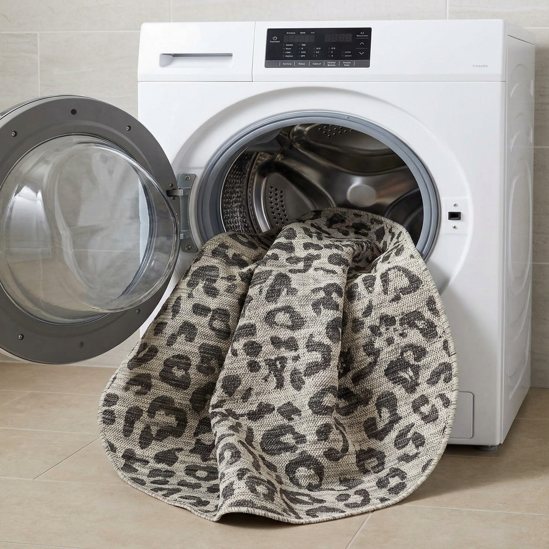 A light gray ground sets a calm foundation for a bold gray leopard pattern that repeats across the surface in organic, irregular spots. Machine-made from 100% polypropylene, the rug has a low-profile, flat weave with a subtle ribbed texture you can feel underfoot—smooth to the touch but with enough structure to hold the printed motif. The restrained two-tone palette keeps the animal print modern and versatile rather than loud.