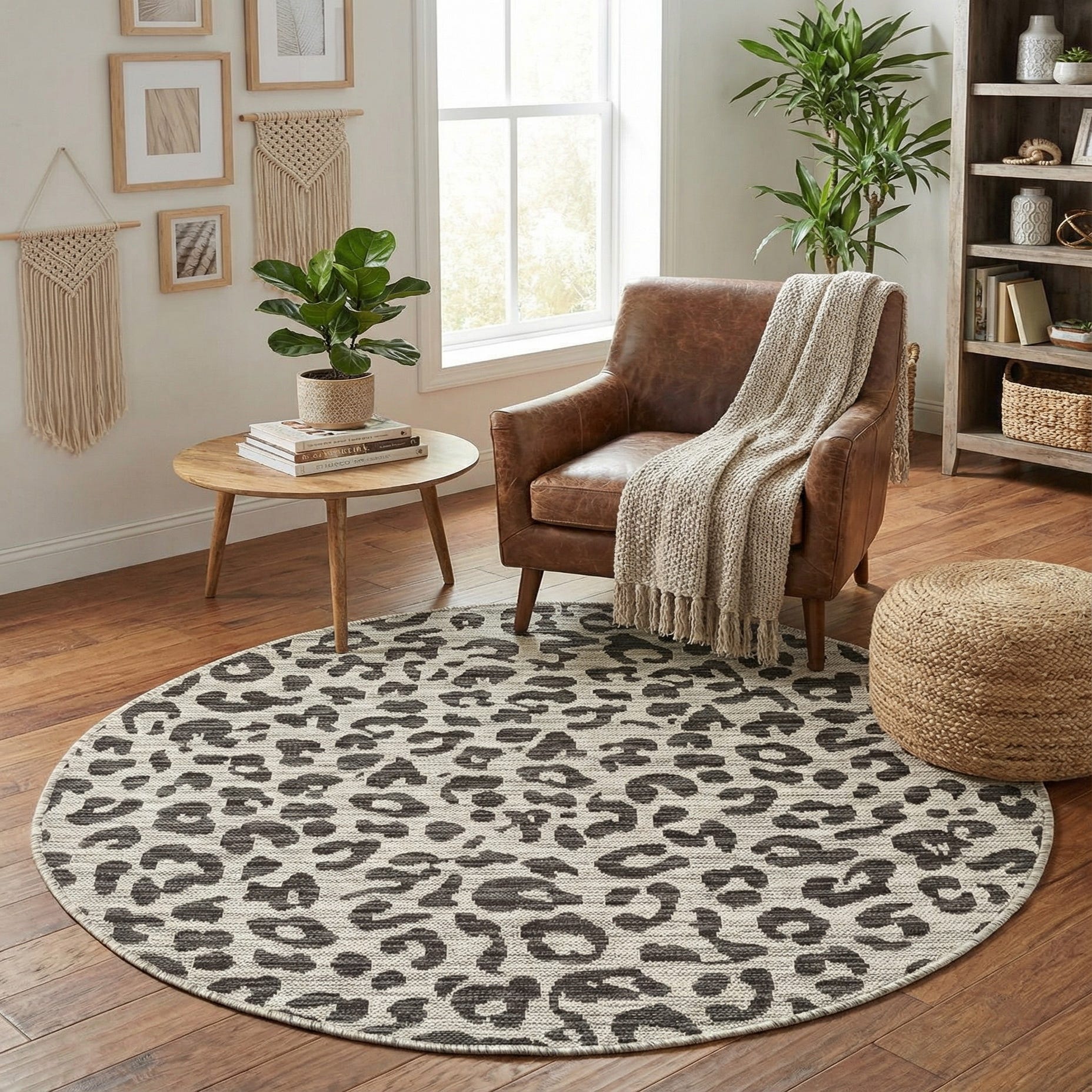 A 4' round gray leopard print rug with a flatweave texture, suitable for modern indoor or outdoor spaces.