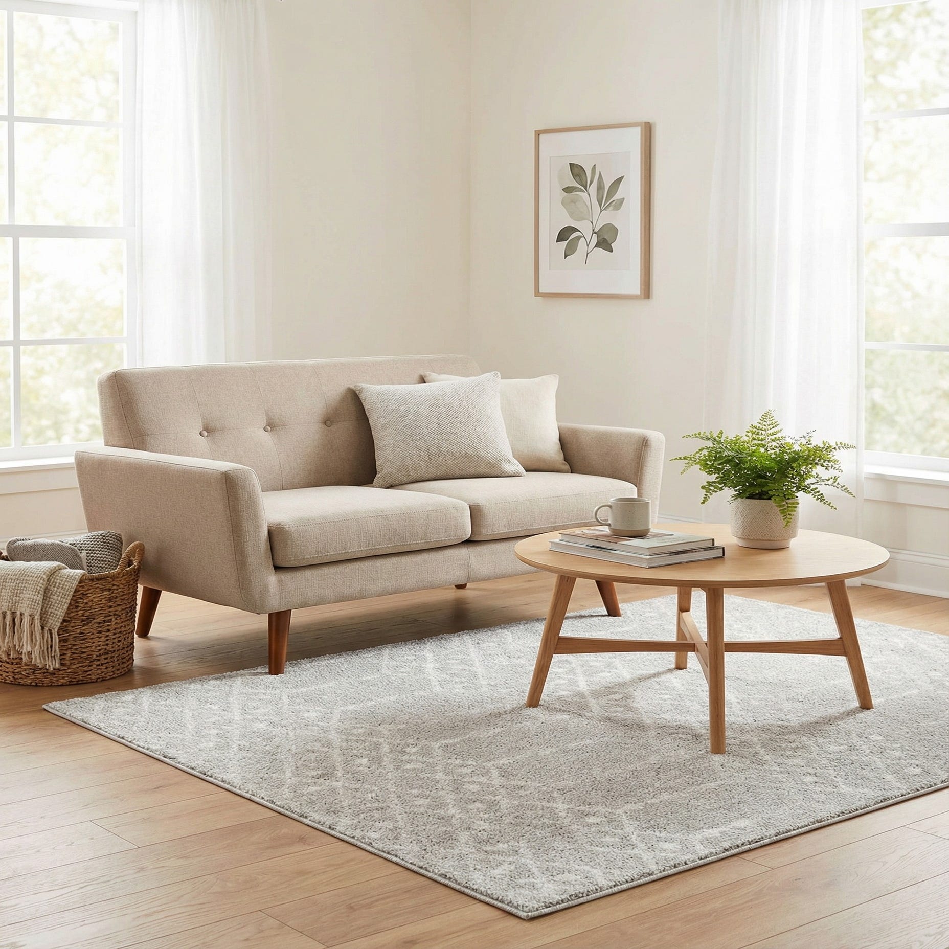 Machine made from 100% polypropylene, the rug delivers consistent pattern clarity and a plush feel. Its neutral light gray and ivory palette pairs easily with modern, Scandinavian, or transitional interiors — try it beneath a low-profile sofa and coffee table in a living room, layered at the foot of a bed in a serene bedroom, or anchoring a reading nook or home office. It complements light woods, linen upholstery, and matte metal accents for a relaxed, cohesive look.