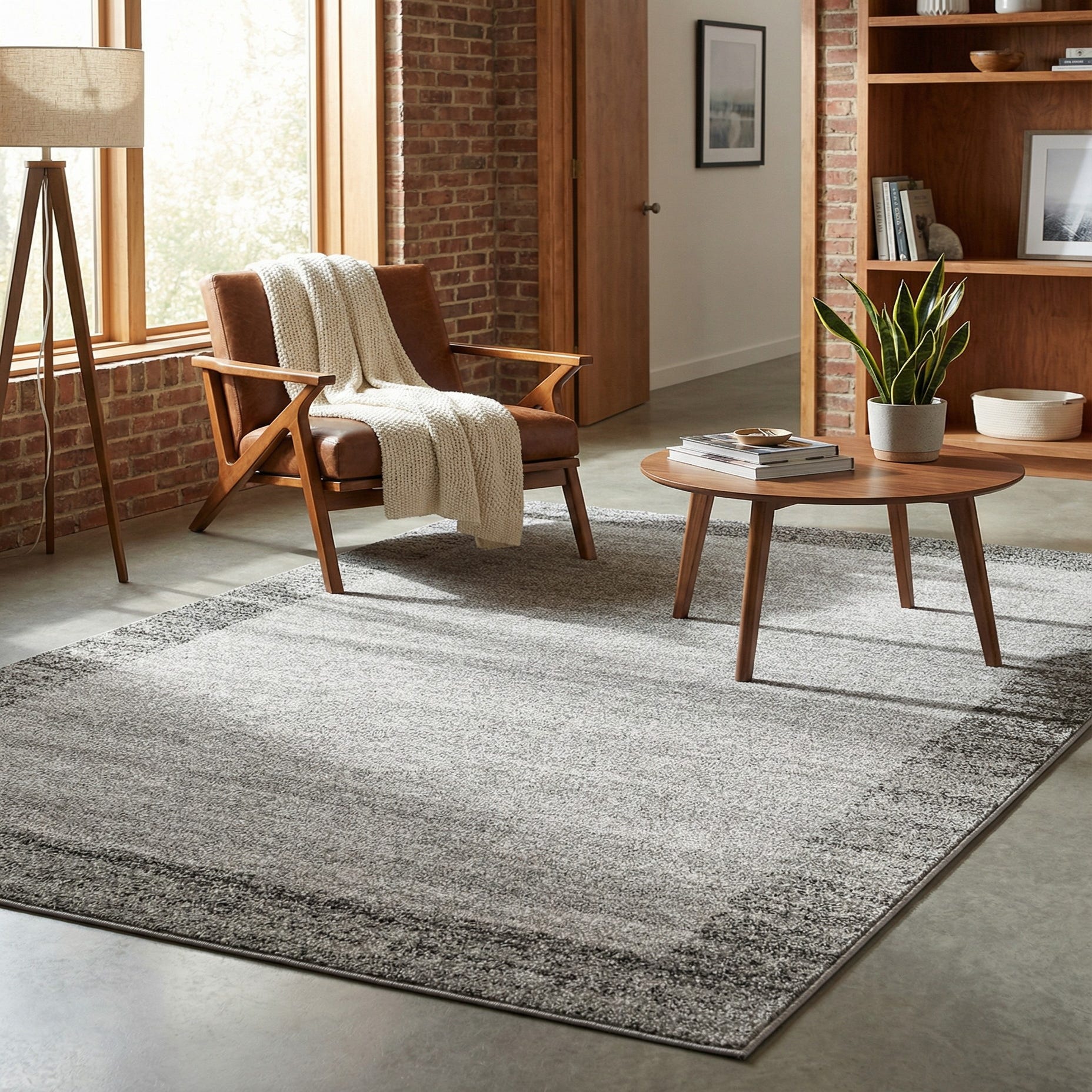 A calm, light gray field sets the stage for a subtle tonal border in deeper gray with hints of beige woven through. The pattern is deliberately restrained — a soft, mottled texture across the center with a slightly more defined, textured band framing the edges — giving the rug a contemporary, transitional look that pairs easily with both modern and classic furnishings. Run your hand across the short, dense pile and you'll feel a smooth, cushioned surface with a gentle, low-profile give; the machine-made construction delivers consistent texture and a faint, natural sheen from the fibers.