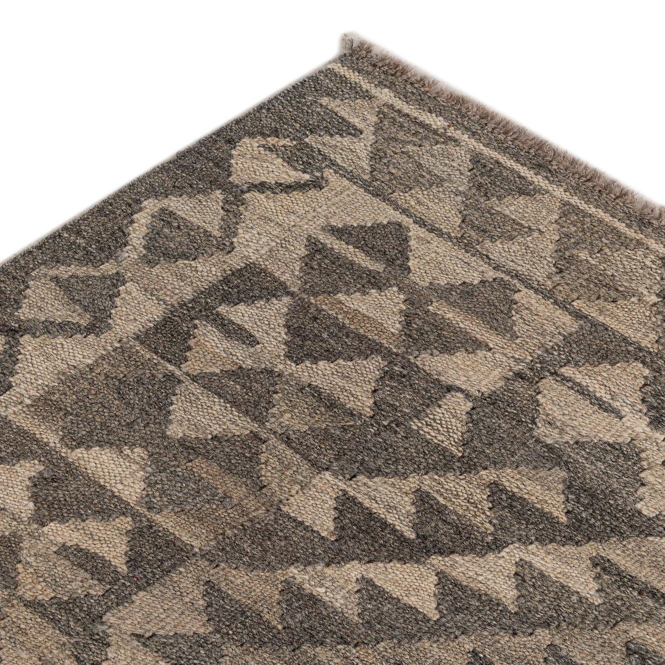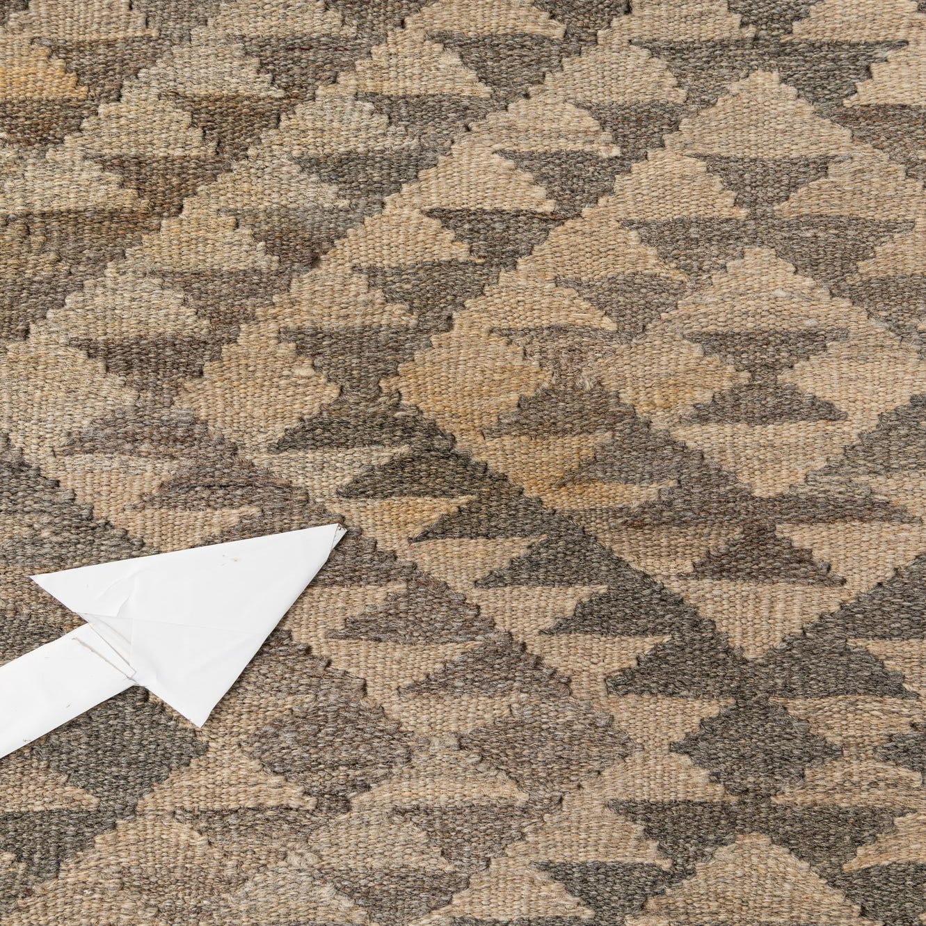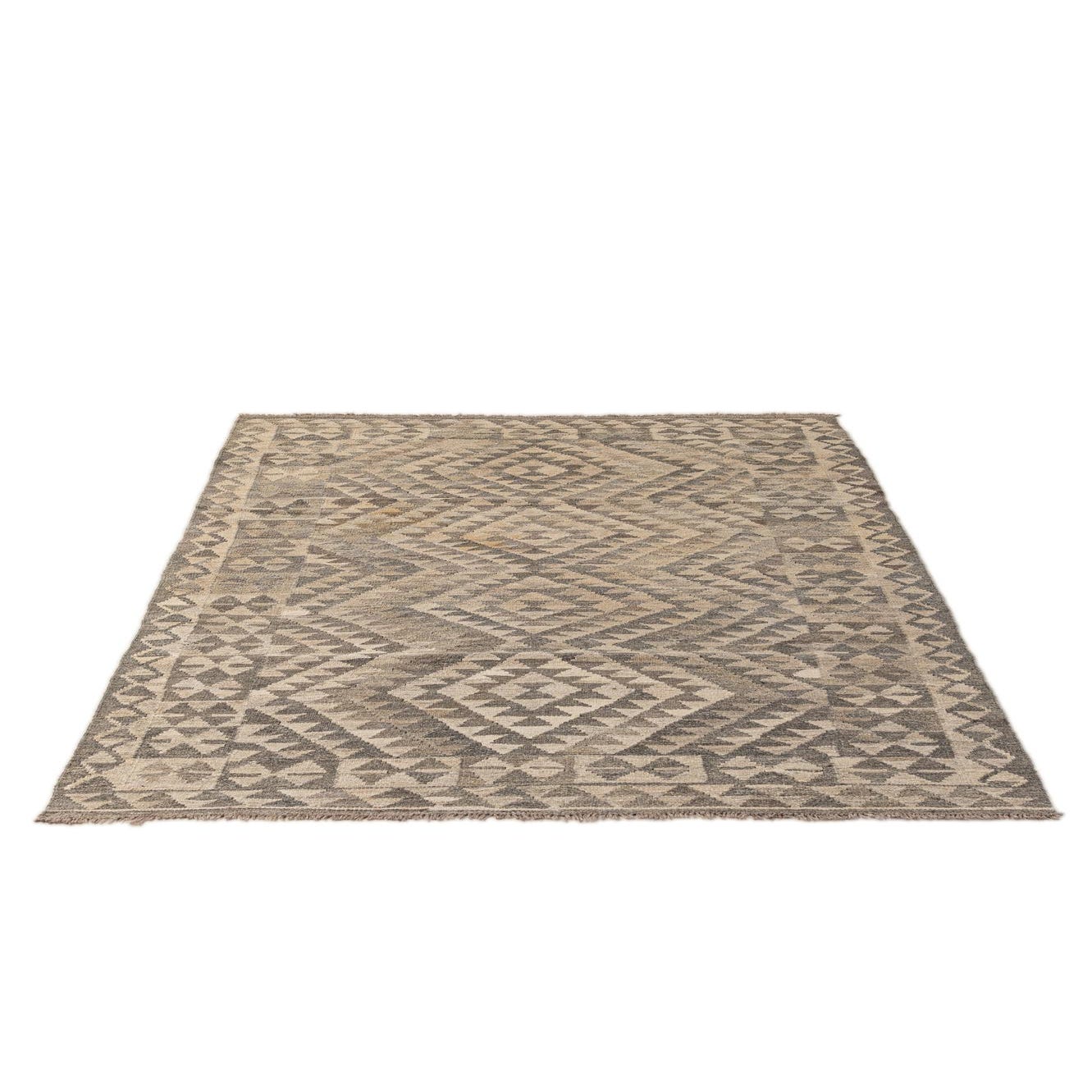 A 4x6 rectangular gray tribal flatweave wool rug with a prominent diamond pattern and geometric border.