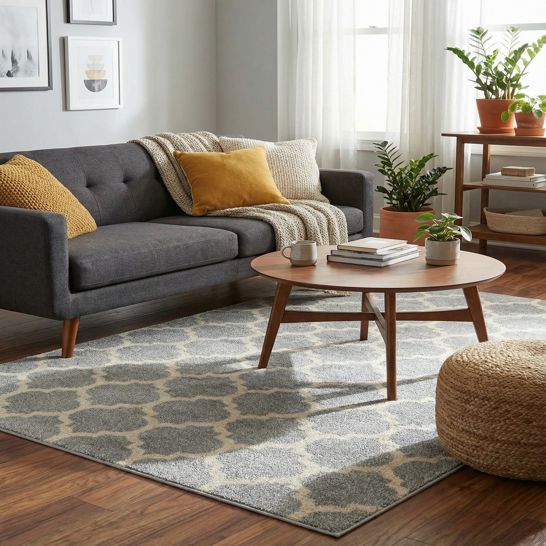 A 4x6 rectangular gray area rug with a cream modern trellis pattern, suitable for various indoor rooms.