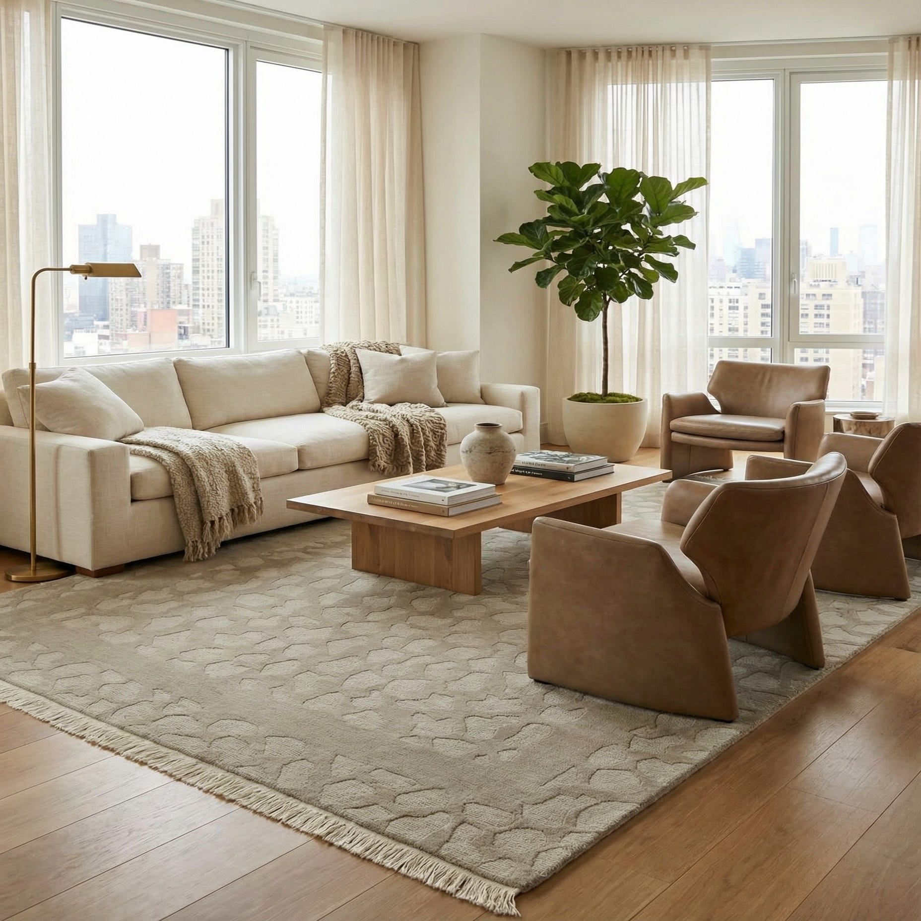 This rug works well in contemporary and transitional interiors—place it beneath a low-profile sofa to ground a neutral living room, layer it at the foot of a bed for added softness in the bedroom, or use it in a calm home office to warm hardwood floors. Its muted palette pairs with warm wood tones, matte metals, and minimalist furnishings, and it will complement both Scandinavian and modern farmhouse schemes.
