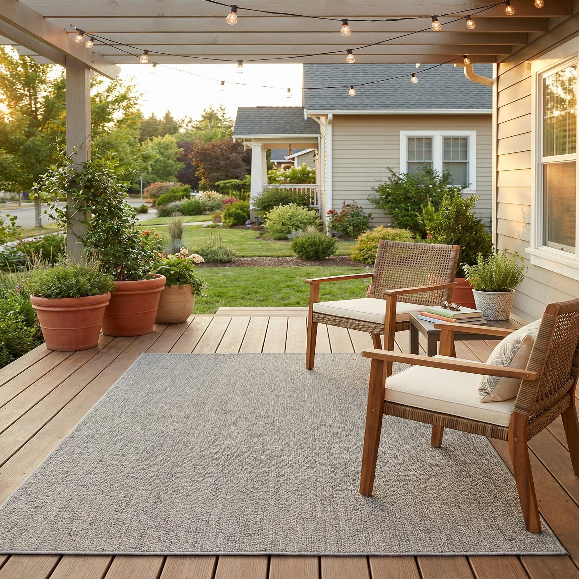 This rug complements modern, coastal, and Scandinavian interiors as well as casual outdoor living spaces. Place it beneath a small patio dining set, in a sunroom or screened porch to anchor seating, or layer it under a bench in an entry for a calm, neutral base. Its quiet palette works equally well with bold patterned cushions or natural wood furniture, making it a flexible foundation for many décor schemes.