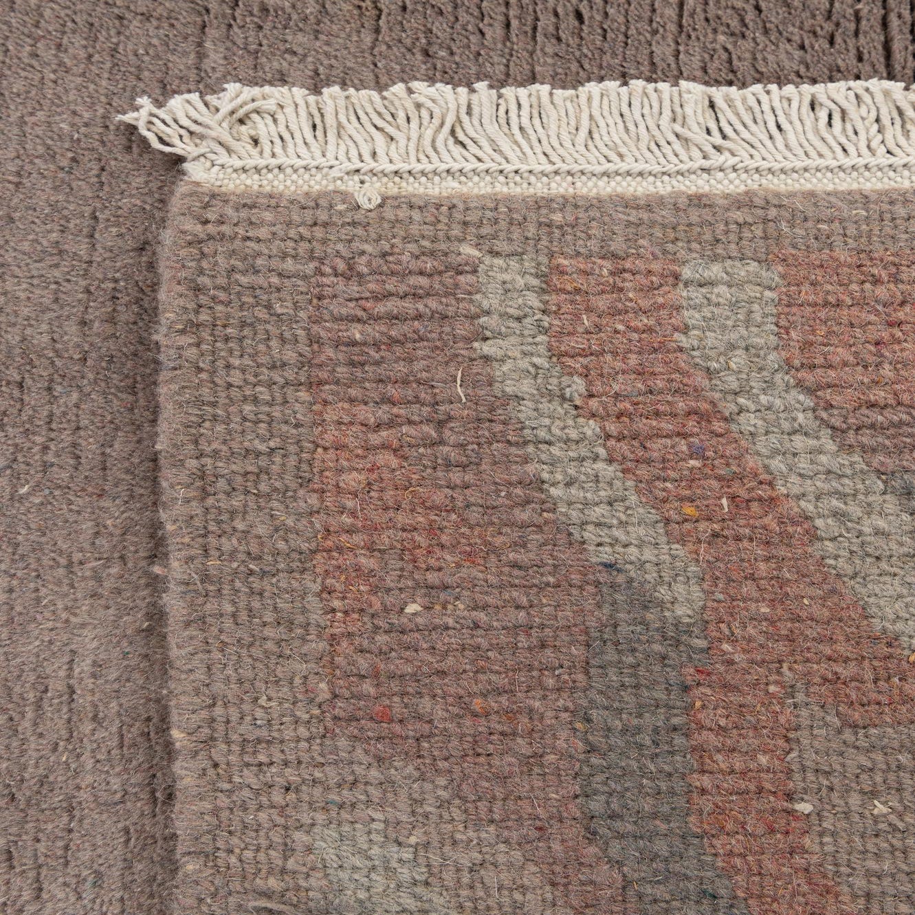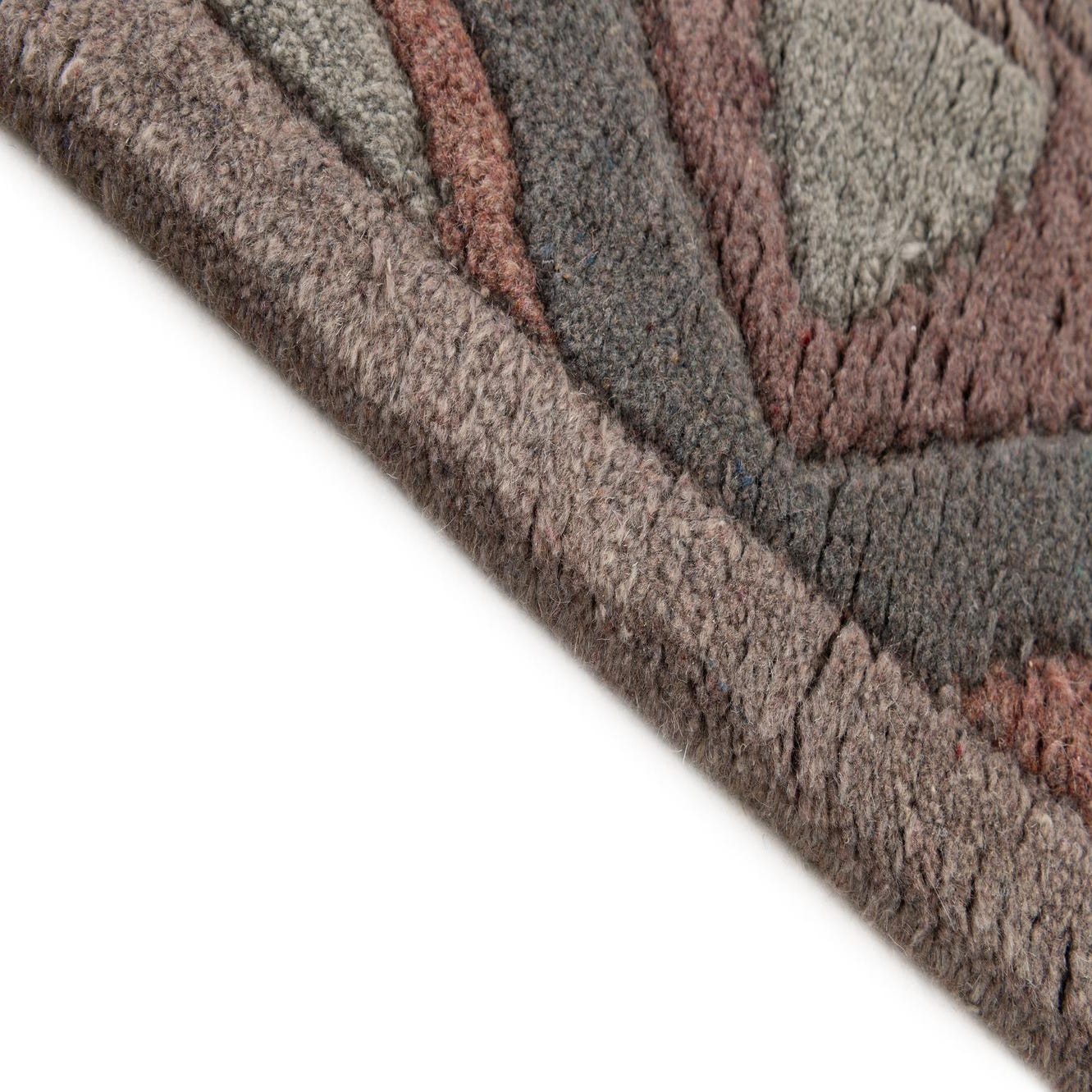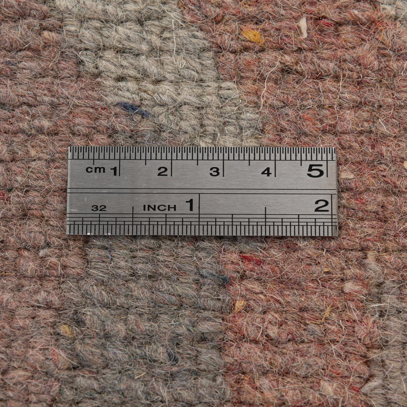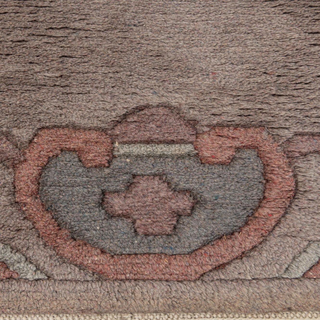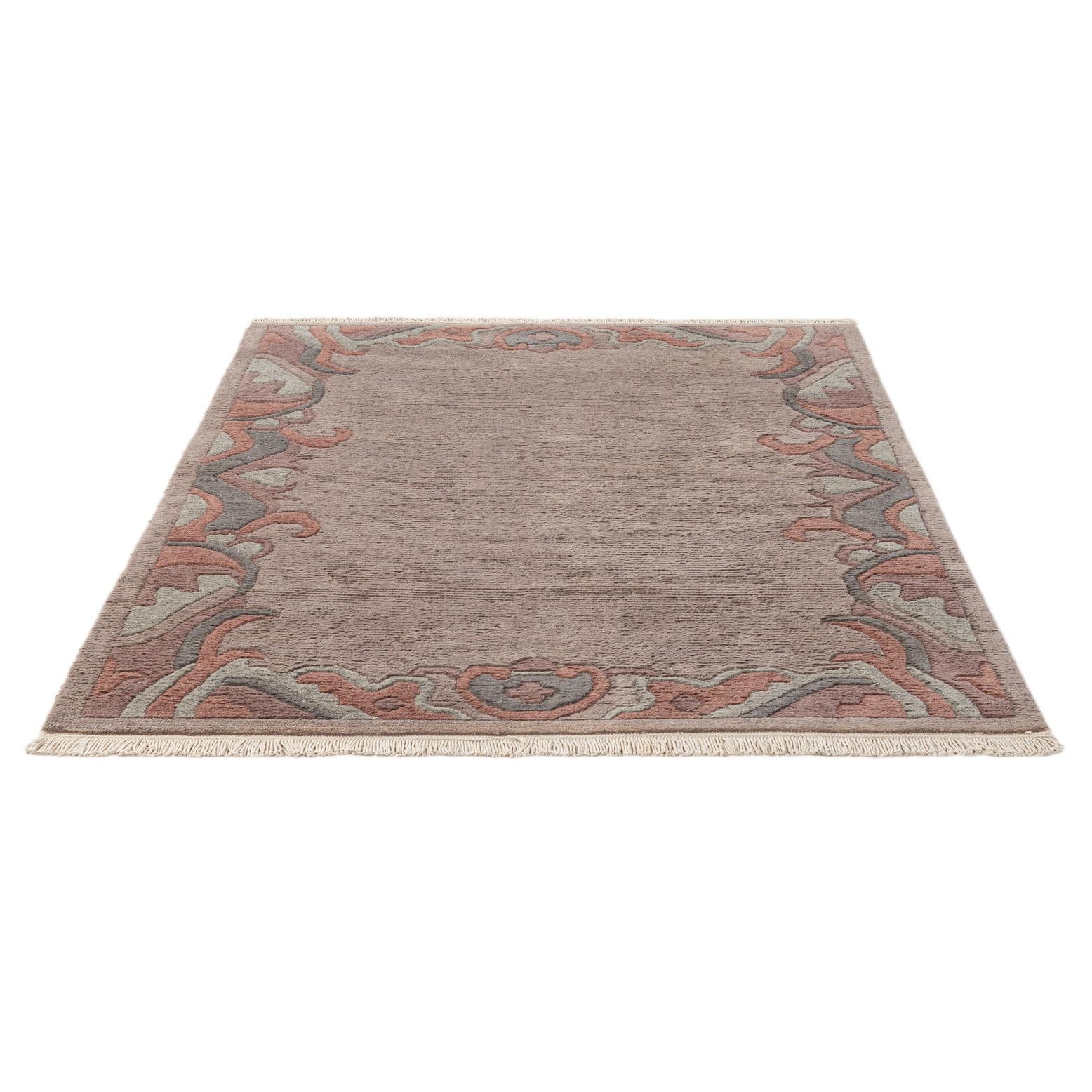 A 4x6 rectangular gray wool rug with a modern oriental abstract border in shades of gray, silver, and muted red.