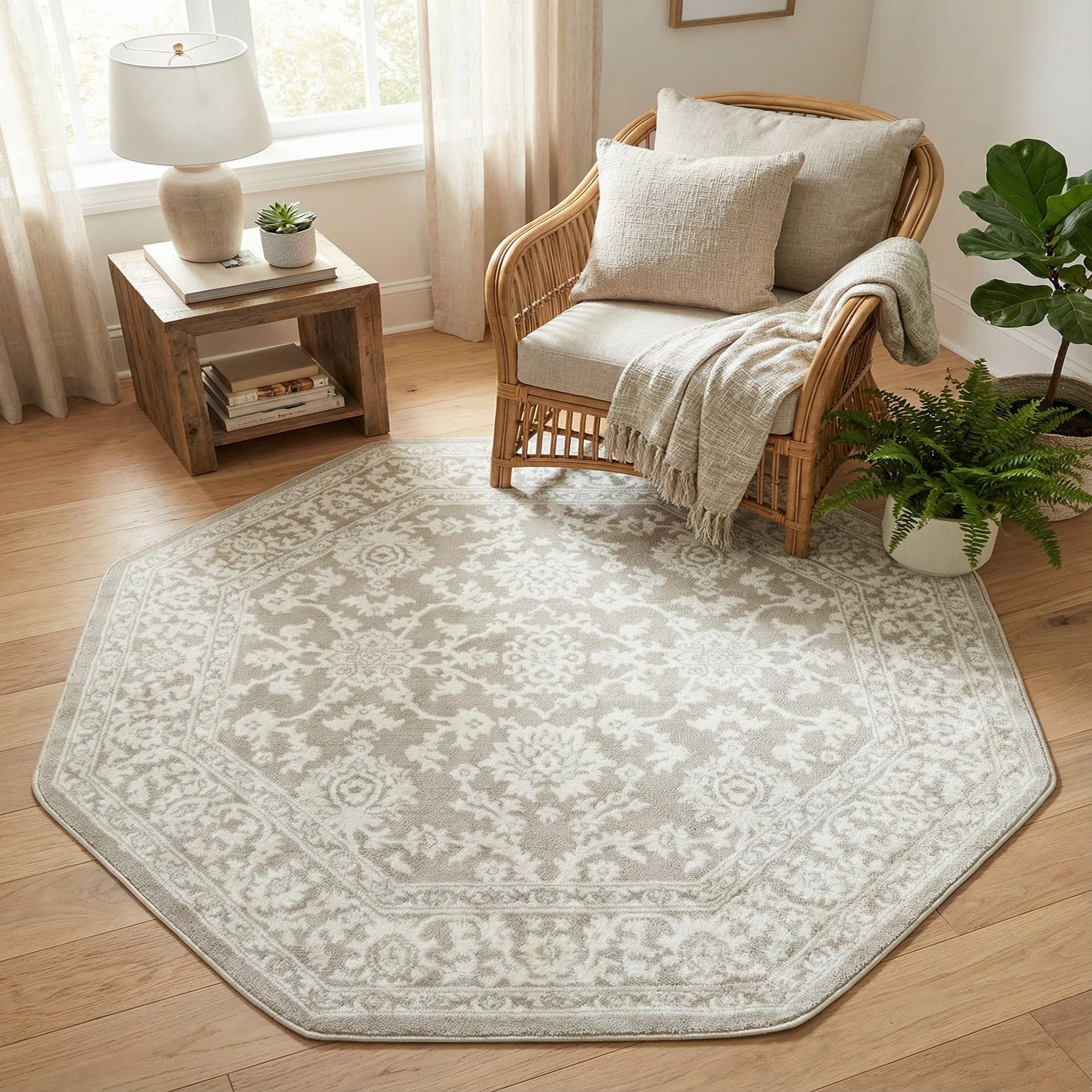 Soft ivory motifs float across a light gray ground in a refined, octagonal layout. A central medallion and scrolling floral arabesques are outlined by a stepped octagon and an ornate outer border, giving the rug a classic, slightly formal look while keeping the overall palette calm and neutral. Machine-made from 100% polypropylene, the rug has a low, dense pile with a smooth, slightly cushioned hand that maintains clear pattern definition.