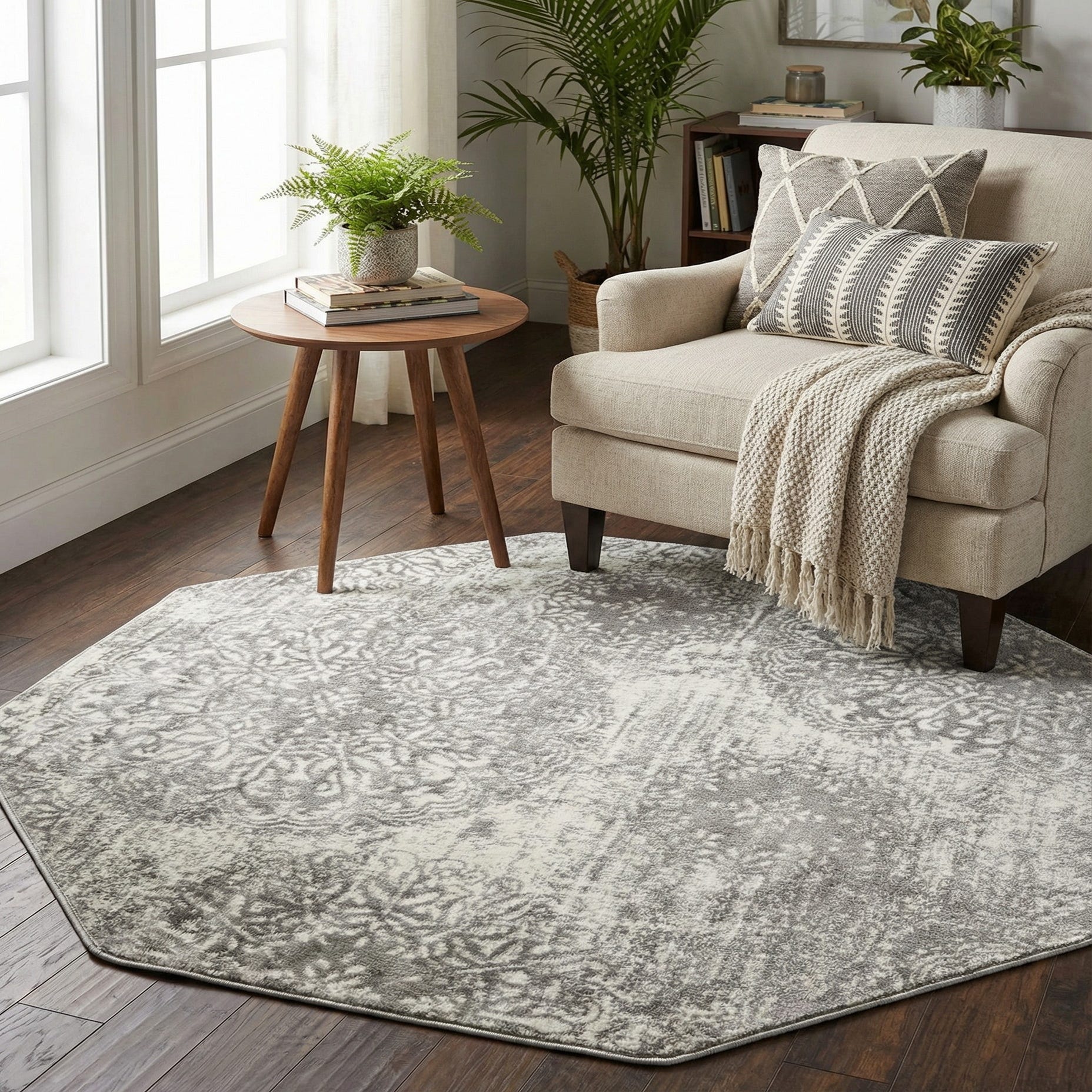 A soft light gray field provides a calm backdrop for a series of ivory medallions and floral arabesques worked into a gently distressed motif. The pattern layers ornamental circles and scrolling details so they fade in and out of view, giving the piece a vintage-inspired, transitional character. The octagonal shape adds a tailored, slightly unexpected silhouette that complements both classic and contemporary furniture arrangements.