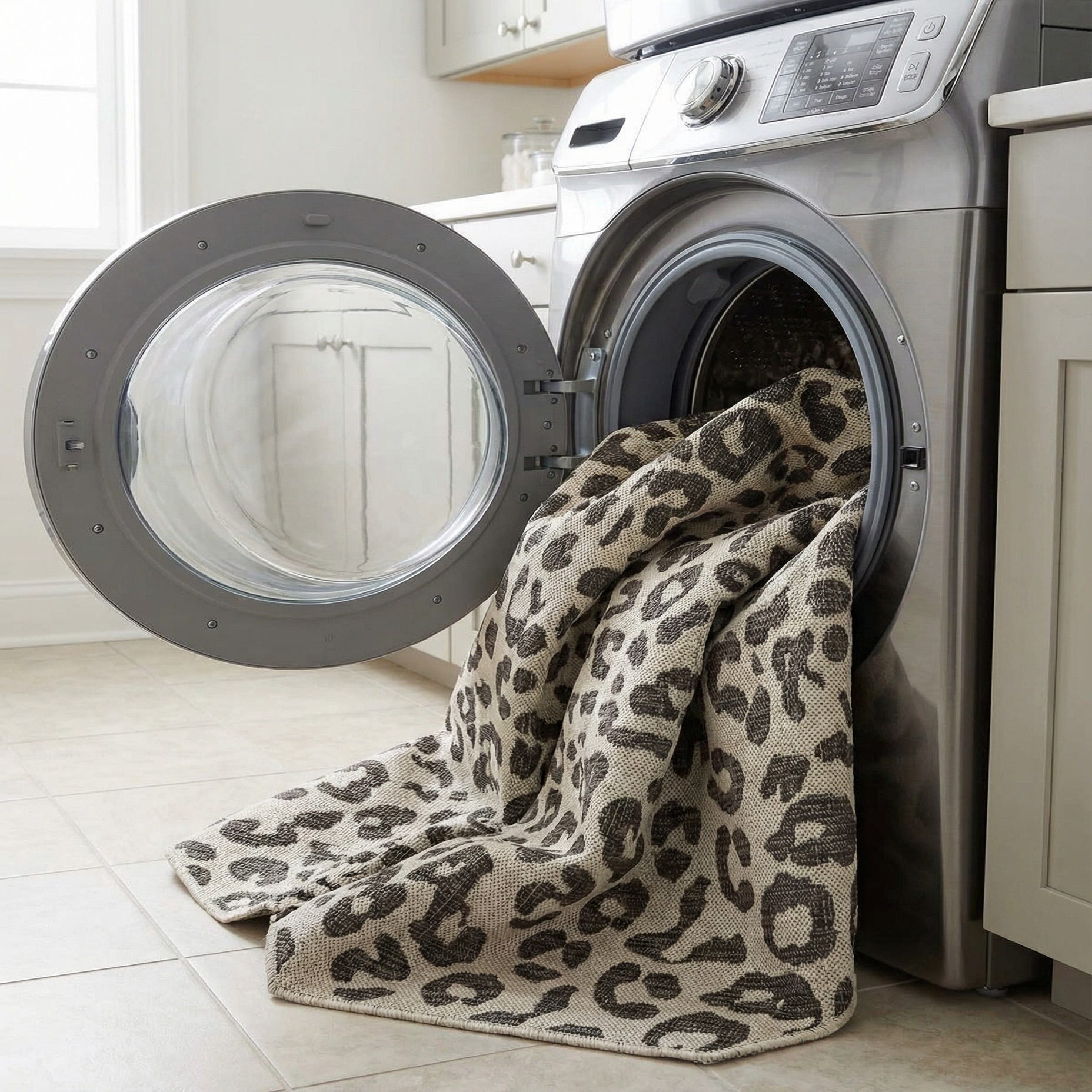 Octagon-shaped gray and silver modern leopard print flatweave rug, suitable for indoor or outdoor use.