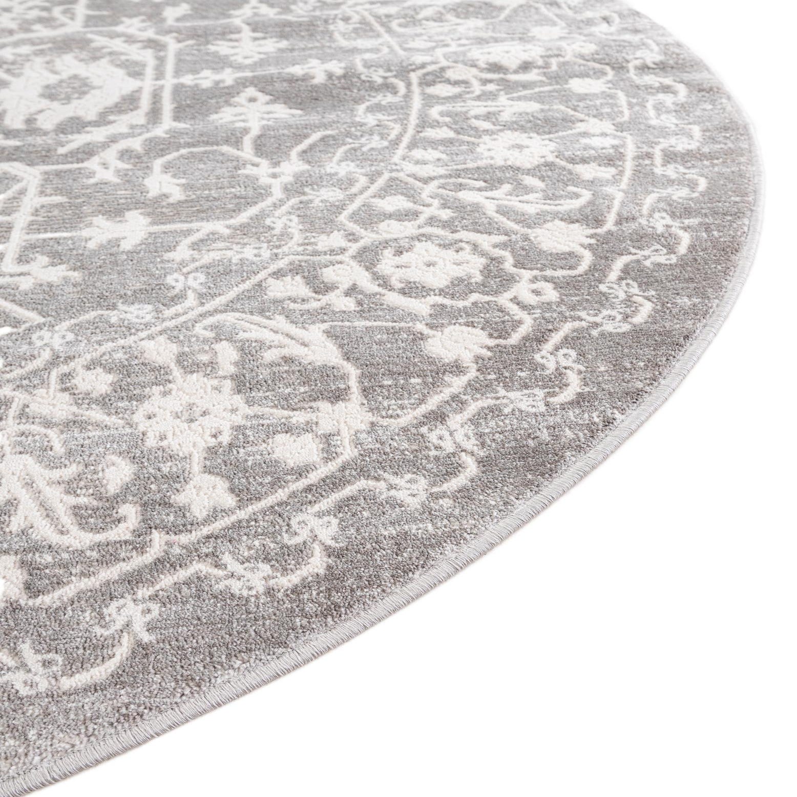 A soft, classical medallion pattern is rendered in ivory against a light gray ground, creating an airy, vintage-inspired look with subtle distressing. Floral arabesques and geometric motifs form a balanced, circular layout that feels refined without being fussy. The design’s neutral palette and gently worn finish give the rug a timeless presence that complements both traditional and more pared-back interiors.
