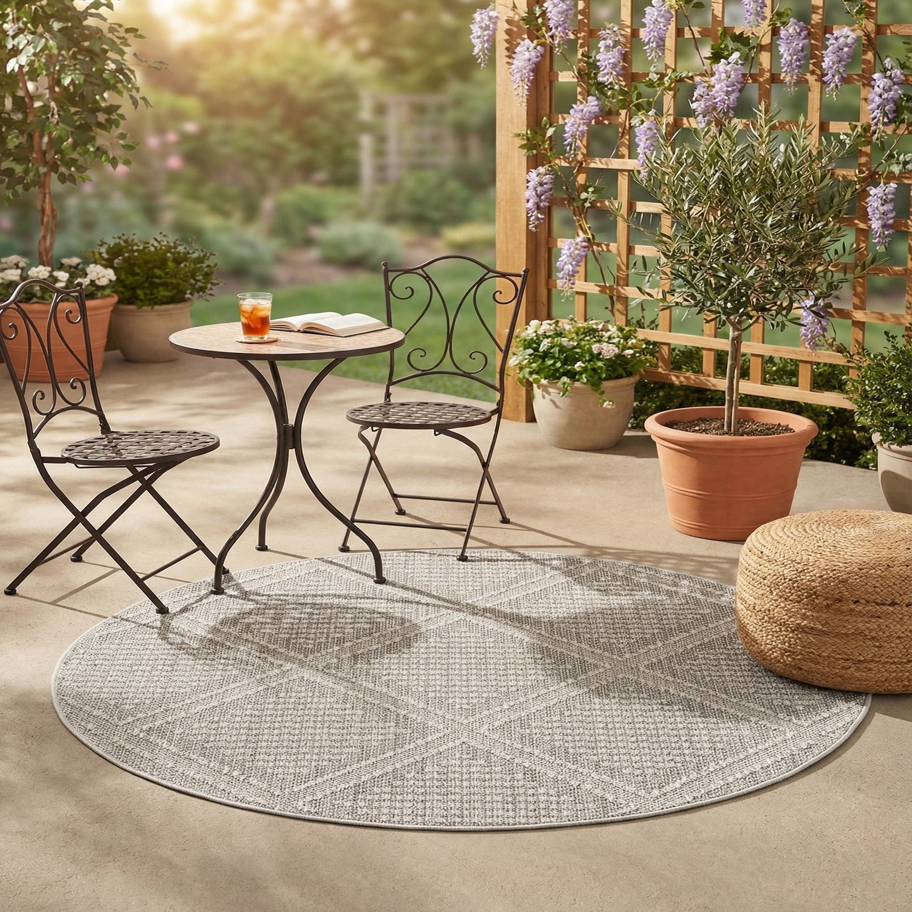The Outdoor Lattice collection presents a 5 Ft Round rug that showcases a harmonious balance of form and function. This rug features a timeless lattice pattern, executed in shades of light gray and complementary hues that create a subtle contrast against its background. The design lends a structured yet airy geometric aesthetic that can elevate outdoor spaces.