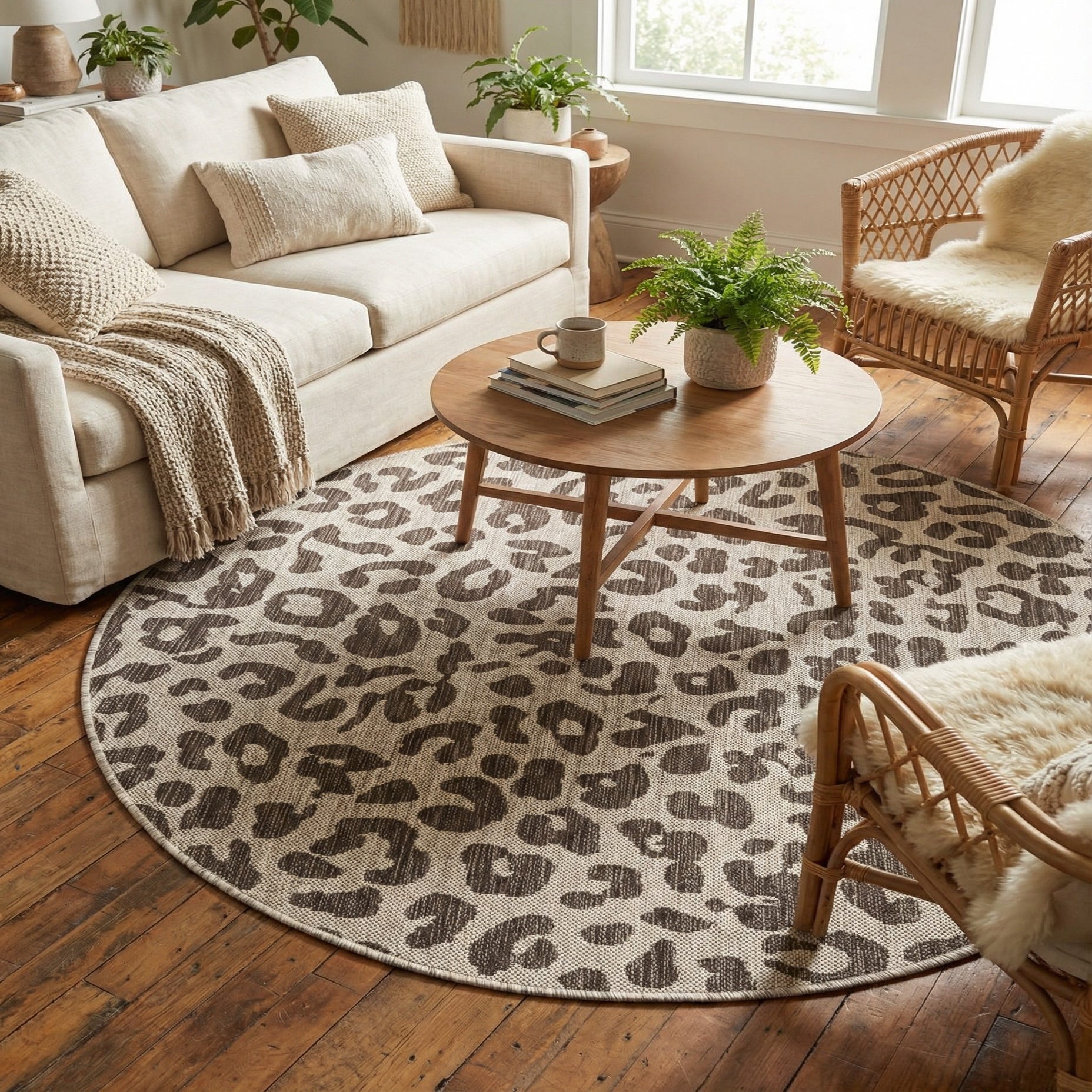 Leopard-inspired spots in varying sizes are worked in gray against a light gray ground, offering a modern, low-contrast take on animal print. The irregular, organic motif creates movement across the round field without overwhelming a space, and the light gray background keeps the palette soft and easy to layer with other neutrals or bold accents.