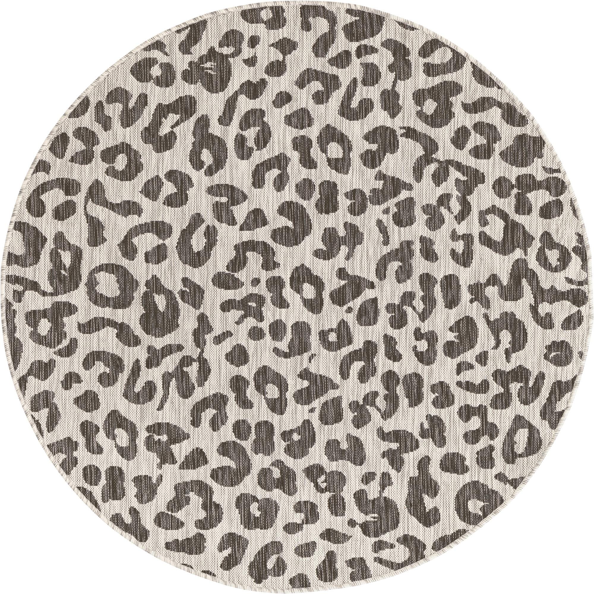 A 5' 3 round gray leopard print rug with a modern flatweave texture, suitable for indoor or outdoor use.