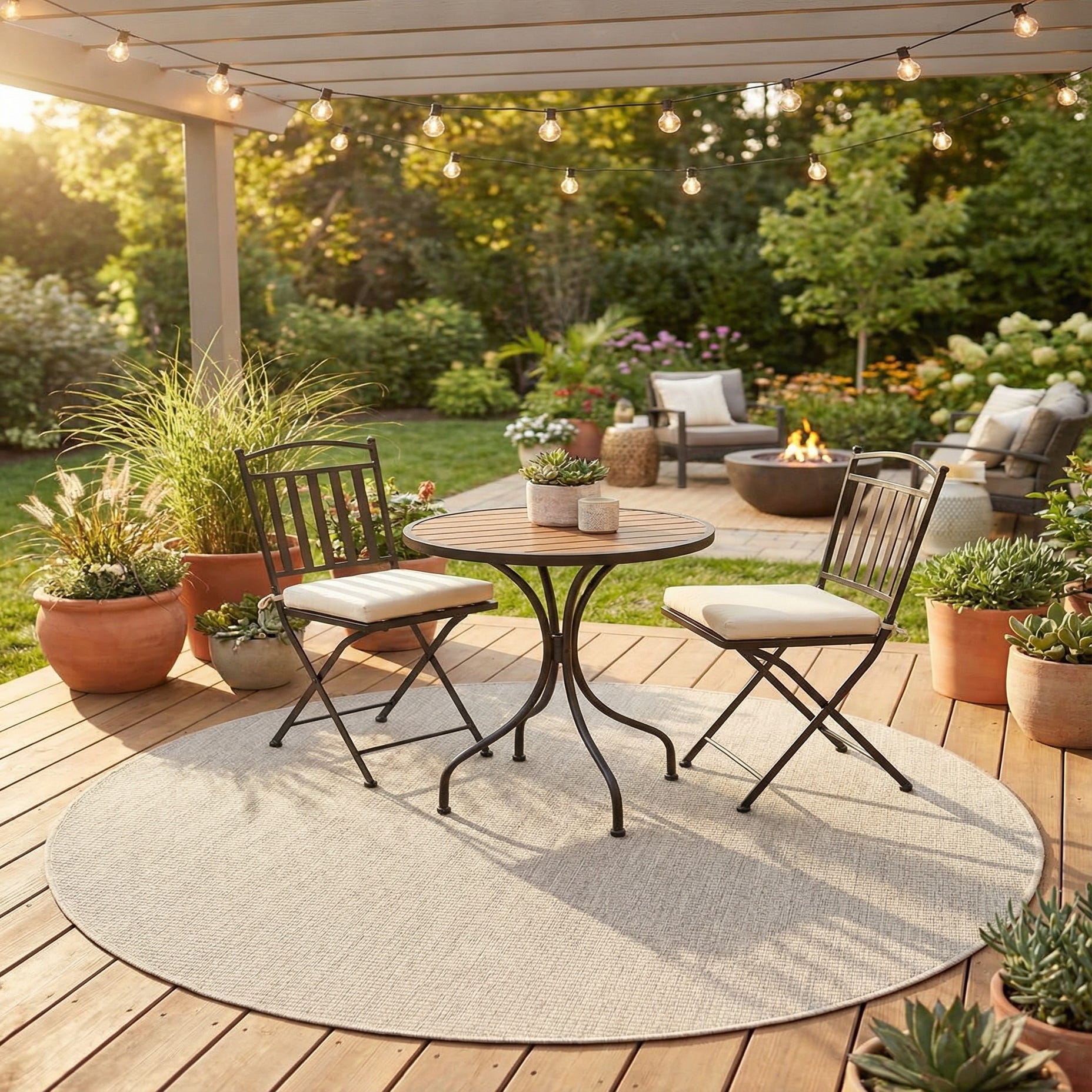 The round shape makes it a versatile anchor for a bistro set on a covered patio, a sunroom seating nook, or a casual dining area. Pair it with light woods and woven wicker for a coastal look, charcoal metal and glass for modern minimalism, or soft neutrals and pale linens in a relaxed living room.