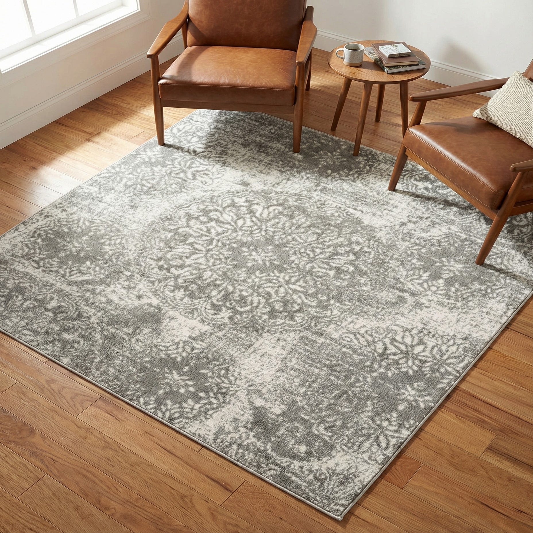 This rug works well as a calming foundation in a living room beneath a coffee table, layered at the foot of a bed to introduce pattern without heavy contrast, or in a home office to add texture alongside clean-lined furniture. Pair it with pale woods, cool metals, or neutral upholstery for a cohesive, contemporary-transitional scheme, or use it to soften a minimalist space while keeping a restrained, elegant look.