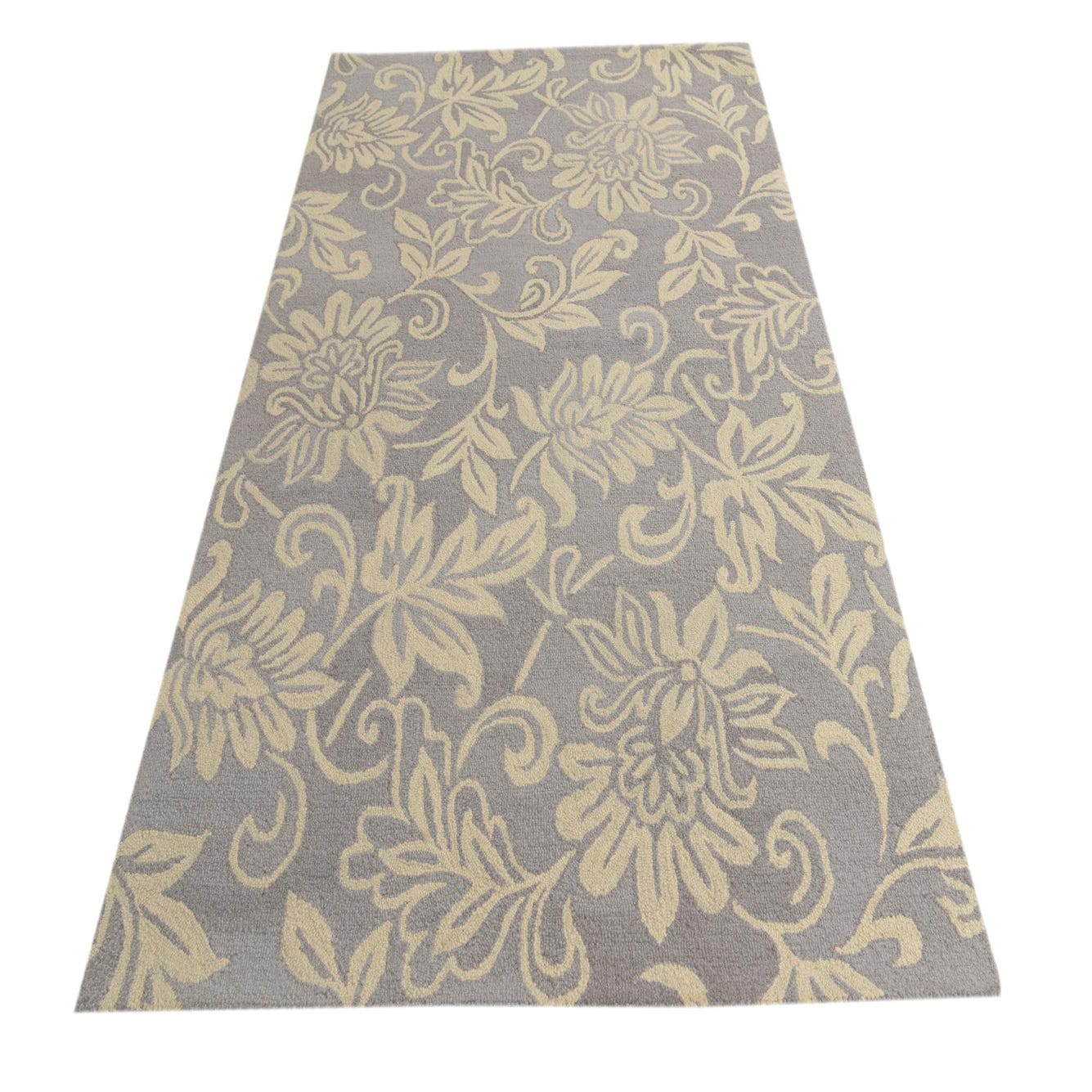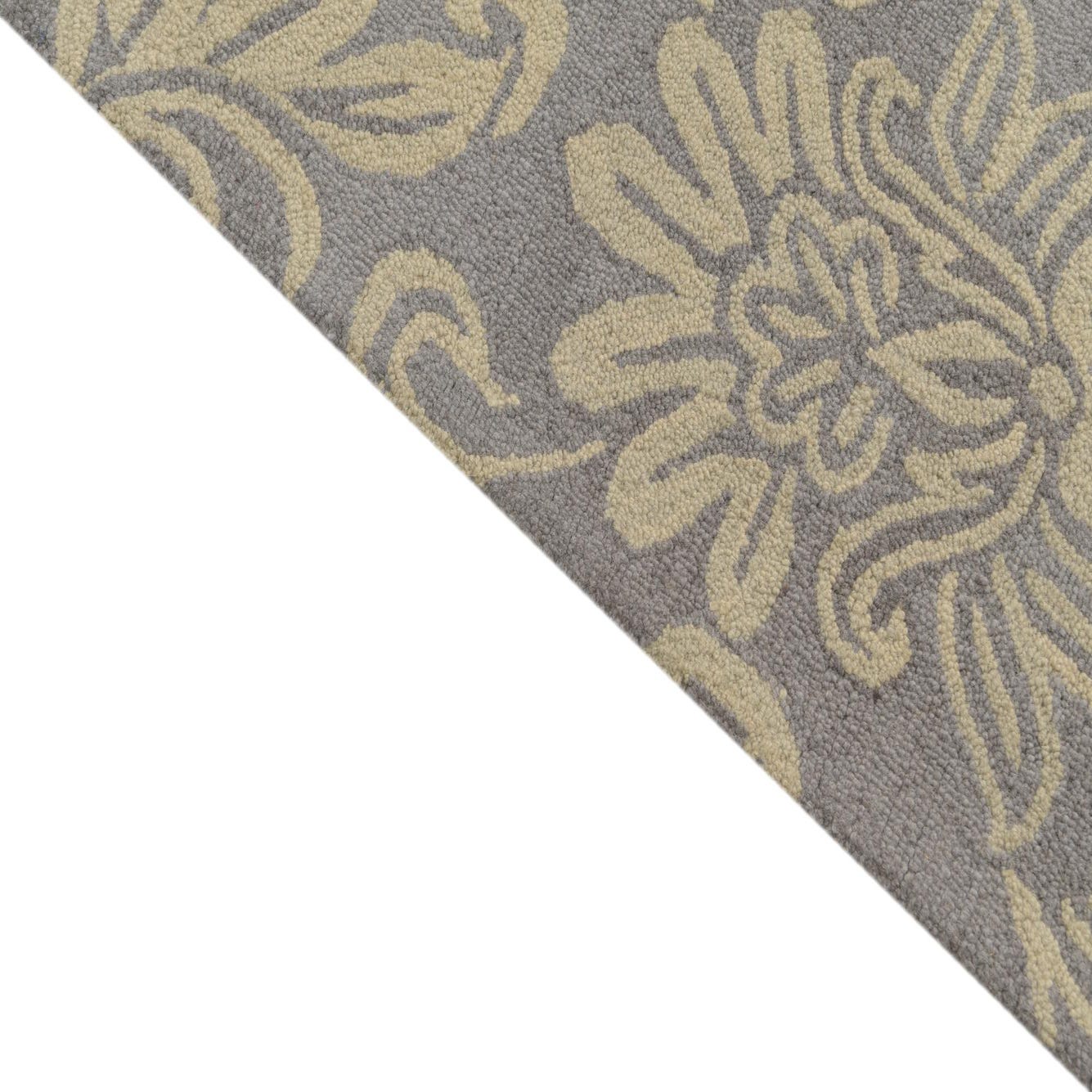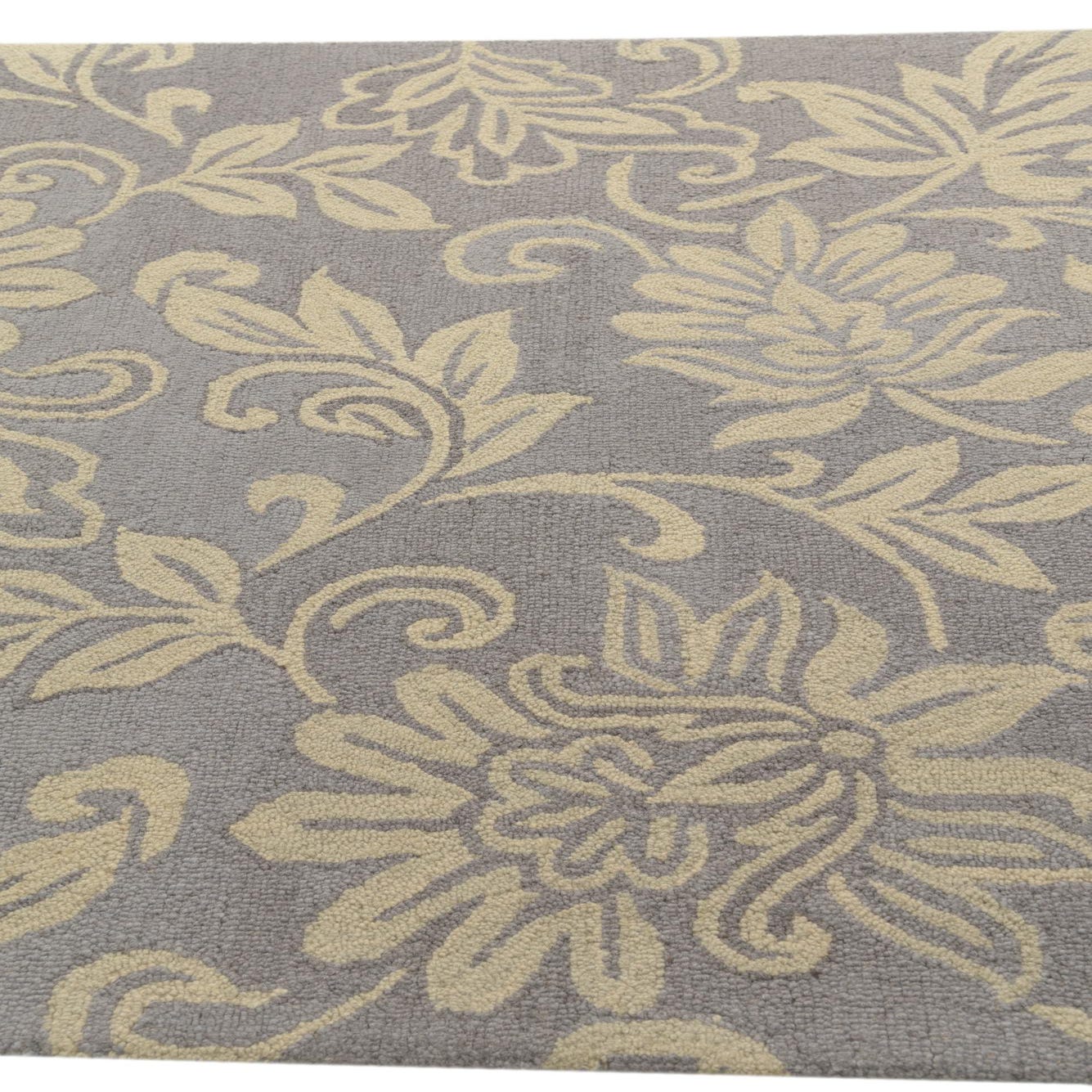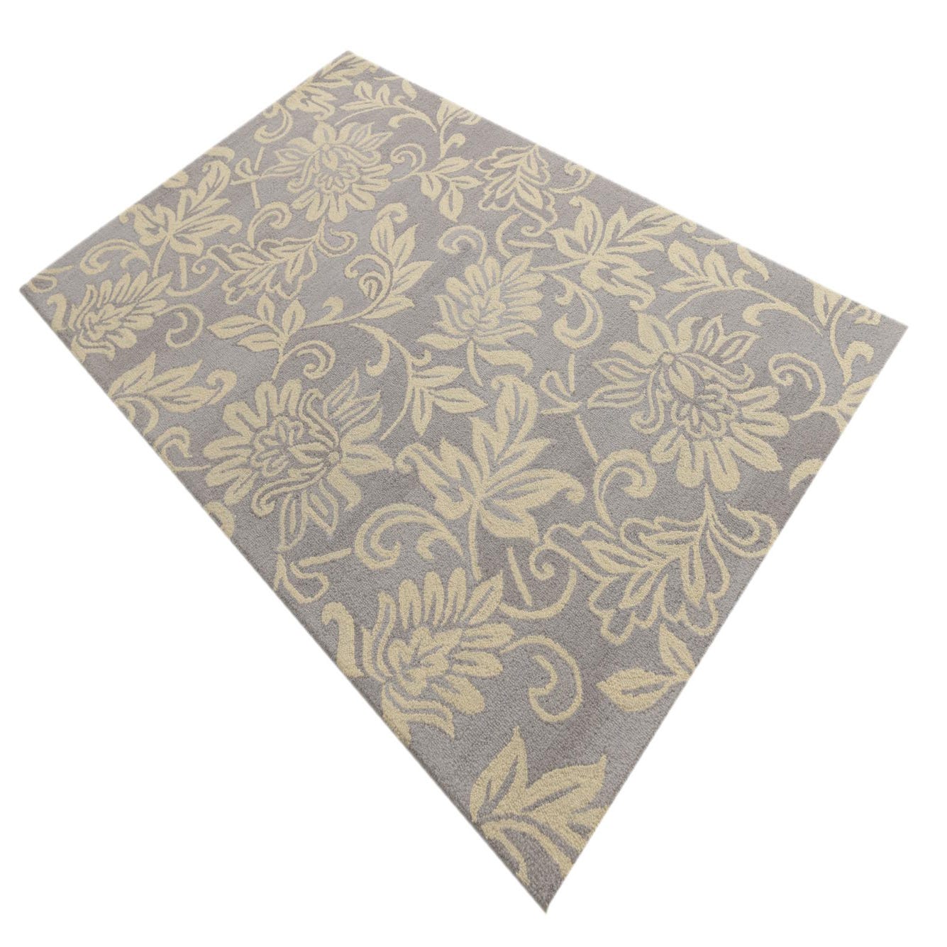 A 5x8 rectangular gray wool area rug with a high pile, featuring an elegant traditional floral pattern in light beige.