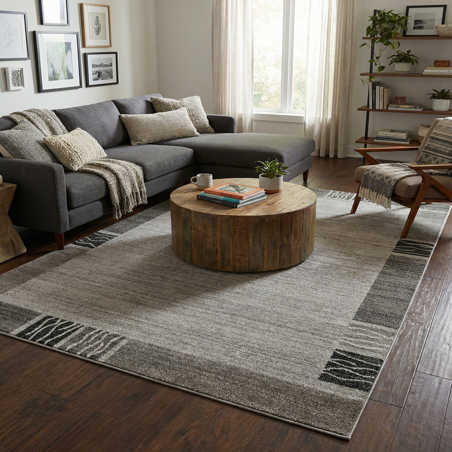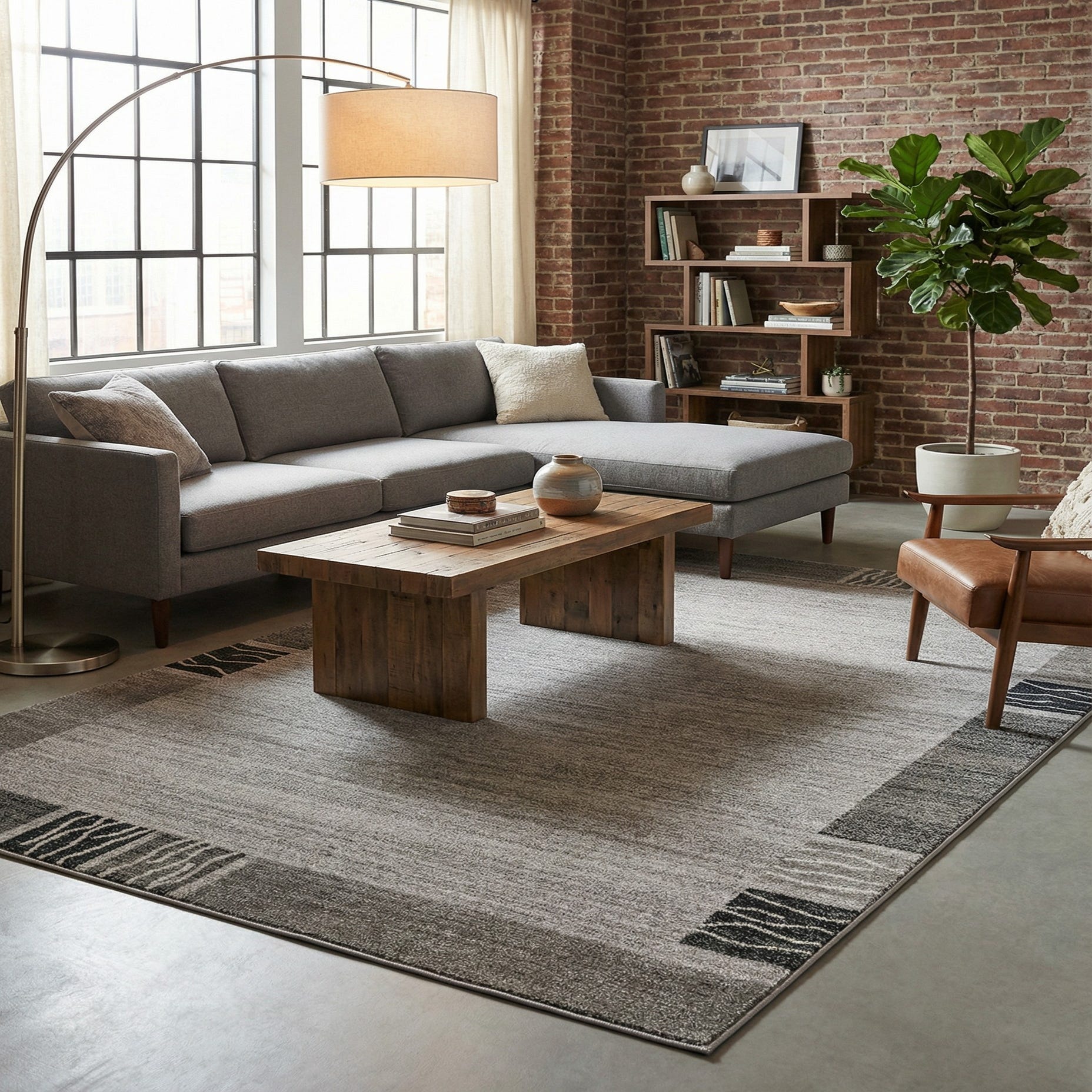 This area rug would seamlessly integrate into modern and minimalist decors, complementing spaces with clean lines and a monochromatic color scheme. It could also serve as a grounding element in an industrial-themed interior, balancing out metallic accents and wooden textures. The Angelica rug's subdued color palette and straightforward design make it a versatile piece for a living room, home office, or bedroom, providing a sophisticated and contemporary foundation for a range of furniture styles.