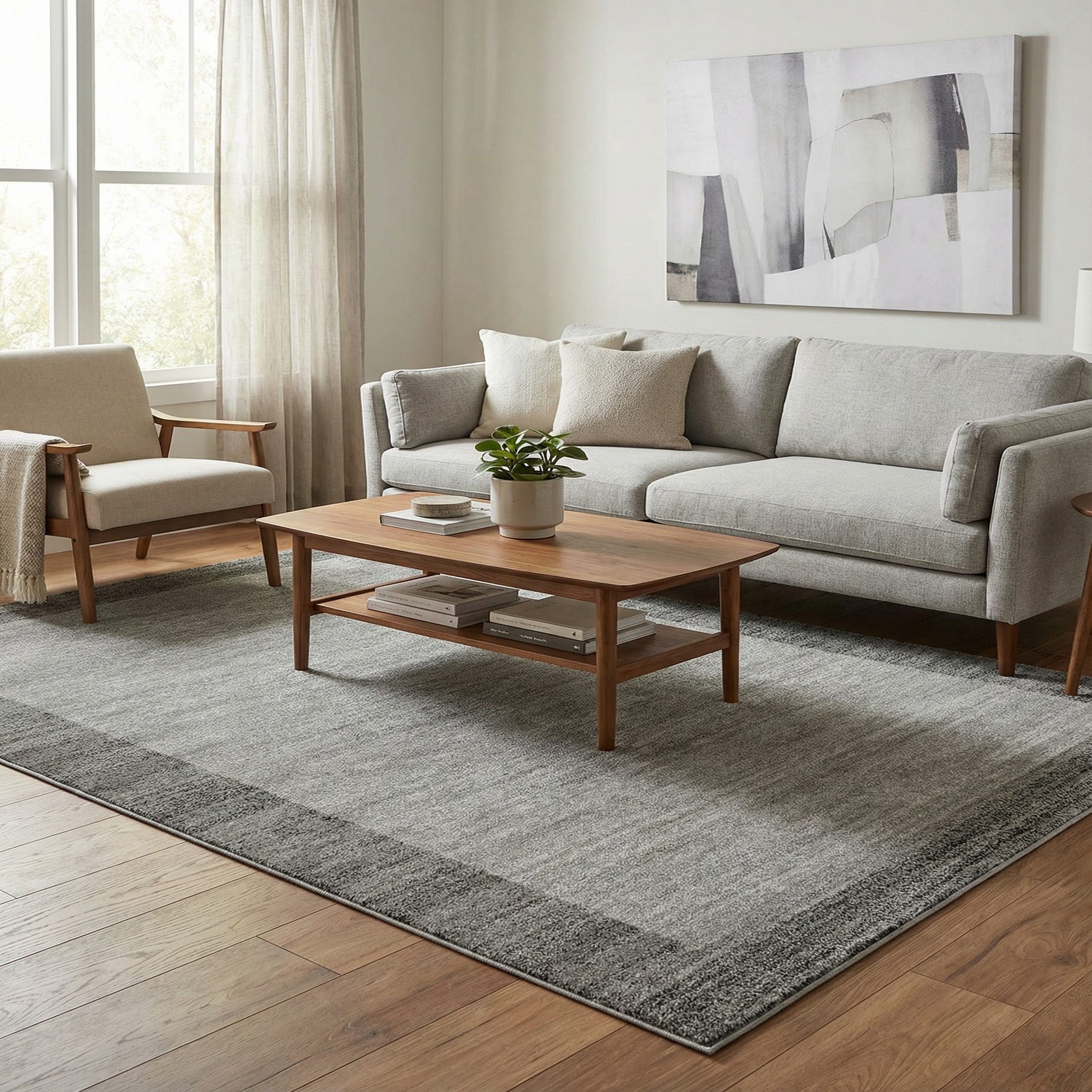 A pared-back border design in a light gray field with a darker gray band creates a calm, contemporary look. The pattern is minimal and geometric — a clean rectangular frame with subtle heathered striations of gray and beige woven through the pile to add visual depth without busy motifs. Machine-made of 100% polypropylene, the rug has a low, dense pile that feels smooth and slightly cushioned underfoot; the tight weave and even surface give it a refined, matte finish you can feel when you run your hand across it.