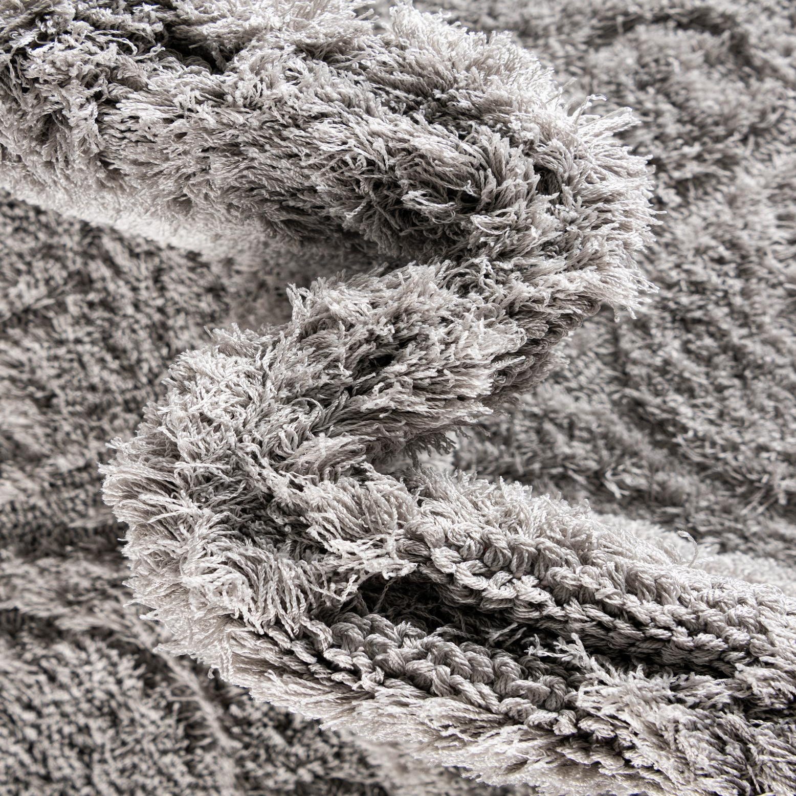 Soft, sculpted loops form a low-relief botanical swirl across a light gray field, creating a tone-on-tone pattern that reads calm and intentional. The pile is a high-low shag with a plush hand — when you run your fingers across it you can feel the raised swirls against the denser background, giving the surface a tactile depth without heavy contrast. Machine-made of 100% polyester, the construction keeps the texture consistent and the overall look contemporary and refined.