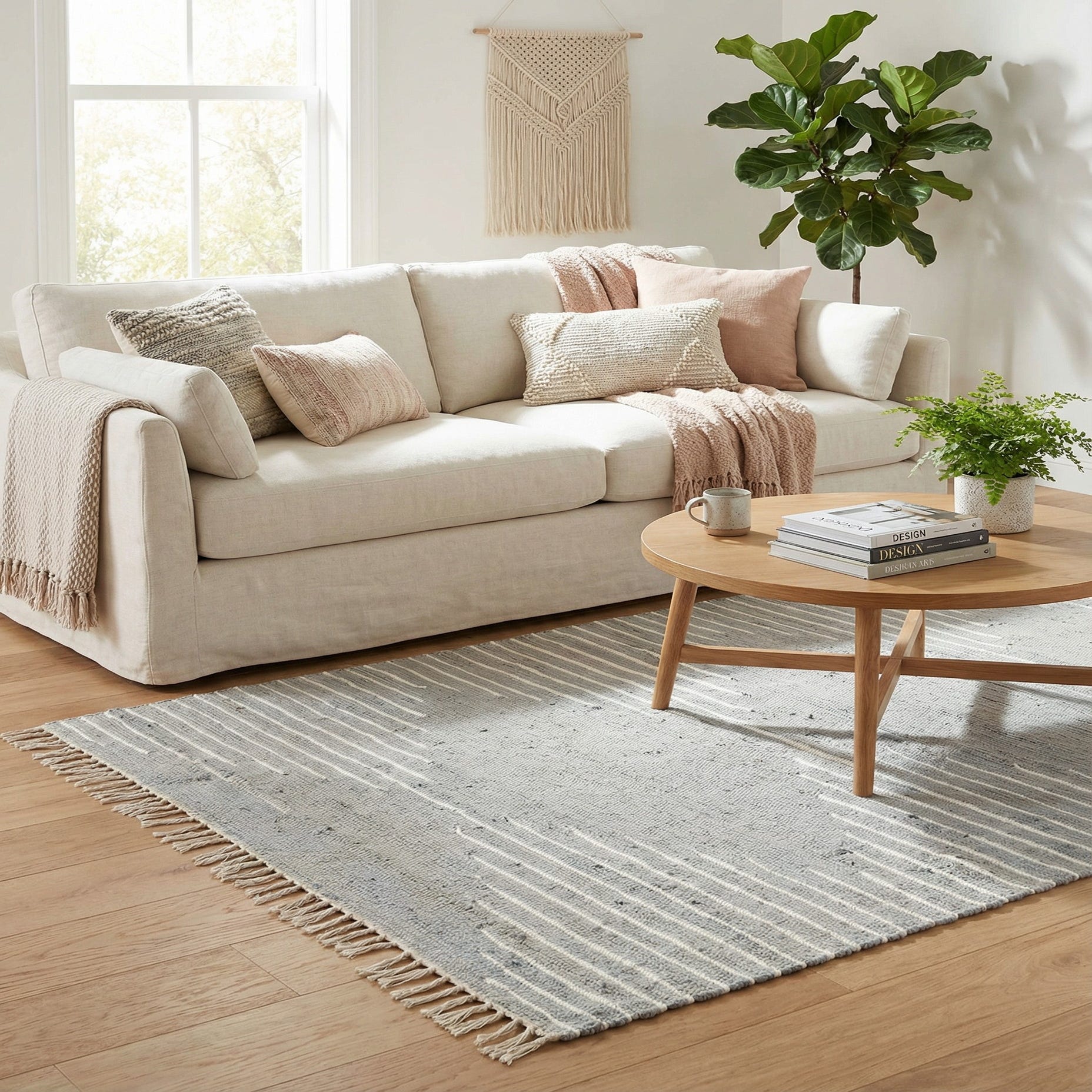 This rug pairs naturally with neutral, Scandinavian, or modern farmhouse interiors and complements coastal or minimalist schemes where texture and tone are important. Place it beneath a coffee table to anchor a living area, layer it in a bedroom to soften hardwood floors, or choose it for a low-profile solution in an entry or kitchen where a flatweave works best. Its understated palette and woven character make it easy to mix with wood furniture, woven baskets, and light upholstery.