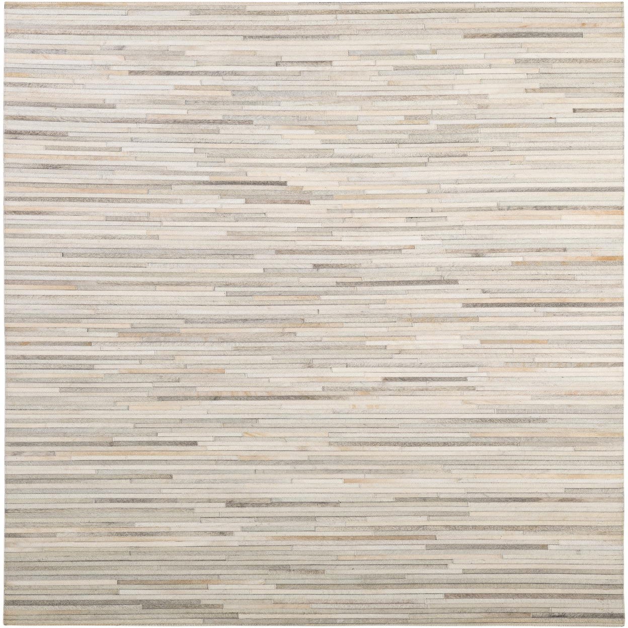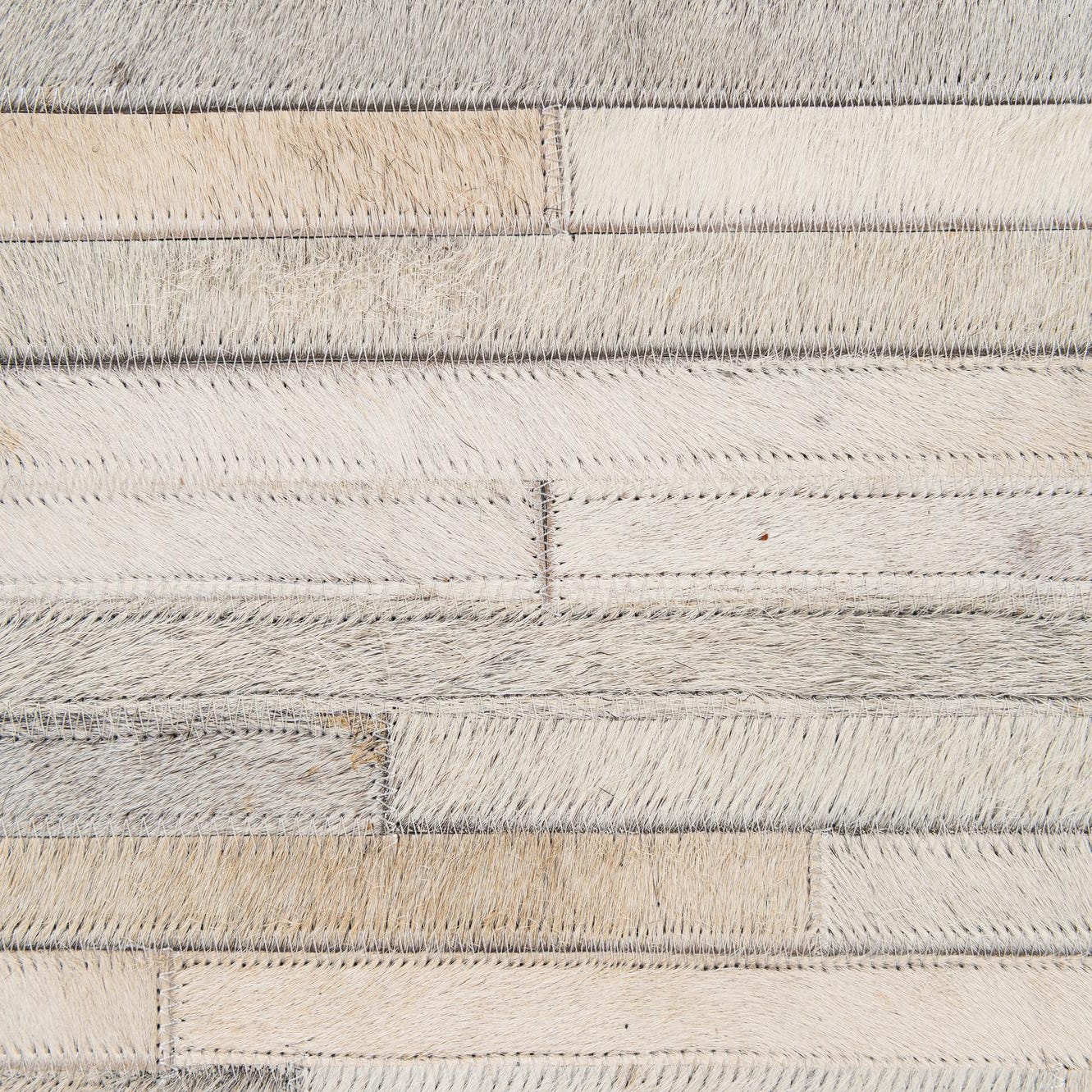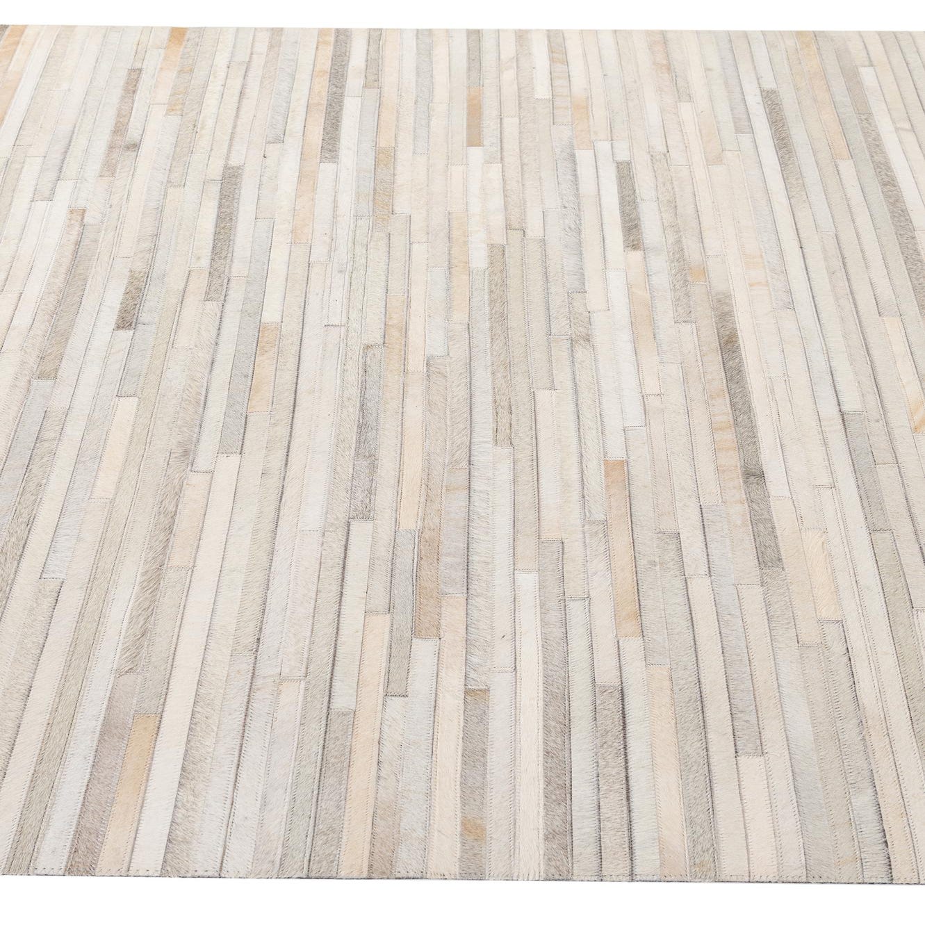 A 5x8 rectangular Cowhide Patchwork rug featuring horizontal stripes in varying shades of gray, silver, and cream, suitable for a modern living room.
