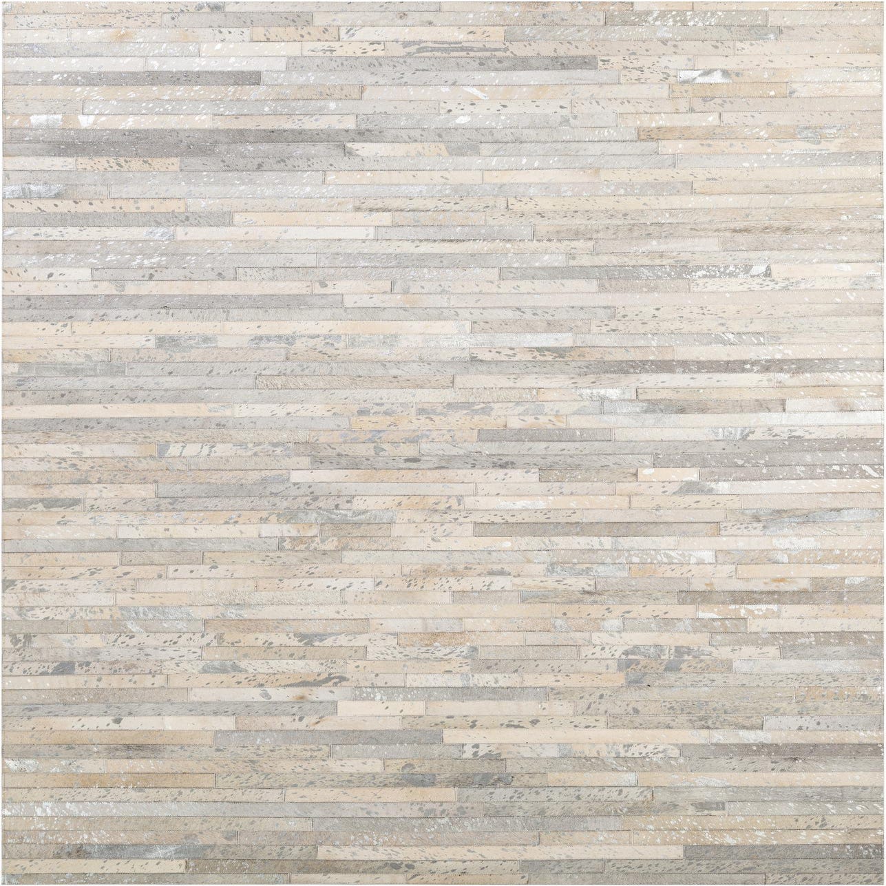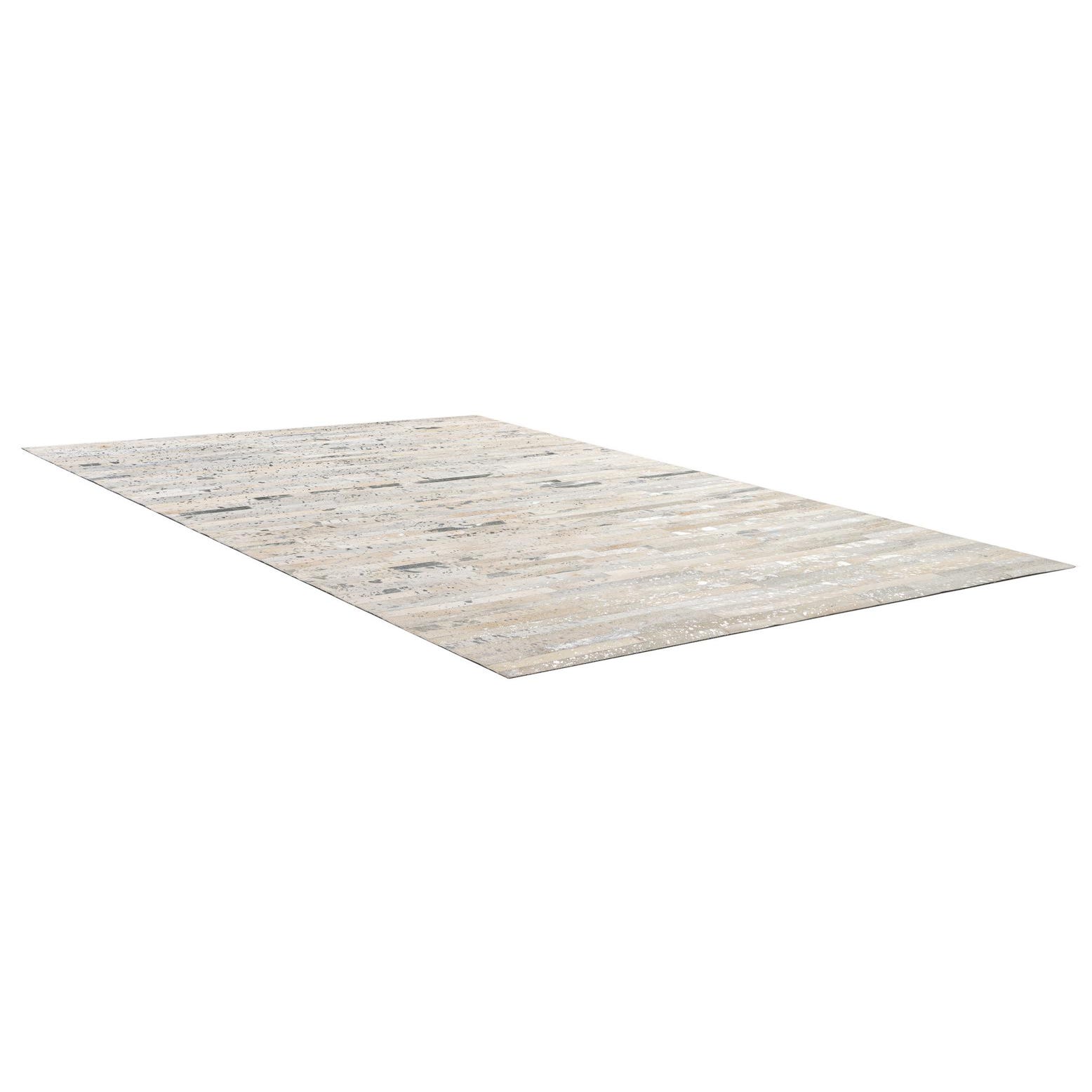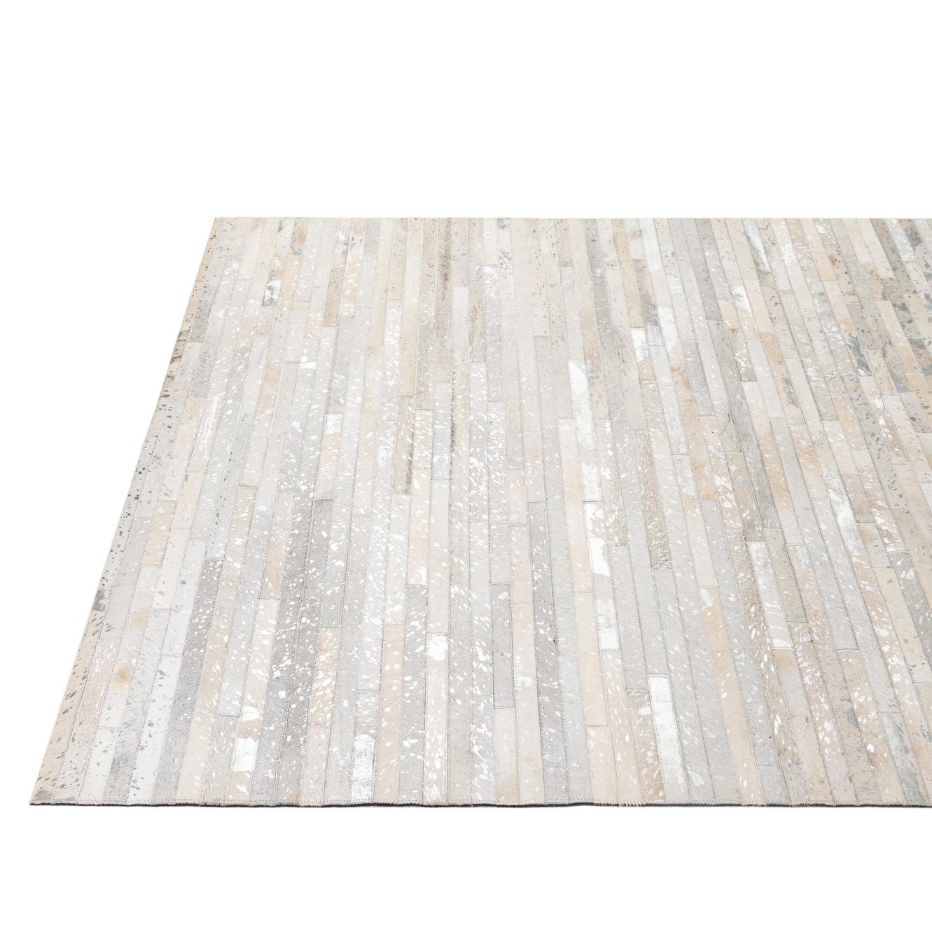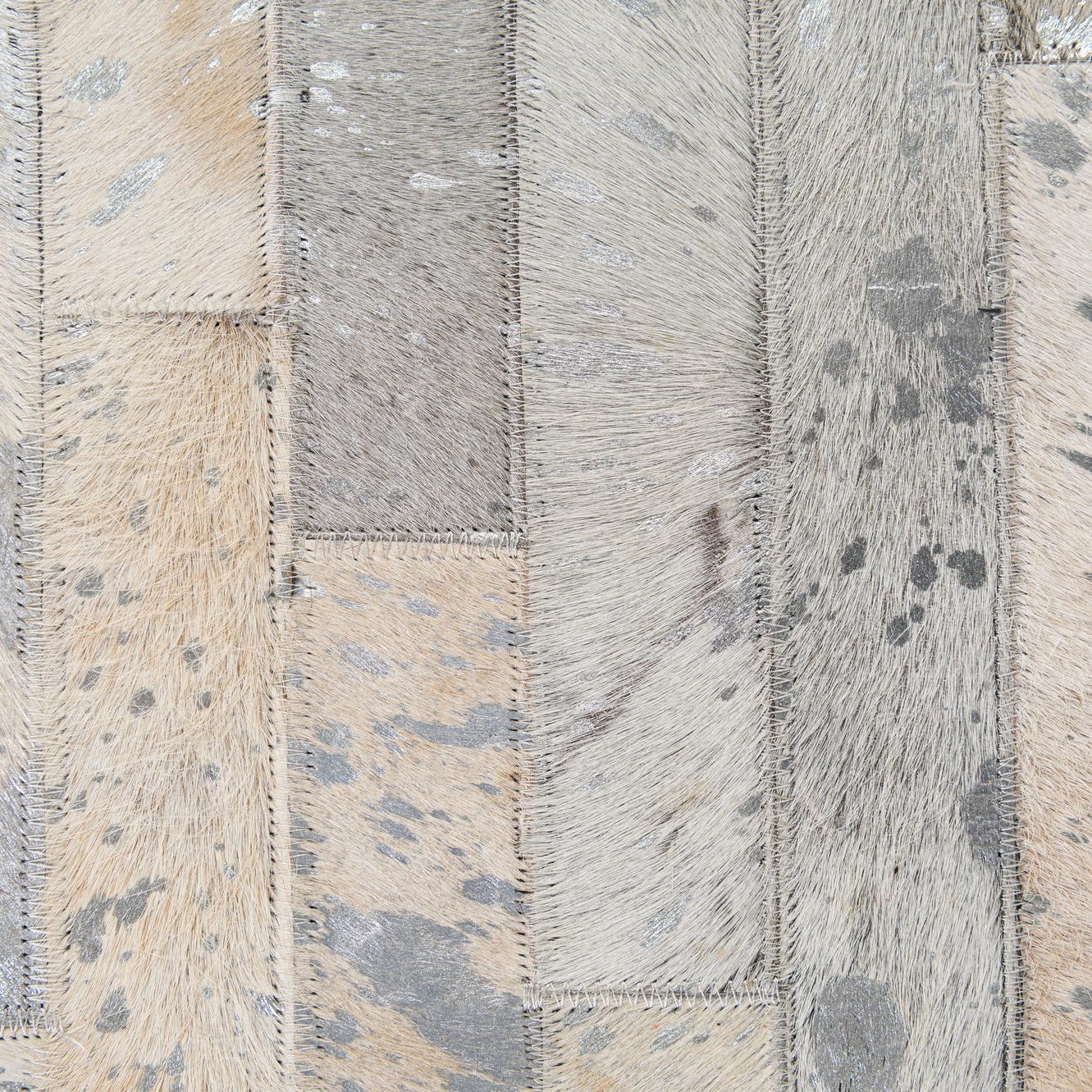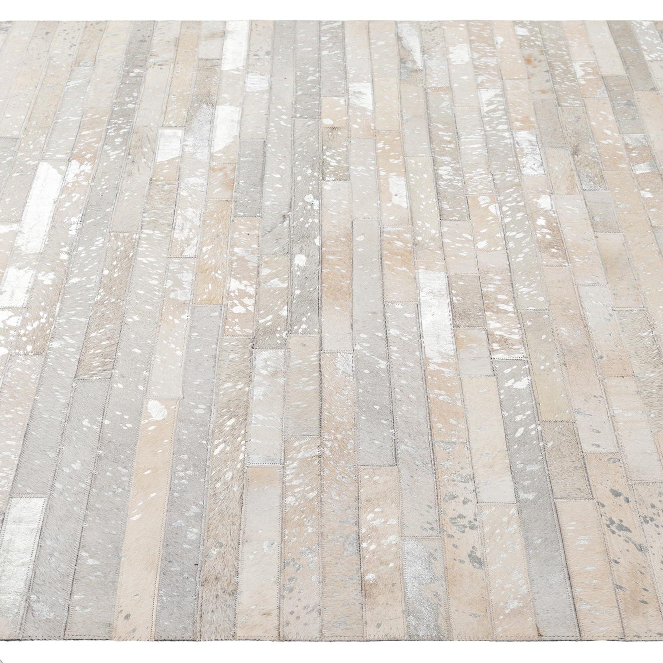 A 5x8 rectangular Cowhide Patchwork rug featuring varying shades of gray and silver stripes, perfect for a modern living room.