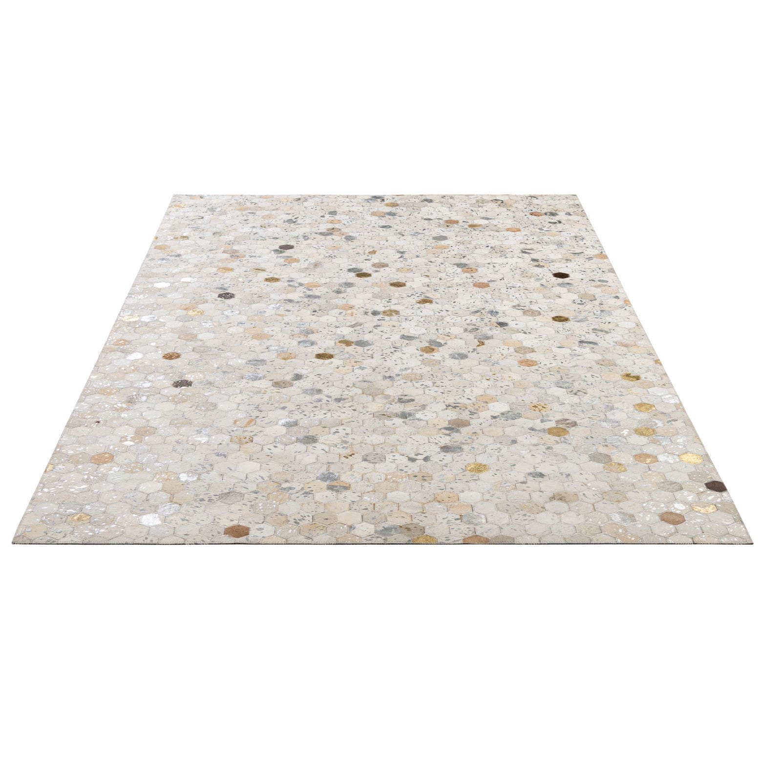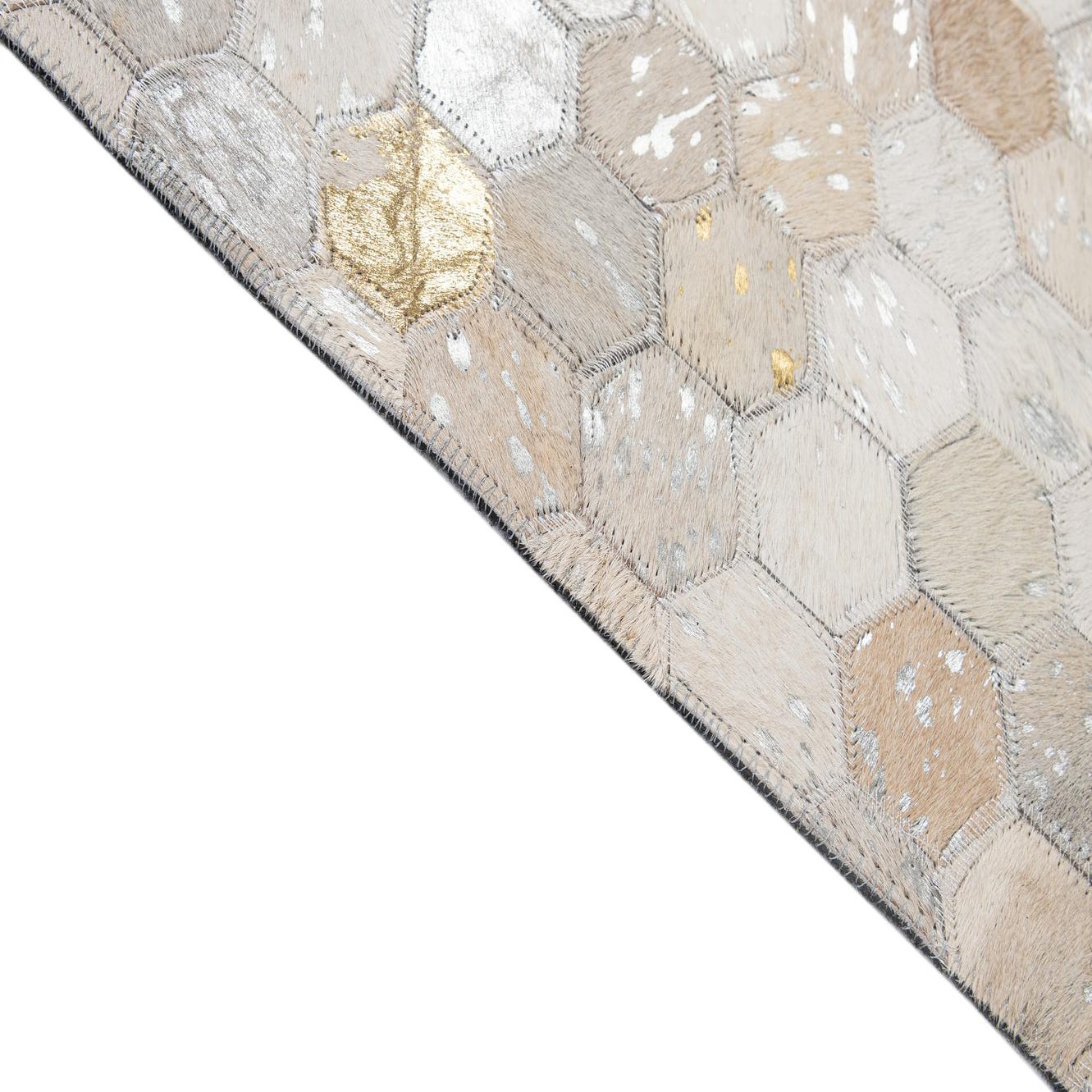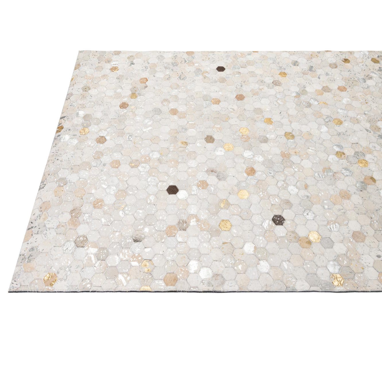 A tight patchwork of small hexagons creates a refined geometric field on a light gray ground. Handmade of cowhide and leather, each hexagon carries natural variation in tone and texture—ivory and beige panels sit beside light brown patches, while selective silver and gold leather accents add a restrained metallic flash. The hair-on-hide surface feels supple underfoot and the hand-stitched joins provide a slight, tactile relief that reads as craft rather than pattern alone.