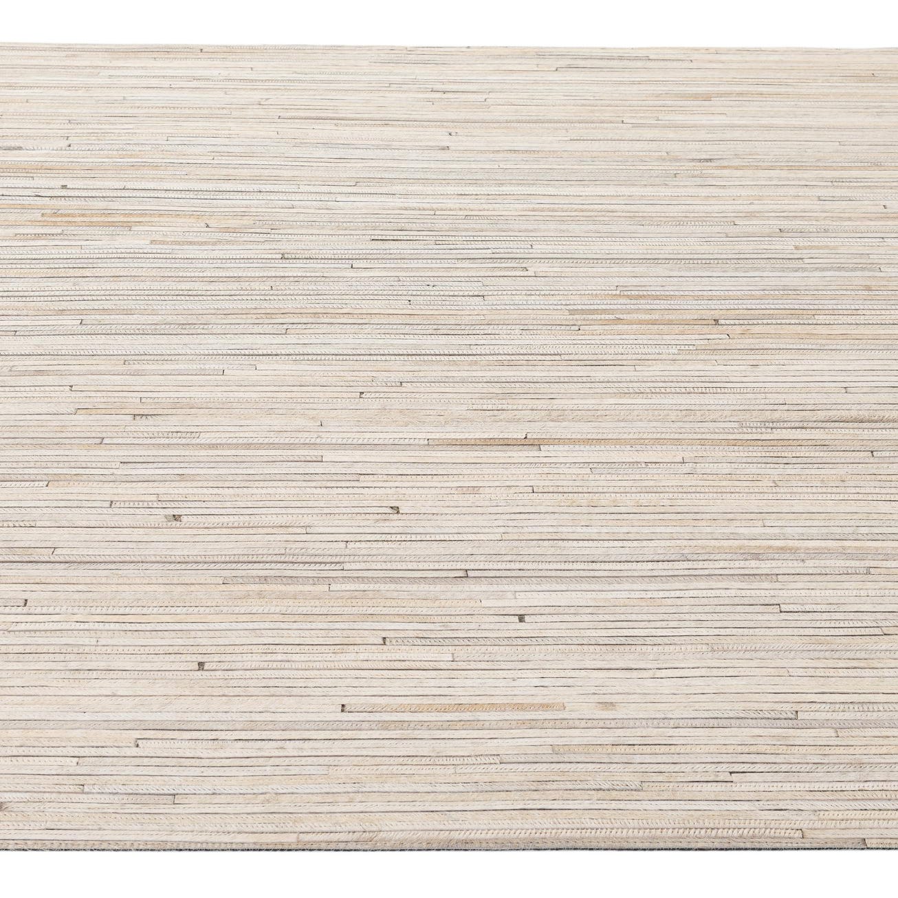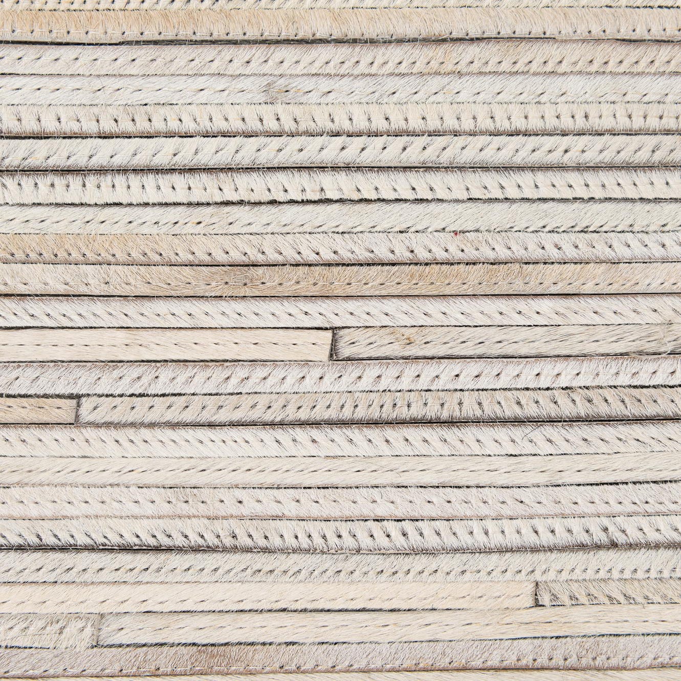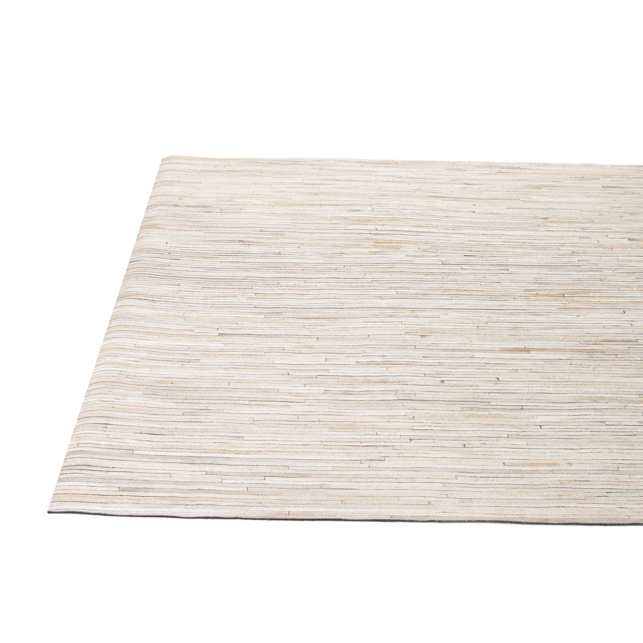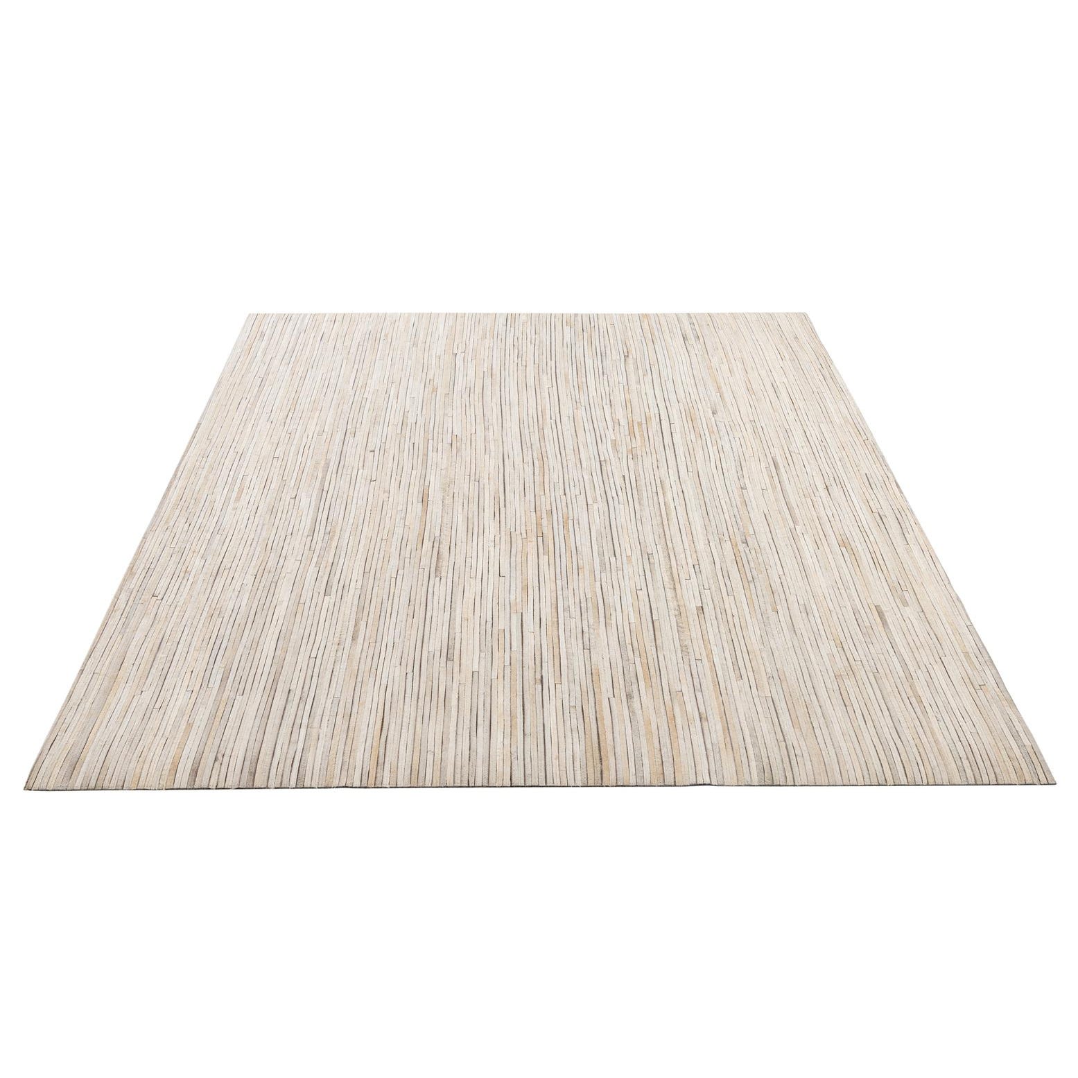 A 5x8 rectangular Cowhide Patchwork rug in varying shades of gray and silver, featuring a modern stripe pattern.
