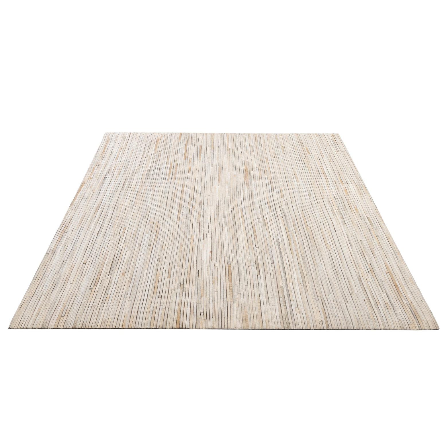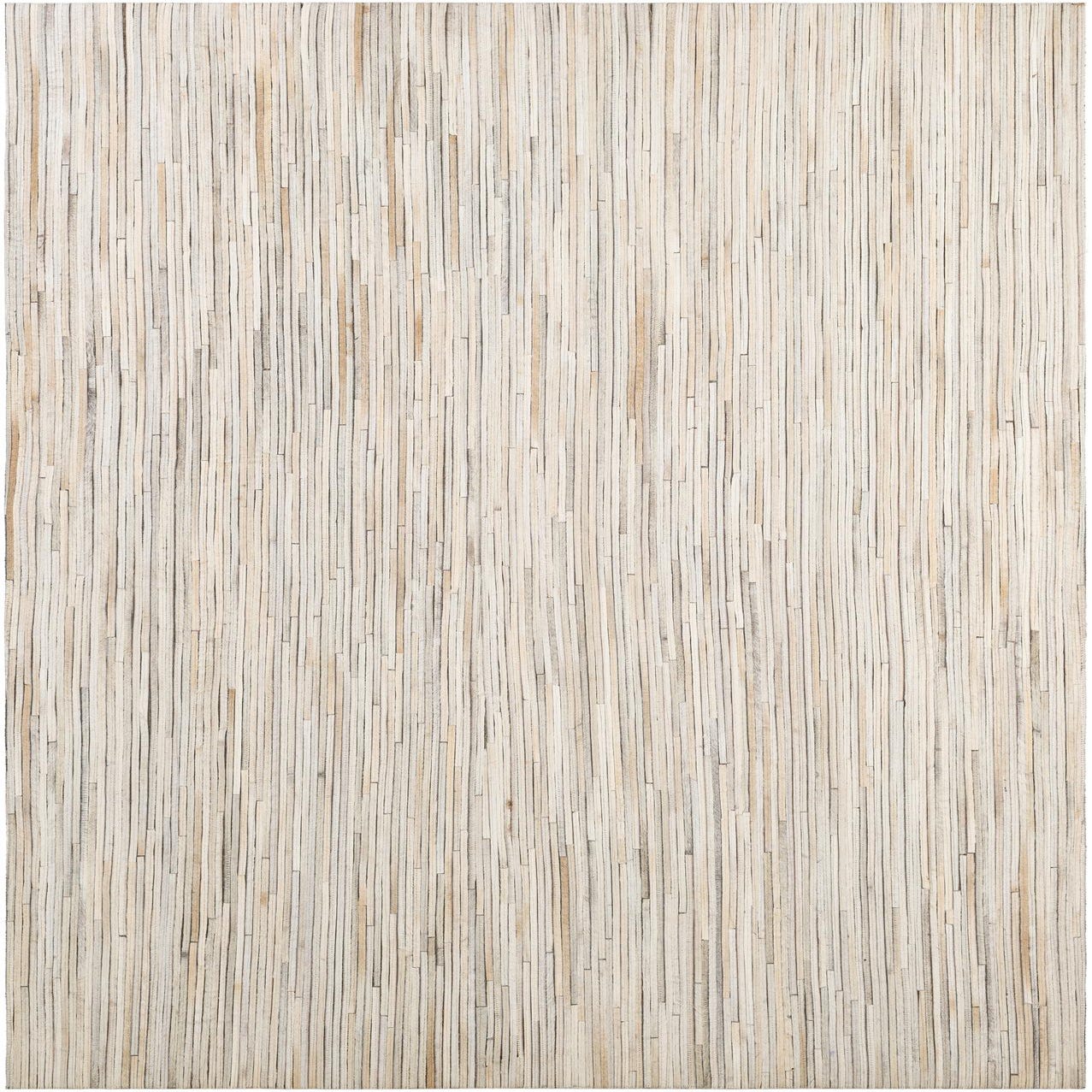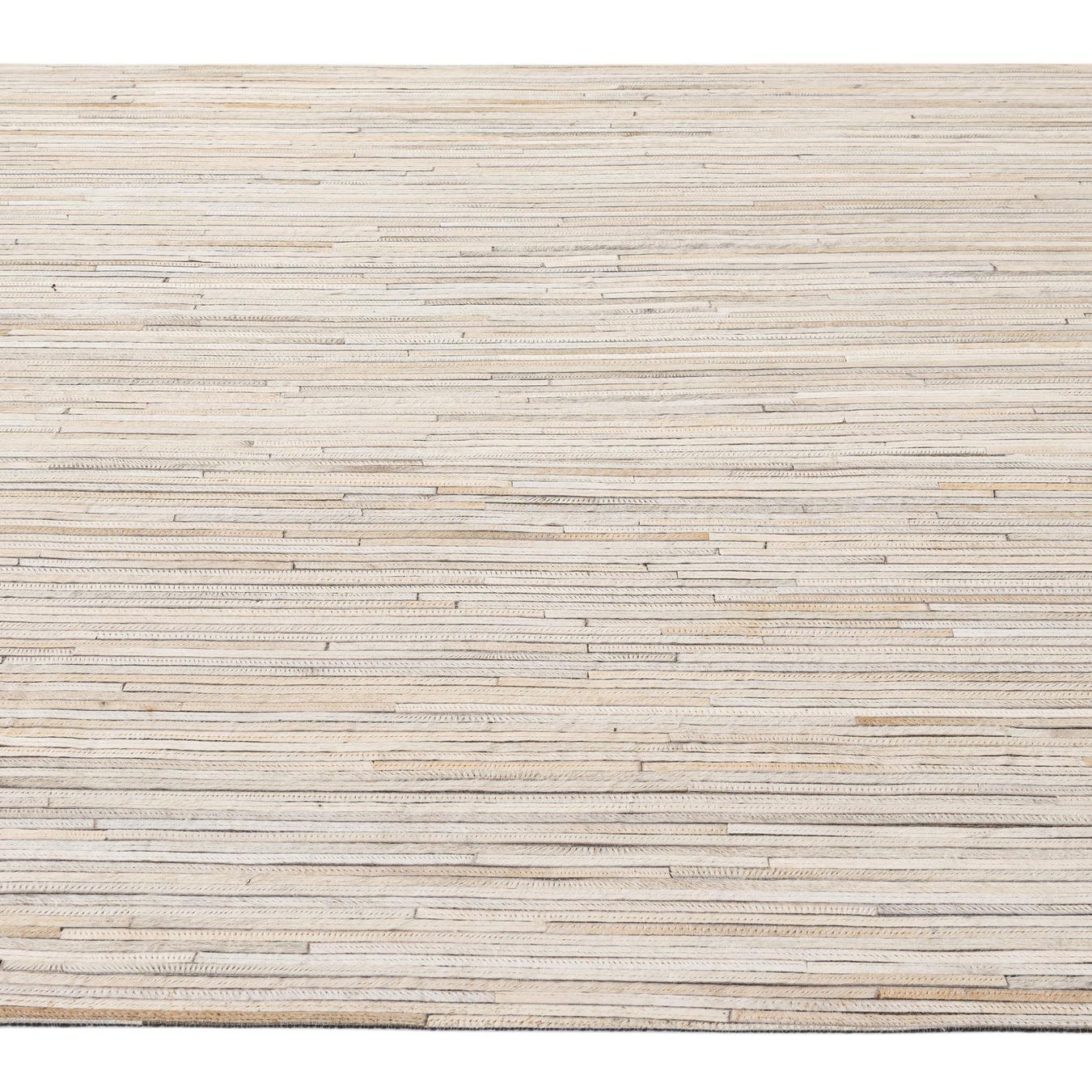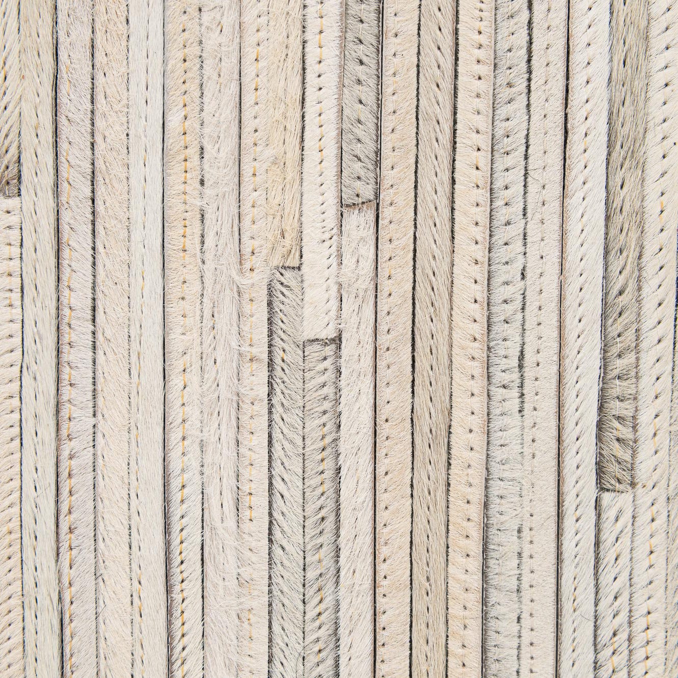A 5x8 rectangular Cowhide Patchwork rug in shades of gray and silver, featuring a modern stripe pattern, ideal for a living room or bedroom.