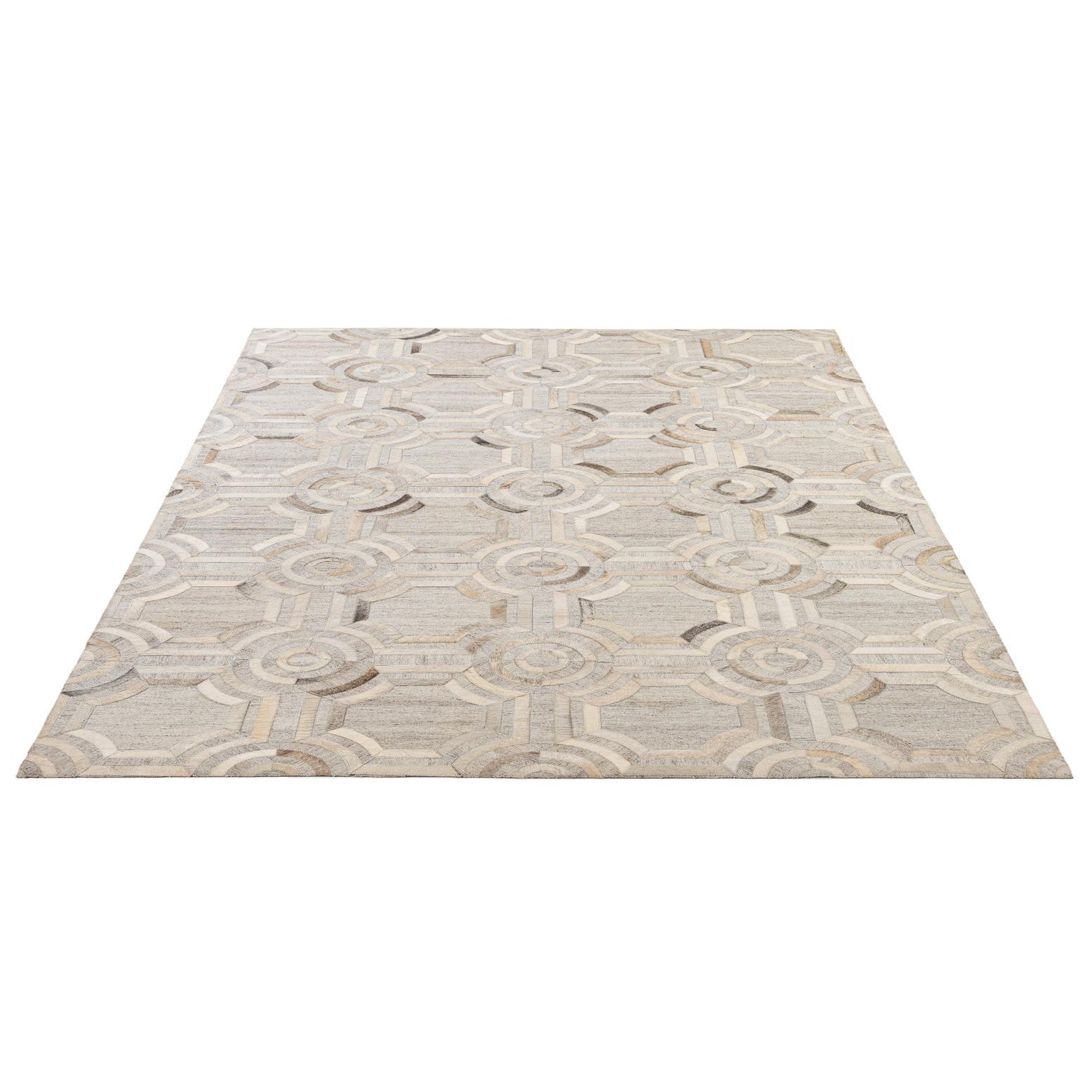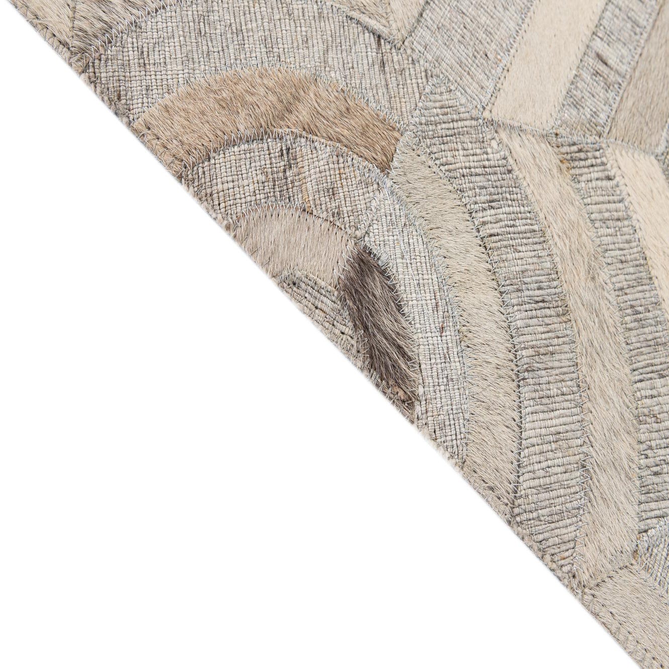 A 5x8 rectangular gray modern rug with a geometric patchwork pattern of cowhide and leather, ideal for a living room.