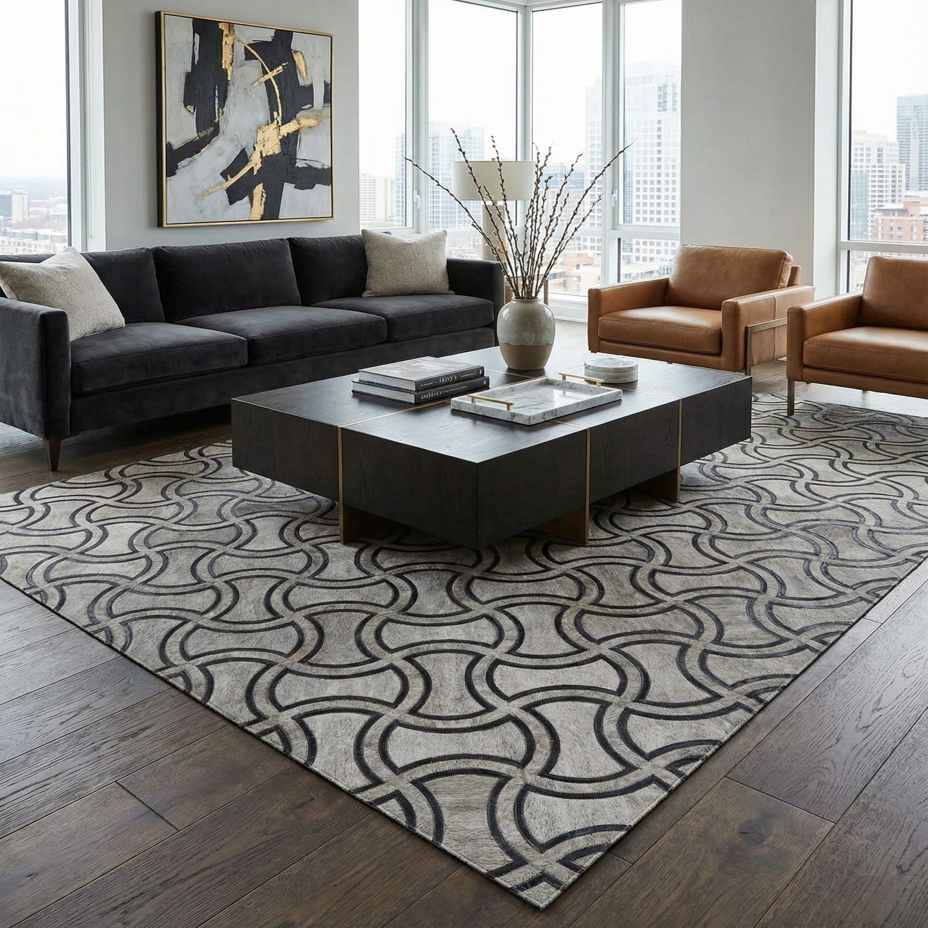 A modern geometric pattern of overlapping arcs forms a linked circular motif across a light gray hair-on-hide field. Black leather inlays trace double-lined curves that create a rhythmic, graphic lattice; the strong contrast between the light gray background and the black pattern gives the piece a clean, contemporary look that complements both minimalist and transitional schemes.
