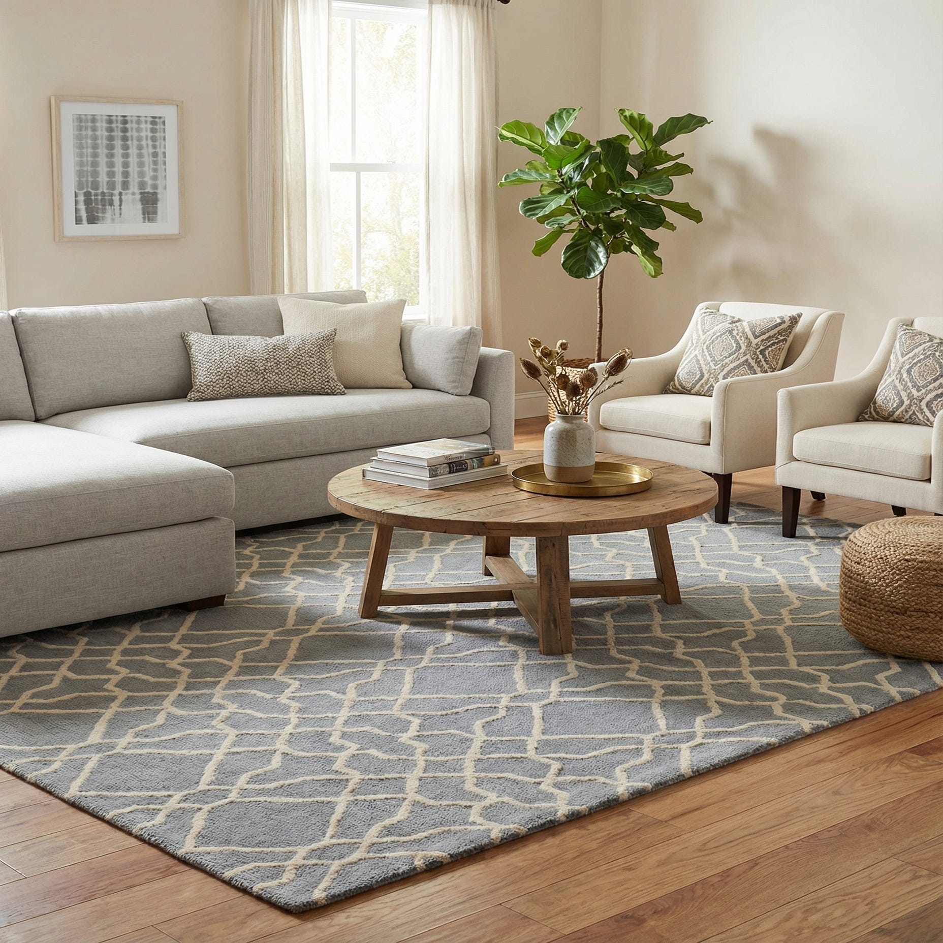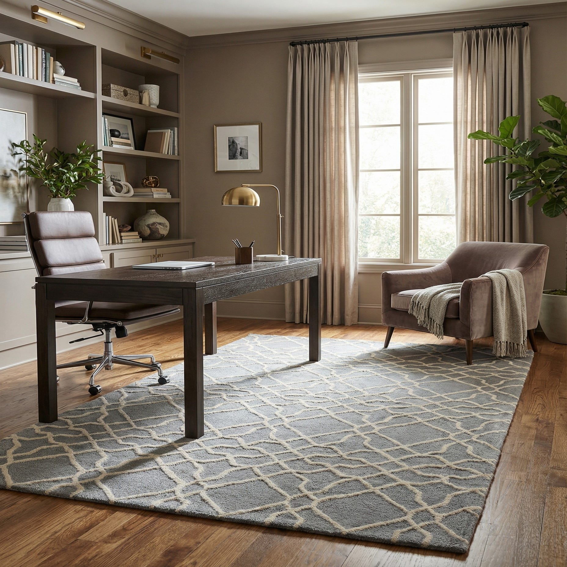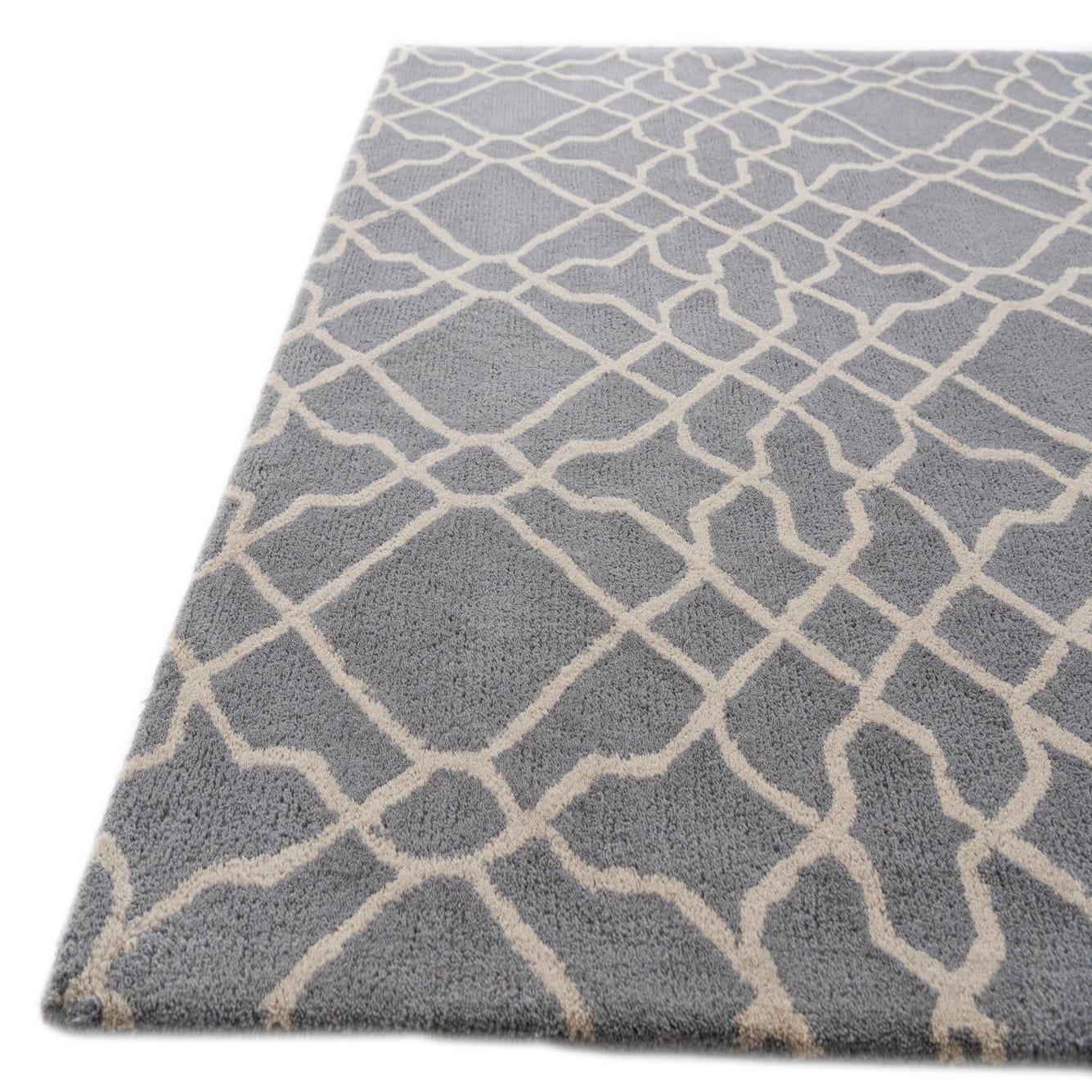 The Luna collection presents an elegant 5x8 hand-tufted rug crafted from a blend of wool and cotton, offering both durability and comfort underfoot. This piece showcases a serene light gray background, complemented by an ivory trellis pattern that creates a sense of dimension and structure. Its design is versatile, with clean lines that lend themselves to both contemporary and traditional interiors.