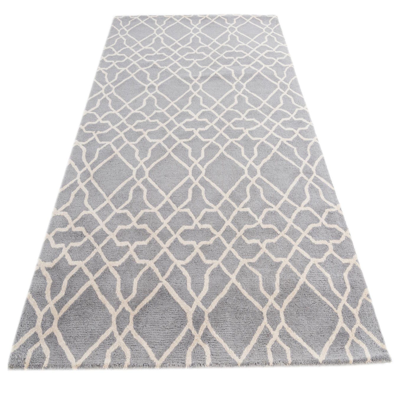 A 5x8 rectangular Luna Collection rug featuring a modern abstract trellis pattern in light gray and off-white.