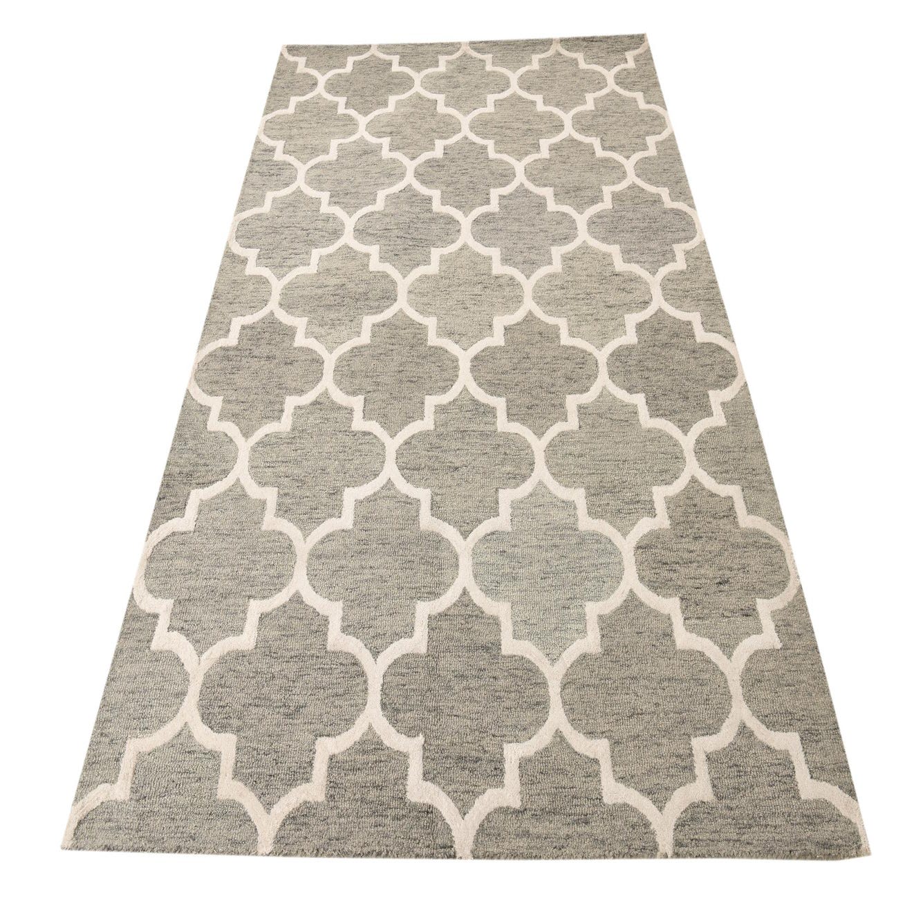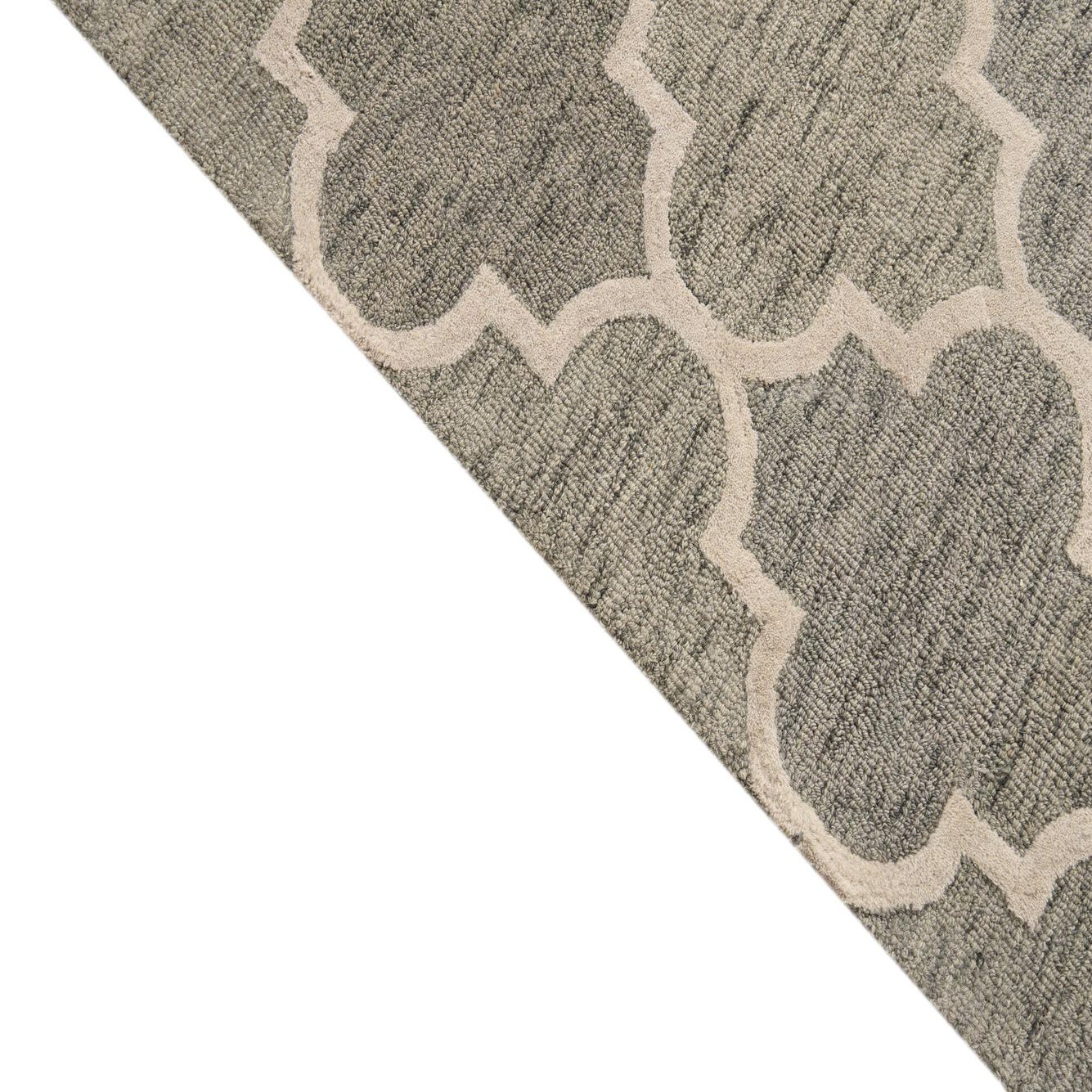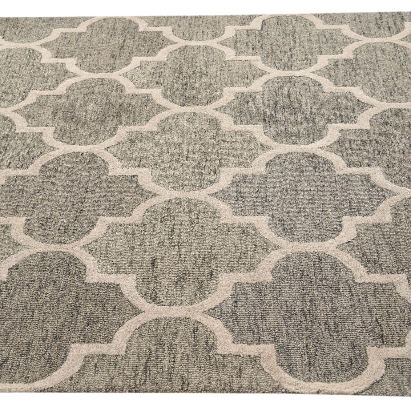 A 5x8 rectangular gray modern area rug with a repeating off-white quatrefoil pattern, made from wool and cotton.