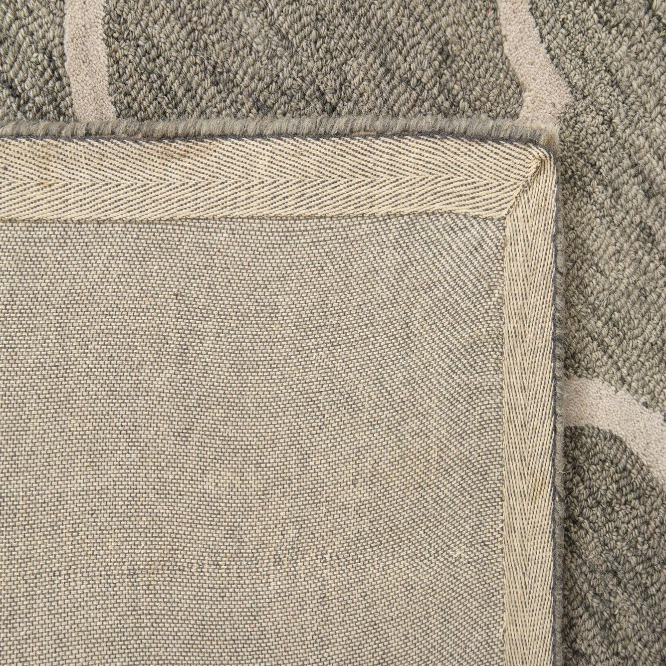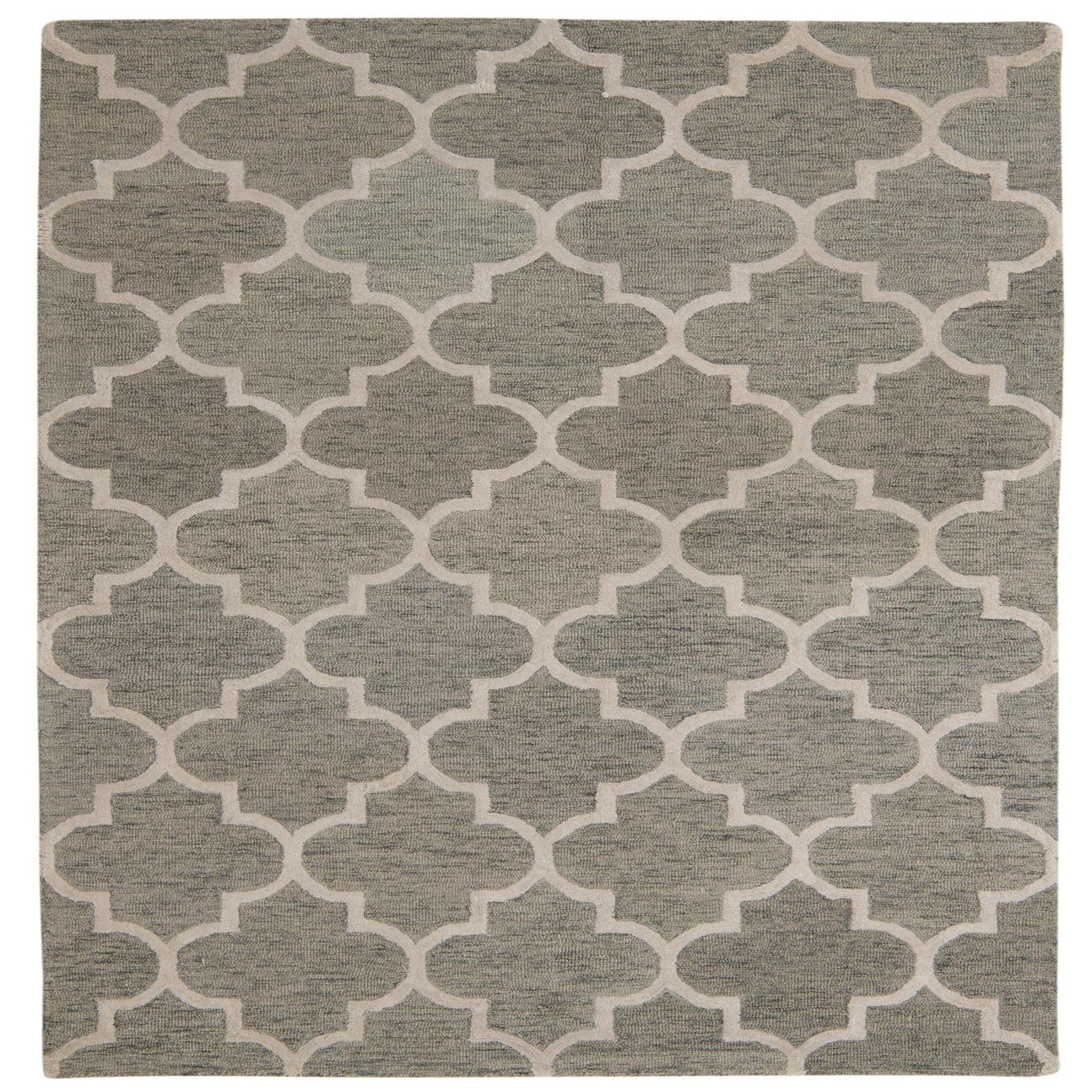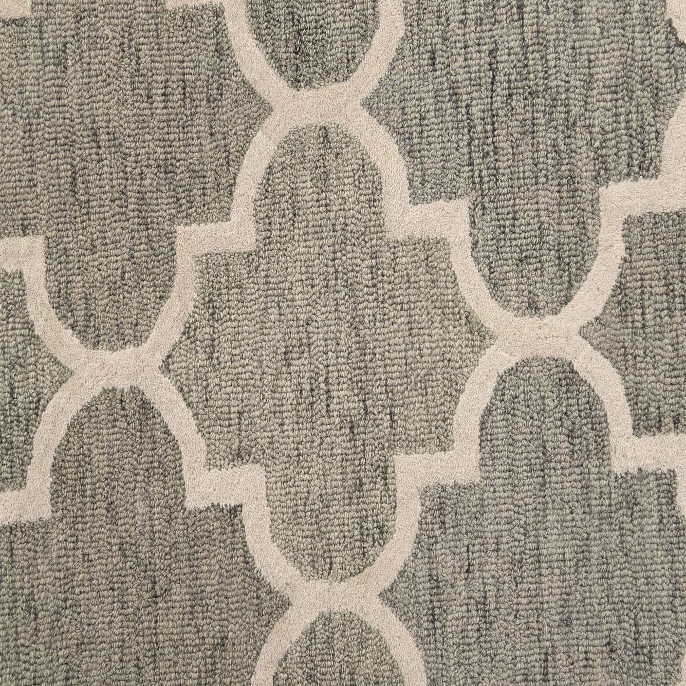 A 5x8 rectangular gray modern area rug with a repeating off-white quatrefoil pattern, made from wool and cotton.