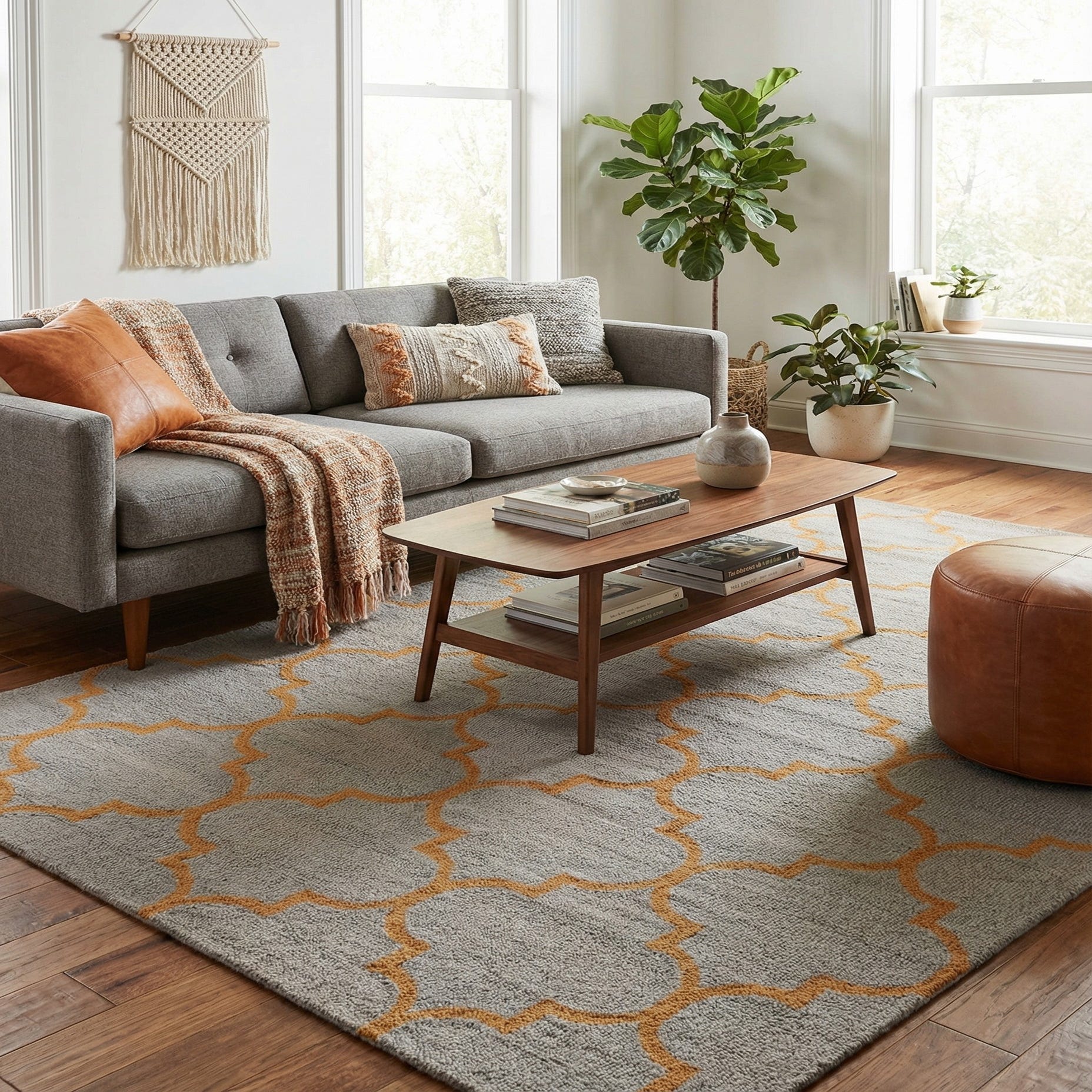A 5x8 rectangular gray area rug with a repeating orange modern quatrefoil pattern, suitable for a living room.