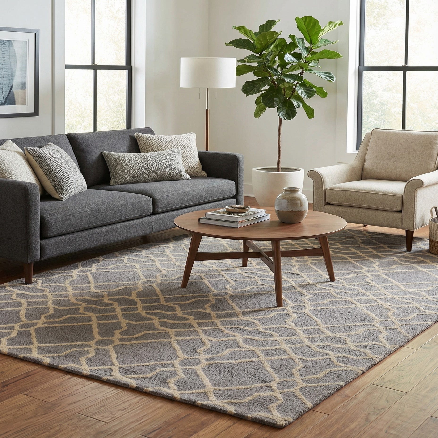 The Luna Collection presents this hand-tufted 5x8 rug, crafted with 100% wool for lasting comfort and durability. Featuring a light gray background complemented by ivory accents, the rug showcases a modern geometric lattice pattern that offers both visual interest and contemporary appeal. The well-defined trellis design is balanced with the natural texture of wool, providing a sophisticated look and a plush feel underfoot.