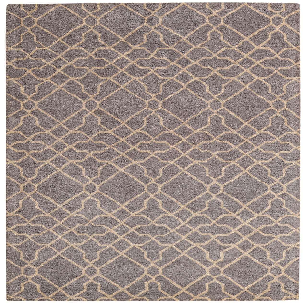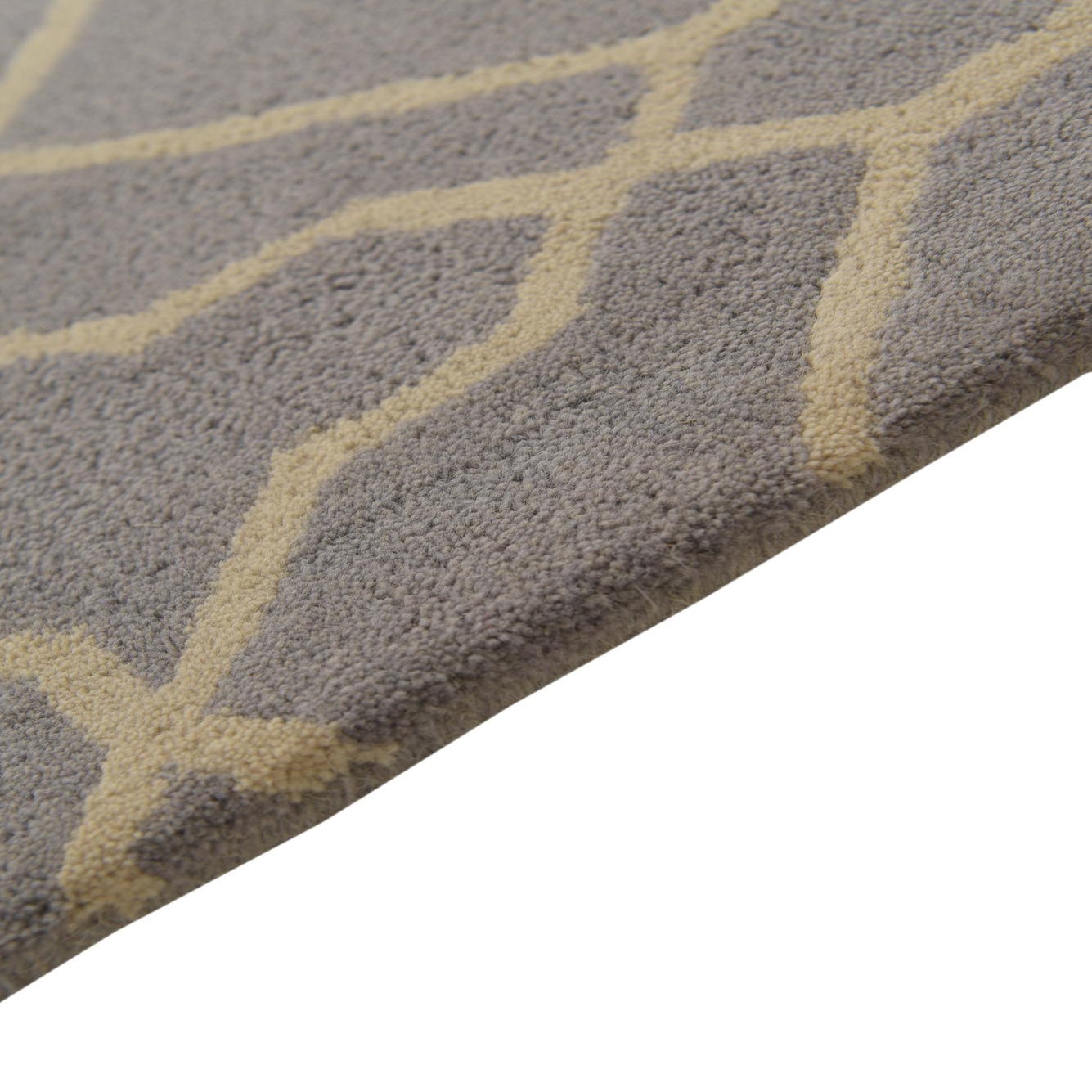 A soft light gray field provides a calm, neutral backdrop for an interlocking geometric trellis in ivory. Hand-tufted of 100% wool, the design has a subtle, tactile relief where the ivory motif rises gently above the ground, giving the surface a pleasing dimensionality. The wool pile feels warm and resilient underfoot, with a low sheen that keeps the texture looking refined and lived-in.
