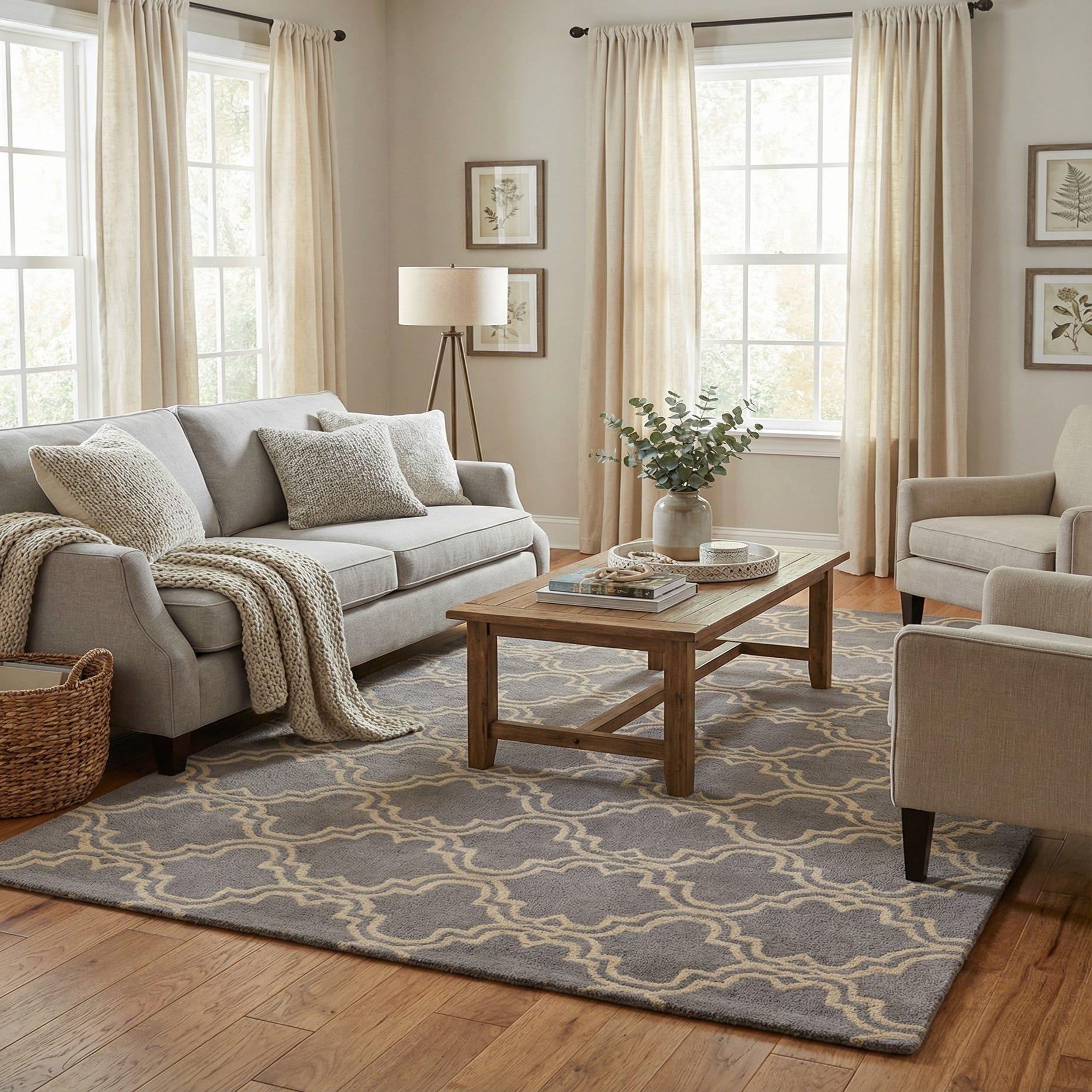 The rug's design leans towards a transitional style, where classic patterns meet contemporary color palettes, making it versatile enough to blend into a variety of interior design schemes. Its understated elegance is well-suited for modern, minimalist spaces that benefit from a touch of warmth and texture. Moreover, it can effortlessly anchor a room with a Scandinavian or chic industrial aesthetic.