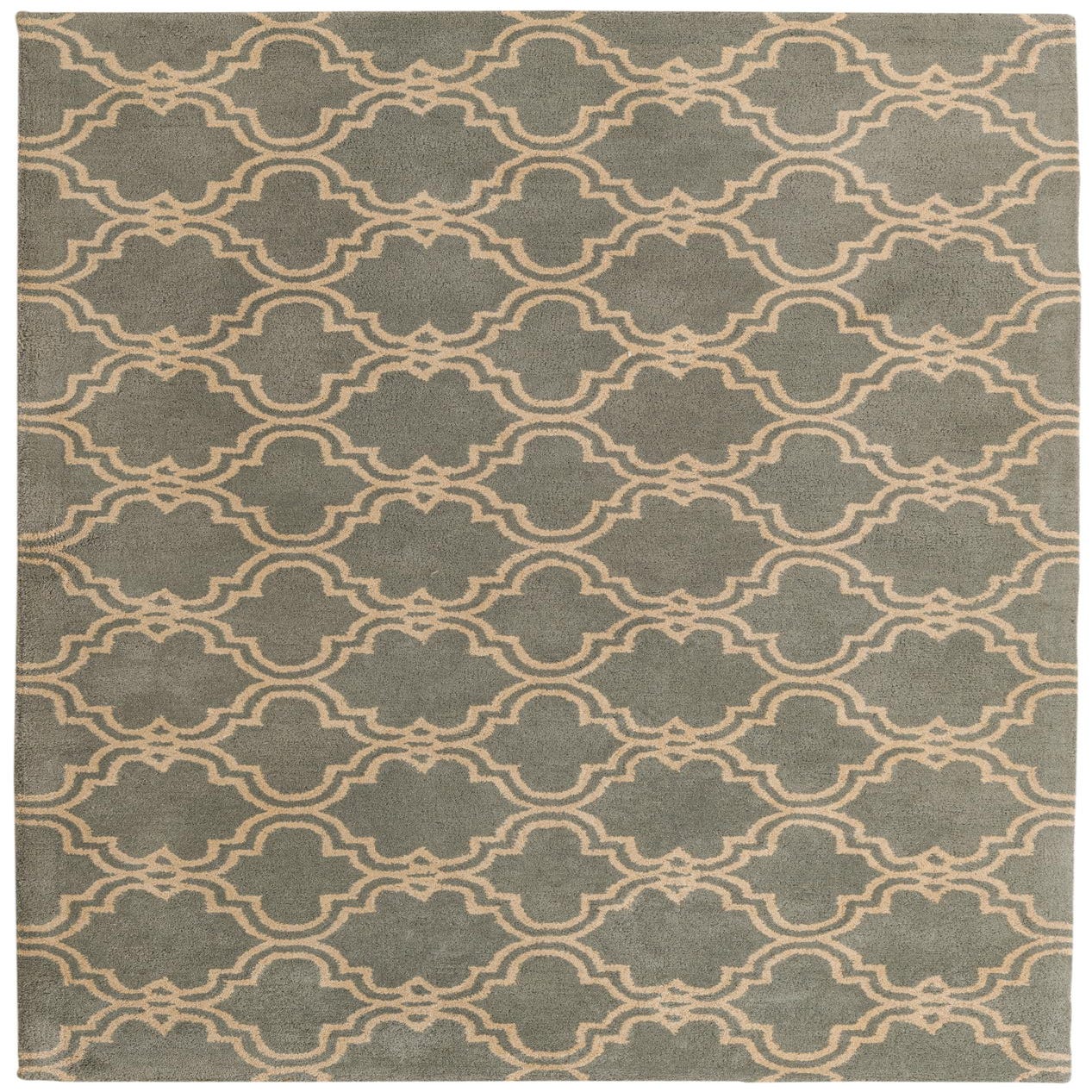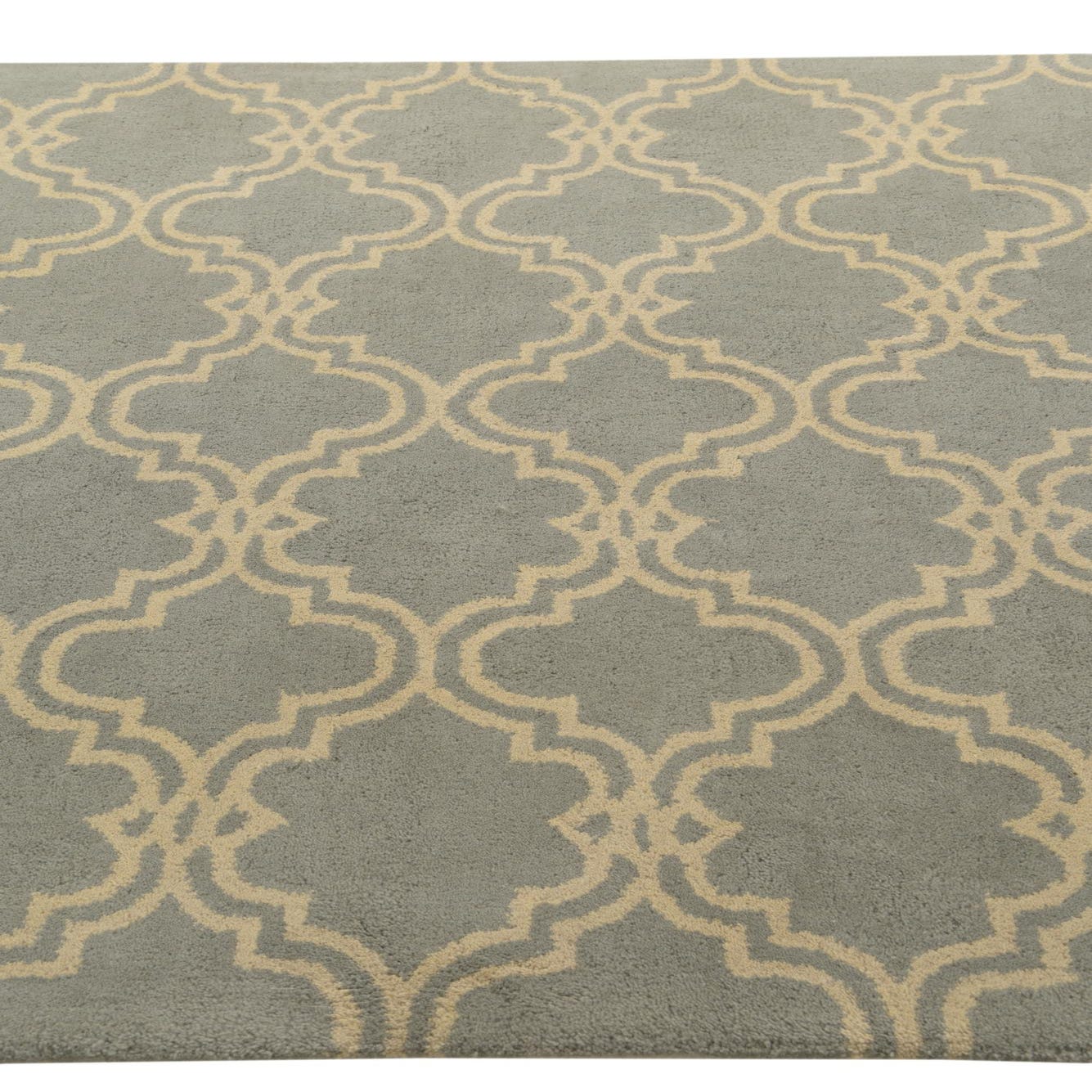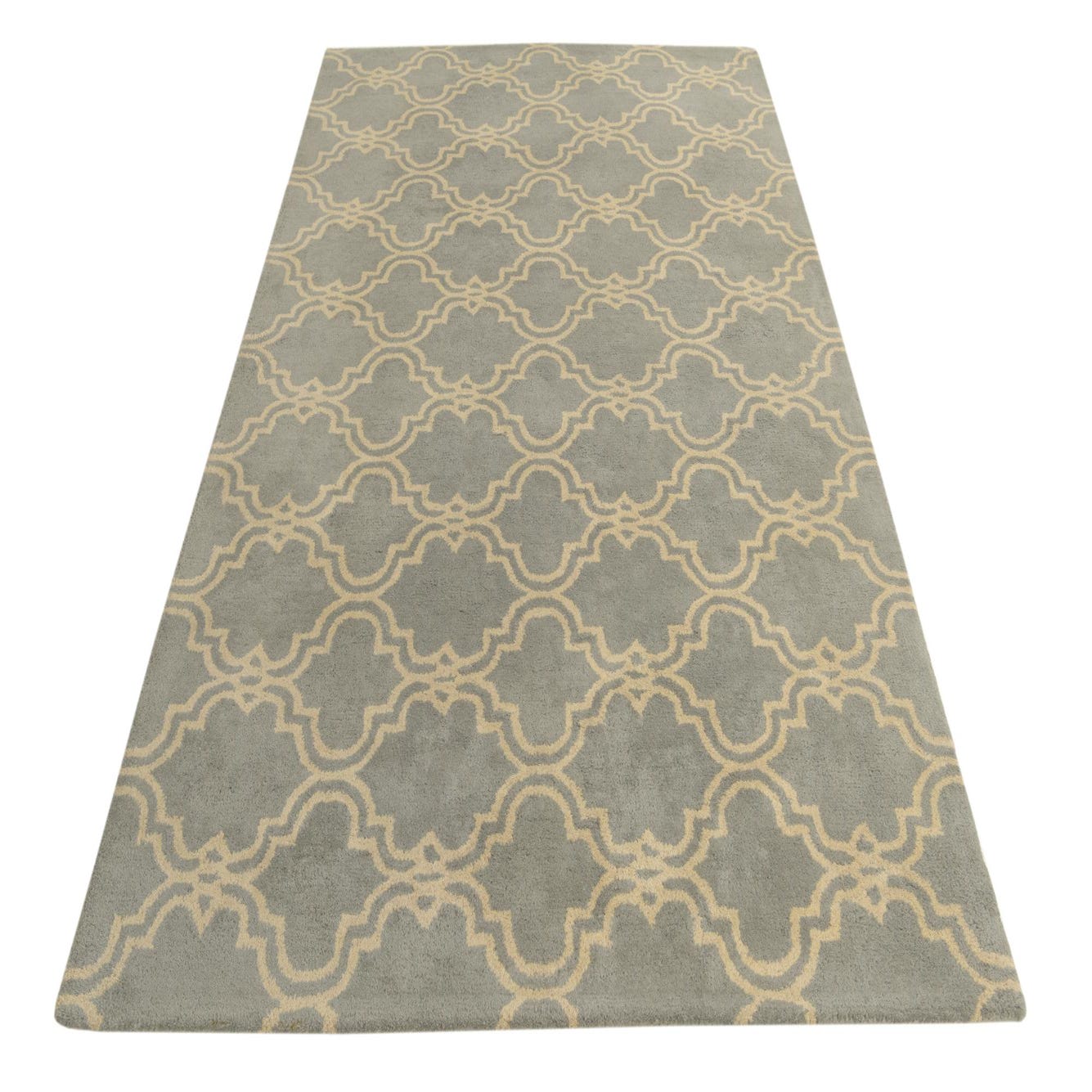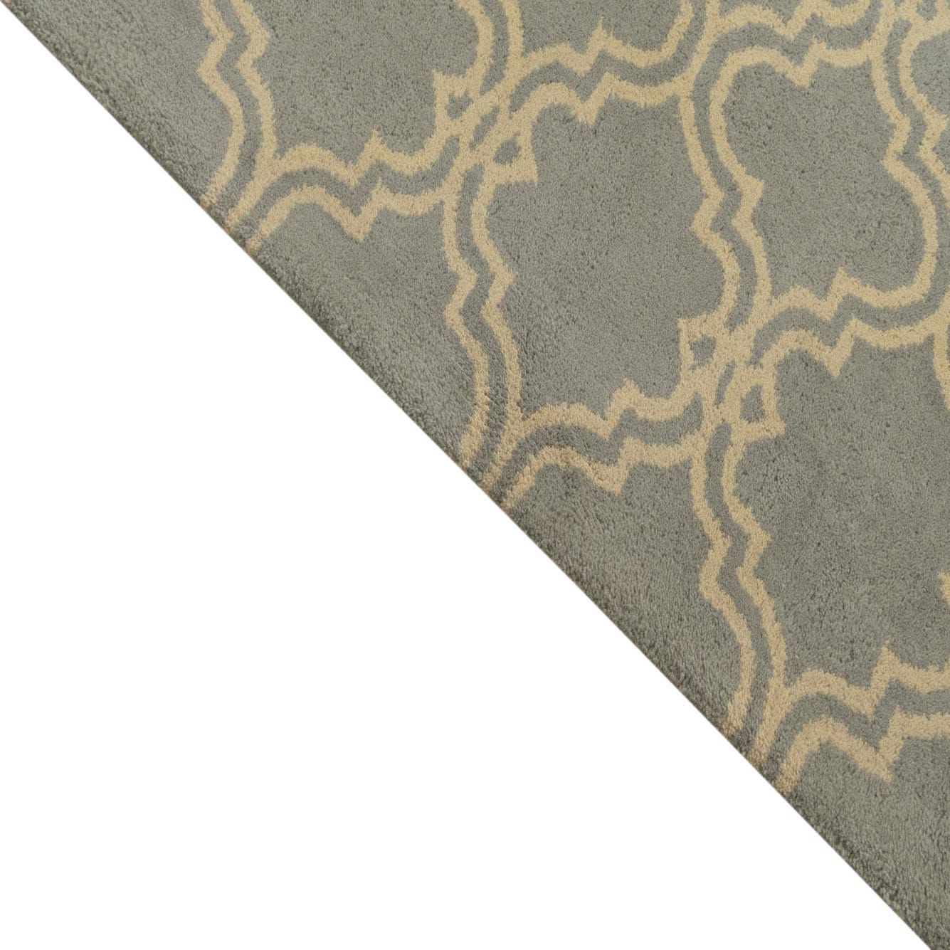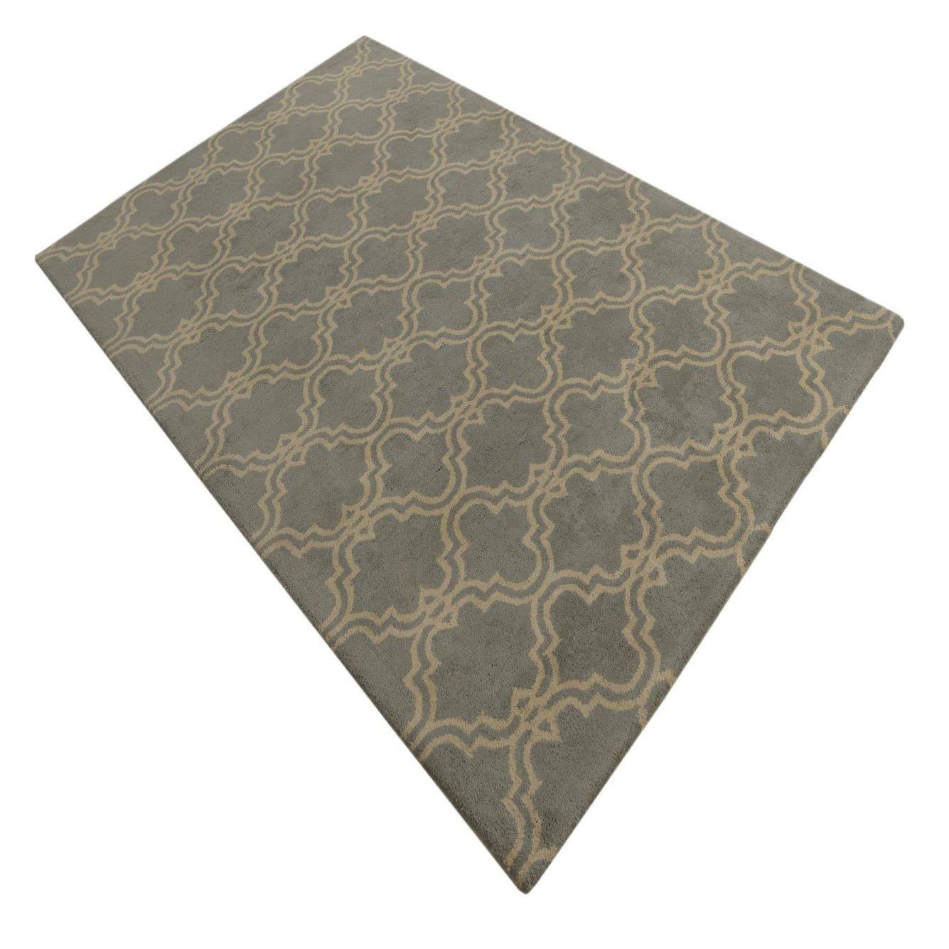 A 5x8 rectangular gray wool rug with a repeating beige modern abstract quatrefoil pattern, suitable for a living room.