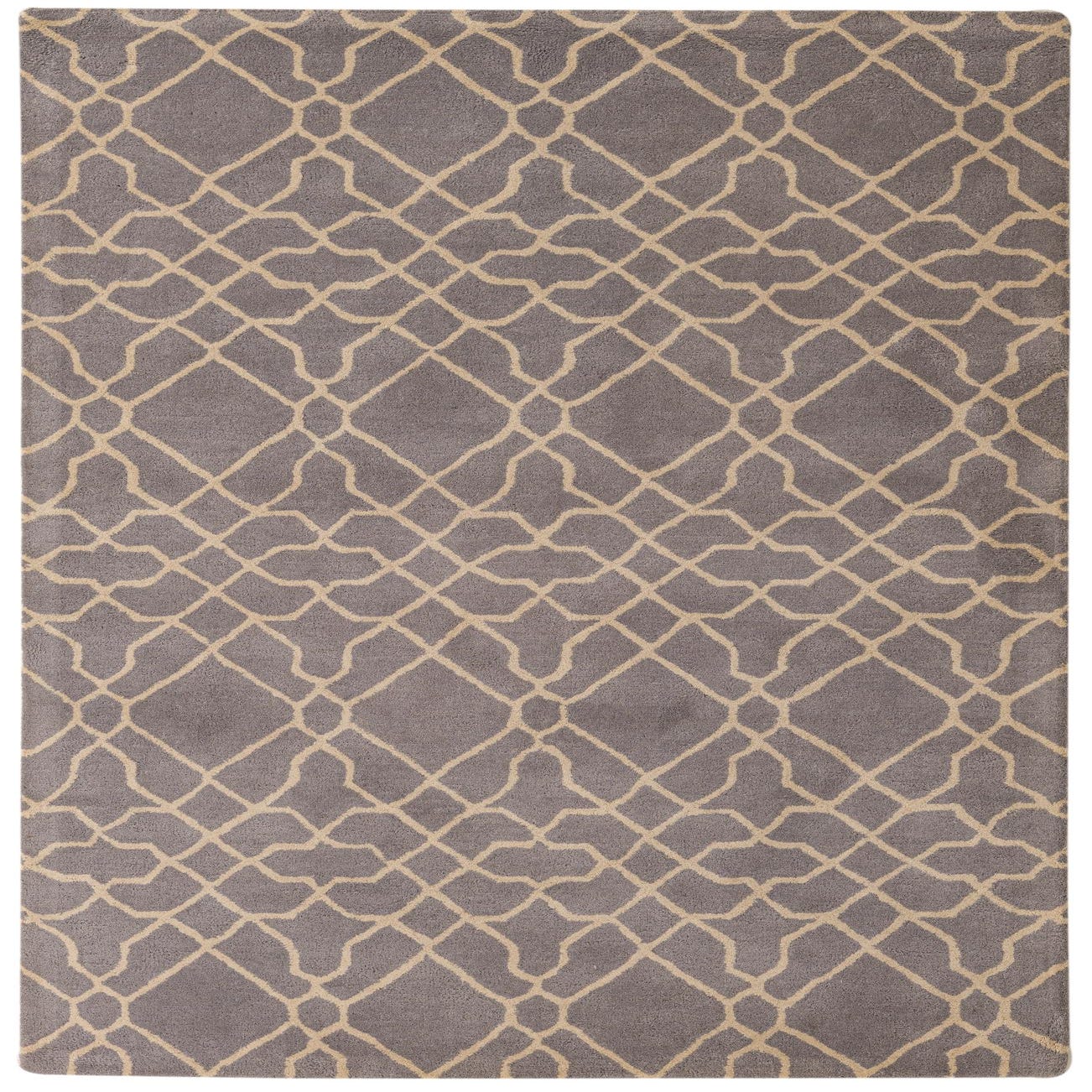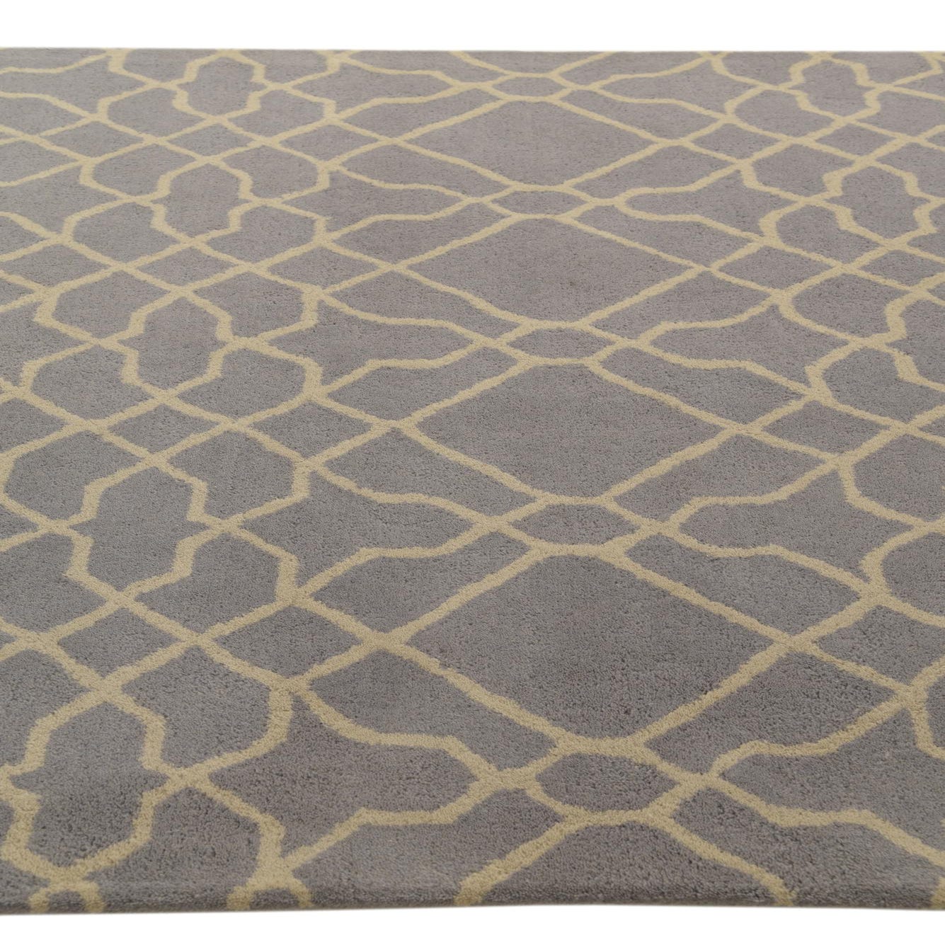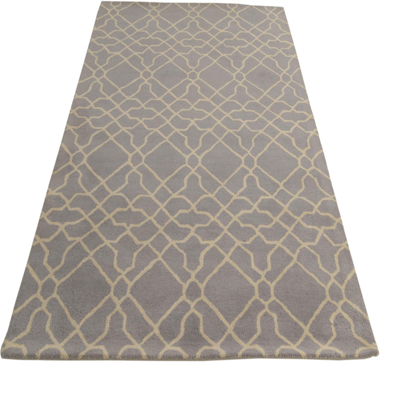 A 5x8 rectangular gray wool rug with a high pile, featuring a modern abstract geometric pattern in light beige.