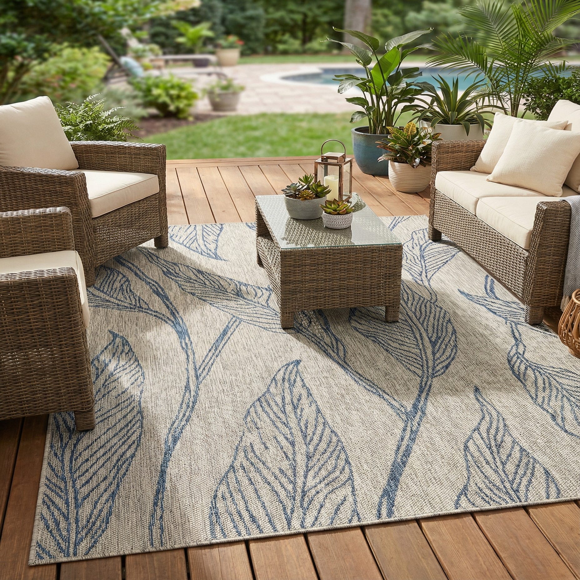 This piece works well in covered outdoor rooms, sunrooms, or busy indoor spaces like kitchens and family rooms. Pair it with natural wood furniture, linen upholstery and navy or neutral accents for a relaxed coastal or transitional vibe, or use it to add pattern to a modern farmhouse or Scandinavian setting. It can anchor a dining area, define a conversation grouping, or be layered over a larger neutral rug to introduce gentle movement and visual interest.