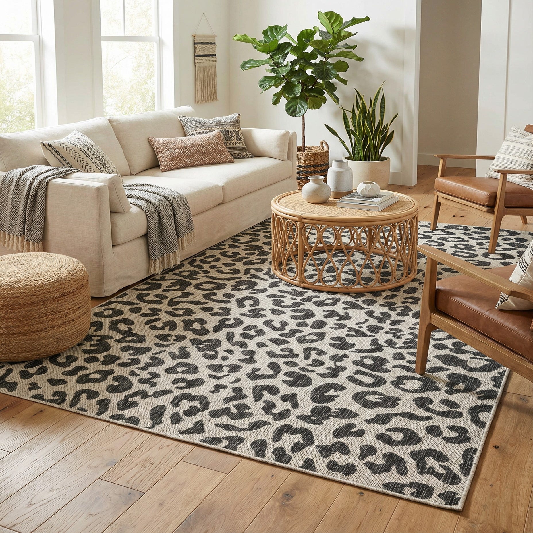 A bold animal-print pattern in gray spots crosses a light gray background to create a modern, nature-inspired look. The irregular leopard motifs are evenly spaced for a balanced, allover design that reads contemporary without being loud. The surface has a low-profile, tightly woven feel with a subtle ribbed texture you can see and feel underfoot, giving the piece visual depth while keeping a clean silhouette.