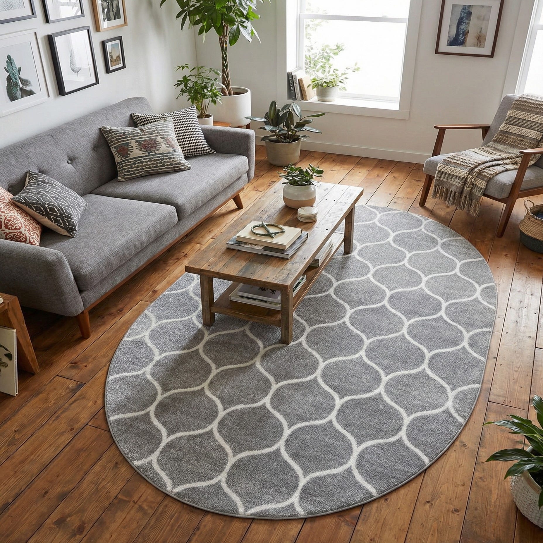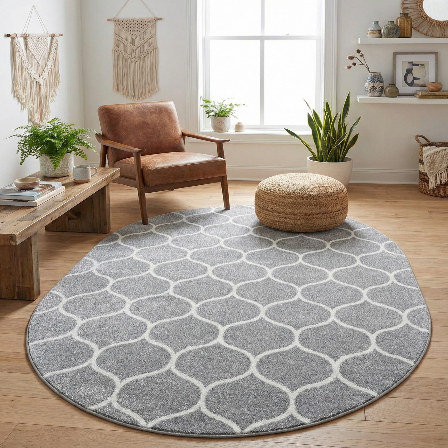 Machine-made from 100% polypropylene, this oval rug pairs a light gray background with an ivory interlocking lattice pattern that reads both modern and understated. The ivory motif is slightly raised against a low-profile pile, giving a gentle texture you can feel beneath your feet while maintaining a smooth, even surface. The cool light gray field has a soft, muted sheen that complements both warm and cool furnishings.