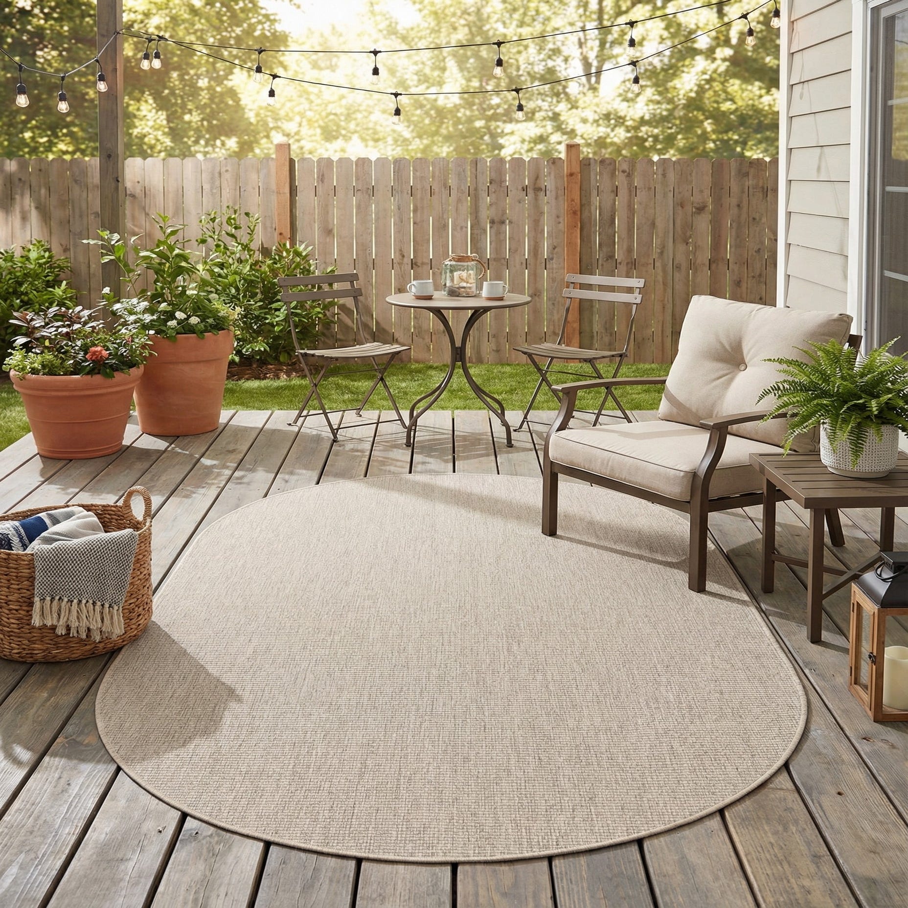 Due to its UV-resistance and stain-resistant properties, this rug is ideal for areas that are exposed to the elements or high foot traffic. The pet-friendly and shed-free nature ensures that it remains a practical choice for households with pets, providing an outdoor area that is both stylish and functional. Its oval shape offers a softening contrast to the angular lines of outdoor furniture, making it a perfect choice for patios, decks, and poolside areas. It could also serve as a transitional piece in sunrooms and covered porches, marrying indoor comfort with outdoor resilience.